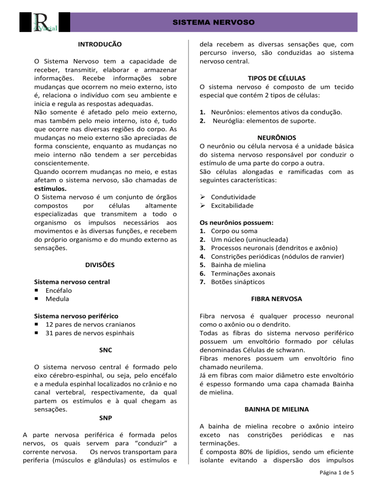 SISTEMA NERVOSO INTRODUCÃO O Sistema Nervoso tem a capacidade de receber, transmitir, elaborar e armazenar informações. Recebe informações sobre mudanças que ocorrem no meio externo, isto é, relaciona o indivíduo com seu ambiente e inicia e regula as respostas adequadas. Não somente é afetado pelo meio externo, mas também pelo meio interno, isto é, tudo que ocorre nas diversas regiões do corpo. As mudanças no meio externo são apreciadas de forma consciente, enquanto as mudanças no meio interno não tendem a ser percebidas conscientemente. Quando ocorrem mudanças no meio, e estas afetam o sistema nervoso, são chamadas de estímulos. O Sistema nervoso é um conjunto de órgãos compostos por células altamente especializadas que transmitem a todo o organismo os impulsos necessários aos movimentos e às diversas funções, e recebem do próprio organismo e do mundo externo as sensações. DIVISÕES Sistema nervoso central Encéfalo Medula Sistema nervoso periférico 12 pares de nervos cranianos 31 pares de nervos espinhais SNC O sistema nervoso central é formado pelo eixo cérebro-espinhal, ou seja, pelo encéfalo e a medula espinhal localizados no crânio e no canal vertebral, respectivamente, da qual partem os estímulos e à qual chegam as sensações. SNP A parte nervosa periférica é formada pelos nervos, os quais servem para “conduzir” a corrente nervosa. Os nervos transportam para periferia (músculos e glândulas) os estímulos e dela recebem as diversas sensações que, com percurso inverso, são conduzidas ao sistema nervoso central. TIPOS DE CÉLULAS O sistema nervoso é composto de um tecido especial que contém 2 tipos de células: 1. Neurônios: elementos ativos da condução. 2. Neuróglia: elementos de suporte. NEURÔNIOS O neurônio ou célula nervosa é a unidade básica do sistema nervoso responsável por conduzir o estímulo de uma parte do corpo a outra. São células alongadas e ramificadas com as seguintes características: Condutividade Excitabilidade Os neurônios possuem: 1. Corpo ou soma 2. Um núcleo (uninucleada) 3. Processos neuronais (dendritos e axônio) 4. Constrições periódicas (nódulos de ranvier) 5. Bainha de mielina 6. Terminações axonais 7. Botões sinápticos FIBRA NERVOSA Fibra nervosa é qualquer processo neuronal como o axônio ou o dendrito. Todas as fibras do sistema nervoso periférico possuem um envoltório formado por células denominadas Células de schwann. Fibras menores possuem um envoltório fino chamado neurilema. Já em fibras com maior diâmetro este envoltório é espesso formando uma capa chamada Bainha de mielina. BAINHA DE MIELINA A bainha de mielina recobre o axônio inteiro exceto nas constrições periódicas e nas terminações. É composta 80% de lipídios, sendo um eficiente isolante evitando a dispersão dos impulsos Página 1 de 5 SISTEMA NERVOSO elétricos. Também aumenta a velocidade de transmissão dos estímulos ao longo da fibra nervosa em um tipo de condução chamada Condução saltatória. As fibras envoltas por bainha de mielina são denominadas Fibras mielínicas, enquanto que as que não são envoltas por esta bainha são denominadas Fibras Amielínicas. No sistema nervoso central, onde não há as células de Schwann, a bainha de mielina é formada pelas células acessórias chamadas Oligodendróglias. OLIGODENDRÓGLIAS Formam a bainha de mielina no SNC (sistema nervoso central). ASTRÓCITOS São assim chamados por possuírem forma de estrela. Controlam o transporte de substâncias entre a corrente sanguínea e os neurônios. MICRÓGLIA CLASSIFICAÇÃO DOS NEURÔNIOS Sensitivos (aferentes): São neurônios que trazem impulsos da pele ou outros órgãos sensoriais para o sistema nervoso central. Motores (eferentes): São neurônios que levam impulsos do sistema nervoso central para os músculos e glândulas. Interneurônios: São neurônios que se situam inteiramente dentro do sistema nervoso central. Recebem impulsos dos neurônios sensitivos e se comunicam entre si ou com neurônios motores. ELEMENTOS NÃO NERVOSOS Vasos sanguíneos (artérias e veias) Tecido conjuntivo (areolar e adiposo) Células acessórias ou neuróglia CÉLULAS ACESSÓRIAS Células de schwann Oligodendróglias Astrócitos Micróglia Células ependimárias CÉLULAS DE SCHWANN Formam a bainha de mielina no SNP (sistema nervoso periférico). São células que tem a função de células fagocitárias. A fagocitose é o processo no qual a membrana de uma célula envolve uma partícula livre que pode ser uma fonte de nutrição ou um agente nocivo. CÉLULAS EPENDIMÁRIAS São células que revestem os ventrículos (cavidades) do encéfalo e o canal central da medula espinhal. ESTÍMULO NERVOSO A membrana celular dos neurônios possui uma característica de permeabilidade para íons e é essa propriedade que está envolvida na transmissão do estímulo nervoso. SINAPSE É a transmissão do estímulo nervoso de um neurônio ao outro. Esta transmissão é mais frequente do axônio de um neurônio aos dendritos de outro, mas também ocorrem outros tipos de sinapses. Os axônios possuem várias ramificações cada uma delas terminando em uma expansão denominada botão sináptico. A chegada do impulso nervoso ao botão sináptico libera os neurotransmissores na fenda sináptica. No caso da junção neuromuscular, este neurotransmissor é o acetilcolina com efeito excitador da fibra muscular, porém as junções axodendríticas podem conter qualquer número Página 2 de 5 SISTEMA NERVOSO de neurotransmissores com ações excitadoras e/ou inibidoras. Ponte RECEPTORES SENSORIAIS Rombencéfalo Um receptor é uma terminação periférica de um neurônio sensorial, ou uma estrutura ou órgão inervado por um neurônio sensorial que é sensível a um determinado estímulo. Há 2 tipos de receptores. Cerebelo CÉREBRO Sentidos gerais distribuídos pelo corpo. 1. Dor 2. frio /calor 3. Tato 4. Pressão 5. Sentido cinestésico Rece