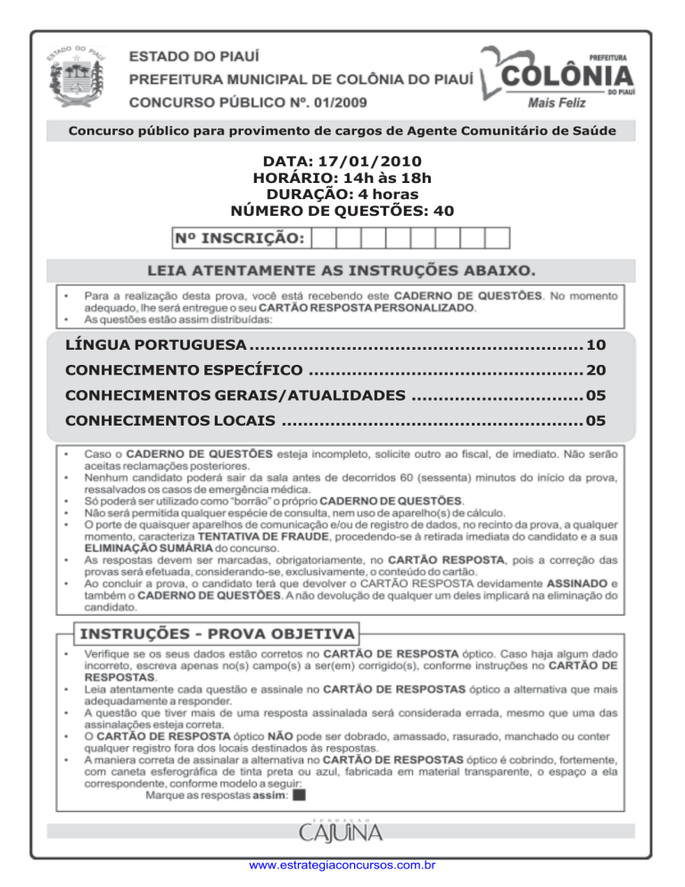 Concurso público para provimento de cargos de Agente Comunitário de Saúde DATA: 17/01/2010 HORÁRIO: 14h às 18h DURAÇÃO: 4 horas NÚMERO DE QUESTÕES: 40 LÍNGUA PORTUGUESA .............................................................. 10 CONHECIMENTO ESPECÍFICO ................................................... 20 CONHECIMENTOS GERAIS/ATUALIDADES ................................ 05 CONHECIMENTOS LOCAIS ........................................................ 05 www.estrategiaconcursos.com.br ———————— PORTUGUÊS ———————— o mesmo sentido em: Texto: A casa onde moro (Airton Freire) a) Eu disse que era caro. Hoje, pela manhã, Veio um jovem vaqueiro me falar “Em arrumá uns trocado, mode comprá um terno de couro, Mode correr gado na folia de vaqueiro.” Perguntou-me se “pudia trazer o animá mode ser abençoado.” Disse ainda que esse dinheiro iria ser pago com “trabaio”, Que o home, pra ser home, tem que suá, seja lá em que ofício for.” Eu lhe respondi que “Adispoi de comprá perneira, chapéu e jibão, Truxesse mode eu vê.” Ele entendeu minha linguagem e disse: “Tá certo.” Depois, ele me perguntou se eu queria ver “As trei uvêia que tinha nacido da marrã de premera cria.” Eu disse”qui num carecia.” Ele disse “tâmo conversado.” “Me bote a benção”. Eu respondi: “Eu te abençôo Cum os pudê do Divino Pai, Do Divino Fii, Do Divino Isprito Santo.” Ele disse: “Amém. Tô sastifeito.” Depois, saiu. 01. A história contada no texto se passa: a) Na capital de um estado, entre um político e um eleitor. b) Na praia, entre um pescador e um barraqueiro. c) No campo, entre um padre e um trabalhador local. d) No interior, entre um gerente de banco e um comerciante. 02. O jovem vaqueiro demonstra que é: a) Honesto, porque promete pagar o empréstimo com trabalho. b) Convencido, porque se acha um homem trabalhador. c) Apenas um corredor de vaquejadas. d) Uma pessoa supersticiosa, porque pede para ser abençoado. 03. A escrita CORRETA da frase “As trei uvêia que tinha nacido da marrã de premera cria” é: a) As tres ovelha que tinha nacido da marrã de primeira cria. b) As três ovelhas que tinha nacido da marrã de primeira cria. c) As três ovelha que tinha nascido da marrã de primeira cria. d) As três ovelhas que tinham nascido da marrã de primeira cria. 2 04. A frase “Eu disse que num carecia” (linha 19) tem b) Eu disse que não precisava. c) Eu disse que só depois. d) Eu disse que não queria. 05. O vocabulário que NÃO tem o mesmo sentido de arrumá (linha 3) é: a) Emprestar b) Ceder c) Conseguir d) Acomodar 06. Assinale a alternativa que registra, respectivamente, os encontros vocálicos das palavras couro, abençoado e vaqueiro a) Ditongo, ditongo e tritongo b) Hiato, ditongo e tritongo c) Ditongo, hiato e ditongo d) Ditongo, ditongo e ditongo 07. No vocábulo trabalho., por ordem, há: a) Encontro consonantal e dígrafo b) Encontro consonantal e encontro consonantal c) Dígrafo e dígrafo d) Dígrafo e encontro consonantal 08. Assinale a alternativa que está ERRADA quanto à acentuação: a) Ofício b) Benção c) Amém d) Espírito 09. O vocábulo sublinhado na frase “Disse ainda que esse dinheiro iria ser pago com ‘trabaio’” é: a) Sinônimo do nome da letra S b) Parônimo de erre c) Antônimo de esta d) Homônimo do nome da letra S 10. A alternativa que registra a CORRETA divisão silábica de trouxesse e vaqueiro é: a) Trou-xes-se; va-quei-ro b) Tro-u-xe-sse; va-qu-ei-ro c) Trou-xes-se; va-que-iro d) Tro-uxes-se; va-quei-ro PREFEITURA MUNICIPAL DE COLÔNIA DO PIAUÍ-PI www.estrategiaconcursos.com.br ———— CONHECIMENTO ESPECÍFICO ———— 11. É causada pelo vírus papiloma, que se manifesta através do surgimento de verrugas, aglutinadas ou não, na região genital, tanto do homem como da mulher. É uma doença altamente contagiosa, que infecta 65% dos parceiros após o contato sexual, denominada: a) Condiloma acuminado b) Sífilis c) Herpes d) Gonorréia 12. A Sífilis também é conhecida como: a) Cancro Mole b) Cancro Duro c) Candidíase d) Crista de galo 13. É considerado o melhor método de tratamento de lixo, em relação ao meio ambiente, uma vez que diminui a quantidade de lixo enviado a aterros sanitários e reduz a necessidade de extração de mais matéria-prima diretamente da natureza. Porém, muitos materiais não podem ser reciclados continuadamente (fibras, em especial). Ao processo de reaproveitamento de material orgânico e inorgânico do lixo dá-se o nome de: a) Coleta seletiva b) Separação c) Reciclagem d) Compostagem 14. Todas são medidas profiláticas para a AIDS, EXCETO: a) Incentivar o uso de seringas e agulhas descartáveis. b) Realizar teste ELISA. c) Controlar o sangue e derivados. d) Adotar cuidados necessários na exposição ocupacional de material biológico. 15. Assinale a doença que é transmitida pelos roedores: a) Malária b) Leptospirose c) Hepatite d) Rubéola 16. A vacina aplicada em cães e gatos em postos de saúde tem por objetivo a prevenção de: a) Raiva b) Toxoplasmose c) Antraz d) Hantavírus 17. Sobre sexualidade é INCORRETO afirmar que: a) A sexualidade é um aspecto central do ser humano durante sua vida e compreende o sexo, identidades e papéis de gênero, orientação sexual, erotismo, prazer, intimidade e reprodução. b) A sexualidade se estabelece apenas no final da adolescência, os casos contrários a este são tidos como desvios da educação domiciliar. c) As desigualdades entre os gêneros e os tabus em torno da sexualidade podem agravar a disseminação do HIV/Aids. d) A gravidez precoce de uma adolescente pode limitar sua educação, restringir suas habilidades na força de trabalho e reduzir sua qualidade de vida. 18. Quanto à forma de transmissão do HIV da mãe para o filho essa transmissão pode ocorrer durante a gravidez, durante o trabalho de parto, no parto e no período pós-natal. Tem