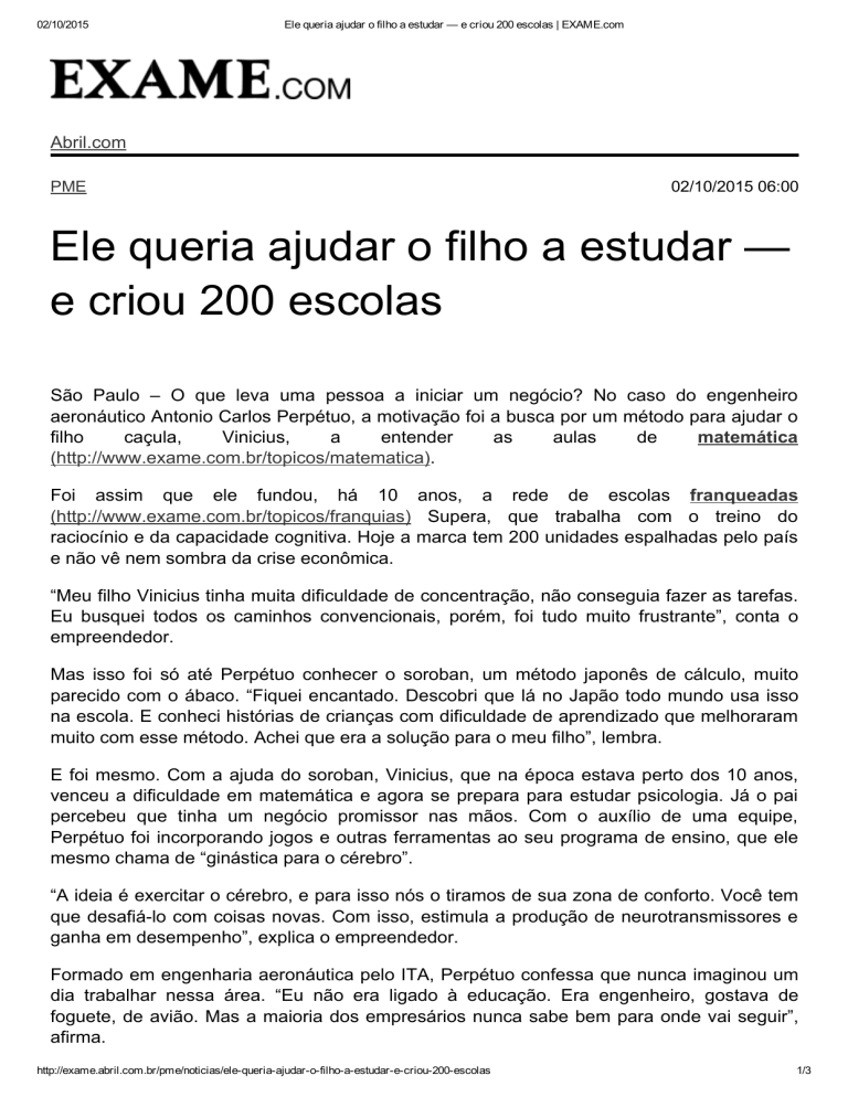 02/10/2015 Ele queria ajudar o filho a estudar — e criou 200 escolas | EXAME.com Abril.com PME 02/10/2015 06:00 Ele queria ajudar o filho a estudar — e criou 200 escolas São Paulo – O que leva uma pessoa a iniciar um negócio? No caso do engenheiro aeronáutico Antonio Carlos Perpétuo, a motivação foi a busca por um método para ajudar o filho caçula, Vinicius, a entender as aulas de matemática (http://www.exame.com.br/topicos/matematica). Foi assim que ele fundou, há 10 anos, a rede de escolas franqueadas (http://www.exame.com.br/topicos/franquias) Supera, que trabalha com o treino do raciocínio e da capacidade cognitiva. Hoje a marca tem 200 unidades espalhadas pelo país e não vê nem sombra da crise econômica. “Meu filho Vinicius tinha muita dificuldade de concentração, não conseguia fazer as tarefas. Eu busquei todos os caminhos convencionais, porém, foi tudo muito frustrante”, conta o empreendedor. Mas isso foi só até Perpétuo conhecer o soroban, um método japonês de cálculo, muito parecido com o ábaco. “Fiquei encantado. Descobri que lá no Japão todo mundo usa isso na escola. E conheci histórias de crianças com dificuldade de aprendizado que melhoraram muito com esse método. Achei que era a solução para o meu filho”, lembra. E foi mesmo. Com a ajuda do soroban, Vinicius, que na época estava perto dos 10 anos, venceu a dificuldade em matemática e agora se prepara para estudar psicologia. Já o pai percebeu que tinha um negócio promissor nas mãos. Com o auxílio de uma equipe, Perpétuo foi incorporando jogos e outras ferramentas ao seu programa de ensino, que ele mesmo chama de “ginástica para o cérebro”. “A ideia é exercitar o cérebro, e para isso nós o tiramos de sua zona de conforto. Você tem que desafiá­lo com coisas novas. Com isso, estimula a produção de neurotransmissores e ganha em desempenho”, explica o empreendedor. Formado em engenharia aeronáutica pelo ITA, Perpétuo confessa que nunca imaginou um dia trabalhar nessa área. “Eu não era ligado à educação. Era engenheiro, gostava de foguete, de avião. Mas a maioria dos empresários nunca sabe bem para onde vai seguir”, afirma. http://exame.abril.com.br/pme/noticias/ele­queria­ajudar­o­filho­a­estudar­e­criou­200­escolas 1/3 02/10/2015 Ele queria ajudar o filho a estudar — e criou 200 escolas | EXAME.com De uma coisa, porém, Perpétuo sempre soube: seu caminho era através do empreendedorismo (http://www.exame.com.br/topicos/empreendedorismo). Antes da Supera, ele já teve um carrinho de batata frita, uma rede de lojas de sapatos, e uma fábrica de foguetes agrícolas. “Tinha uma coisa dentro de mim que dizia ‘não está bom’. Eu queria montar uma coisa inovadora”, conta. Público de 4 a 101 anos E quem é que procura os cursos da Supera? “Pessoas entre 4 e 101 anos, que é a idade da nossa aluna mais velha”, brinca Perpétuo. O público da escola é composto por crianças em busca de reforço escolar, jovens que se preparam para o vestibular, adultos que estudam para concursos e idosos que querem envelhecer com a mente saudável. Com um escopo tão amplo, a empresa não tem visto os efeitos da crise econômica sobre seus números. No primeiro semestre de 2015, a rede de franquias teve um faturamento de 9,2 milhões de reais, um aumento de 61% em relação ao mesmo período do ano anterior. A expectativa é chegar a 700 unidades nos próximos cinco anos e internacionalizar a rede (já há uma unidade piloto em Portugal). Para Perpétuo, os números positivos são um reflexo da demanda reprimida por esse tipo de serviço no mercado brasileiro, especialmente no segmento de idosos, que cresce cada vez mais. “Antes as pessoas achavam que só os atletas precisavam exercitar o corpo, e hoje todo mundo vai à academia. Com os exercícios para o cérebro é a mesma coisa”, conclui. Recomendados para você PATROCINADO PATROCINADO PATROCINADO Crises Sempre Criam Oportunidades para Investir. Veja as Melhores (Empiricus) Aqui 10 truques para aprender qualquer idioma por um rapaz comum que (Babbel) aprendeu 9 Conheça o Homem que criou uma formula para você jamais esquecer Ele tem só 10 anos, mas talvez já invista melhor que você Saiba quando e como será o primeiro transplante de cabeça O maior erro que você pode cometer ao ser demitido (Vídeos ­ EXAME.com) (Vídeos ­ EXAME.com) (Vídeos ­ EXAME.com) (Curso Estudo e Memorização) Recomendado por http://exame.abril.com.br/pme/noticias/ele­queria­ajudar­o­filho­a­estudar­e­criou­200­escolas 2/3 02/10/2015 Ele queria ajudar o filho a estudar — e criou 200 escolas | EXAME.com ASSINATURAS AssineAbril.com Veja outras assinaturas, clique aqui. EXAME VEJA VOCÊ S/A Receba + 6 meses! Ganhe uma mochila! Oferta Especial! 10x R$ 44,20 8x R$ 65,00 6 x R$ 28,00 Copyright © Editora Abril S.A. ­ Todos os direitos reservados. http://exame.abril.com.br/pme/noticias/ele­queria­ajudar­o­filho­a­estudar­e­criou­200­escolas 3/3