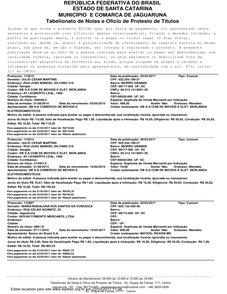 REPÚBLICA FEDERATIVA DO BRASIL ESTADO DE SANTA CATARINA MUNICÍPIO E COMARCA DE JAGUARUNA Tabelionato de Notas e Ofício de Protesto de Títulos Saibam os que virem o presente EDITAL que, por falta de pagamento, foi apresentado nesta serventia e protocolado o(s) título(s) abaixo relacionado(s), ficando o devedor intimado, a partir da publicação deste, a aceitar ou a pagar no tríduo legal (3 dias úteis), alertando-se, desde já, quanto à possibilidade de oferecimento de resposta escrita no mesmo prazo, sob pena de, em não o fazendo, ser lavrado e registrado o protesto. A presente publicação deve-se ao fato de a pessoa indicada para aceitar ou pagar ser desconhecida, sua localidade incerta, ignorada ou inacessível, ou seja residente ou domiciliada fora da circunscrição geográfica da Serventia ou, ainda, porque ninguém se dispôs a receber a intimação no endereço fornecido pelo apresentante, em conformidade com o art. 875, inciso III do CNCGJ. Protocolo: 113013 Data da publicação: 20/03/2017 Tipo: Comum Devedor: JULIO CESAR MARTINS CPF: 022.255.199-27 Endereço: RUA JOAO MANOEL SILVANO 219 Bairro: MORRO GRANDE Cidade: Sangão CEP: 88717-000 UF: SC Credor: DB S.A COM DE MOVEIS E ELET. BERLANDA CNPJ: 09.313.141/0001-39 Endereço: AV LEOBERTO LEAL, 1460 Bairro: Cidade: Curitibanos CEP:89520-000 UF: SC Número do título: 209556/5 Espécie: Duplicata de Venda Mercantil por Indicação Data de emissão: 01/08/2014 Data de vencimento: 03/05/2015 Valor: 499,50 Aceite: Não Endosso: Mandato Apresentante: DB S.A COMÉRCIO DE MÓVEIS E Credor endossante: DB S.A COM DE MOVEIS E ELET. BERLANDA ELETRODOMÉSTICOS Motivo do edital: A pessoa indicada para aceitar ou pagar é desconhecida, sua localização incerta, ignorada ou inacessível. Juros do título R$ 114,89, Selo de fiscalização Pago R$ 1,85, Liquidação após a intimação: R$ 16,50, Diligência: R$ 50,65, Condução: R$ 35,83, Edital: R$ 16,50, Total: R$ 719,22 Para pagamento no dia 21/03/2017 valor de: R$718,89 Para pagamento no dia 22/03/2017 valor de: R$719,05 Para pagamento no dia 23/03/2017 valor de: R$sem abatimento Protocolo: 113014 Data da publicação: 20/03/2017 Tipo: Comum Devedor: JULIO CESAR MARTINS CPF: 022.255.199-27 Endereço: RUA JOAO MANOEL SILVANO 219 Bairro: MORRO GRANDE Cidade: Sangão CEP: 88717-000 UF: SC Credor: DB S.A COM DE MOVEIS E ELET. BERLANDA CNPJ: 09.313.141/0001-39 Endereço: AV LEOBERTO LEAL, 1460 Bairro: Cidade: Curitibanos CEP:89520-000 UF: SC Número do título: 214451/2 Espécie: Duplicata de Venda Mercantil por Indicação Data de emissão: 01/08/2014 Data de vencimento: 10/02/2015 Valor: 70,00 Aceite: Não Endosso: Mandato Apresentante: DB S.A COMÉRCIO DE MÓVEIS E Credor endossante: DB S.A COM DE MOVEIS E ELET. BERLANDA ELETRODOMÉSTICOS Motivo do edital: A pessoa indicada para aceitar ou pagar é desconhecida, sua localização incerta, ignorada ou inacessível. Juros do título R$ 18,01, Selo de fiscalização Pago R$ 1,85, Liquidação após a intimação: R$ 16,50, Diligência: R$ 50,65, Condução: R$ 35,83, Edital: R$ 16,50, Total: R$ 192,84 Para pagamento no dia 21/03/2017 valor de: R$192,79 Para pagamento no dia 22/03/2017 valor de: R$192,82 Para pagamento no dia 23/03/2017 valor de: R$sem abatimento Protocolo: 112997 Data da publicação: 20/03/2017 Tipo: Comum Devedor: MARIA MADALENA DOS SANTOS DA CONCEICA CPF: 855.132.459-49 Endereço: RUA CELSO SCHMITZ, 23 Bairro: Cidade: Jaguaruna CEP: 88715-000 UF: SC Credor: NOVAX FOMENTO MERCANTIL LTDA CPF: Endereço: Bairro: Cidade: CEP: UF: Número do título: 0961-D Espécie: Duplicata de Venda Mercantil por Indicação Data de emissão: 07/11/2016 Data de vencimento: 10/03/2017 Valor: 900,00 Aceite: Não Endosso: Mandato Apresentante: Banco do Brasil S.A. Credor endossante: MAYKEL RICKEN ME Motivo do edital: A pessoa indicada para aceitar ou pagar é desconhecida, sua localização incerta, ignorada ou inacessível. Juros do título R$ 3,90, Selo de fiscalização Pago R$ 1,85, Liquidação após a intimação: R$ 16,50, Diligência: R$ 33,00, Condução: R$ 7,08, Edital: R$ 16,50, Total: R$ 962,33 Para pagamento no dia 21/03/2017 valor de: R$961,73 Para pagamento no dia 22/03/2017 valor de: R$962,03 Para pagamento no dia 23/03/2017 valor de: R$sem abatimento Edital recebido pelo Horário de Atendimento: 09:00h às 12:00h e 13:30h às 18:00h Tabelionato de Notas e Ofício de Protesto de Títulos - Av. Duque de Caxias, 717, Centro Jaguaruna - SC - Cep: 88715-000 - [email protected] - (48) 3624-0295 site www.ieptbsc.org.br Av. emDuque 22/03/2017 11:38 de Caxias, nº717 - Centro REPÚBLICA FEDERATIVA DO BRASIL ESTADO DE SANTA CATARINA MUNICÍPIO E COMARCA DE JAGUARUNA Tabelionato de Notas e Ofício de Protesto de Títulos Saibam os que virem o presente EDITAL que, por falta de pagamento, foi apresentado nesta serventia e protocolado o(s) título(s) abaixo relacionado(s), ficando o devedor intimado, a partir da publicação deste, a aceitar ou a pagar no tríduo legal (3 dias úteis), alertando-se, desde já, quanto à possibilidade de oferecimento de resposta escrita no mesmo prazo, sob pena de, em não o fazendo, ser lavrado e registrado o protesto. A presente publicação deve-se ao fato de a pessoa indicada para aceitar ou pagar ser desconhecida, sua localidade incerta, ignorada ou inacessível, ou seja residente ou domiciliada fora da circunscrição geográfica da Serventia ou, ainda, porque ninguém se dispôs a receber a intimação no endereço fornecido pelo apresentante, em conformidade com o art. 875, inciso III do CNCGJ. Protocolo: 113016 Data da publicação: 20/03/2017 Tipo: Comum Devedor: MILENA CRISTINA MATHEUS CPF: 106.980.209-36 Endereço: ESTRADA GERAL CAMPO BOM 1 Bairro: CAMPO BOM Cidade: Jaguaruna CEP: 88715-000 UF: SC Credor: DB S.A COM DE MOVEIS E ELET. BERLANDA CNPJ: 09.313.141/0001-39 Endereço: AV LEOBERTO LEAL, 1460 Bairro: Cidade: Curitibanos CEP:89520-000 UF: SC Número do título: 202459/7 Espécie: D