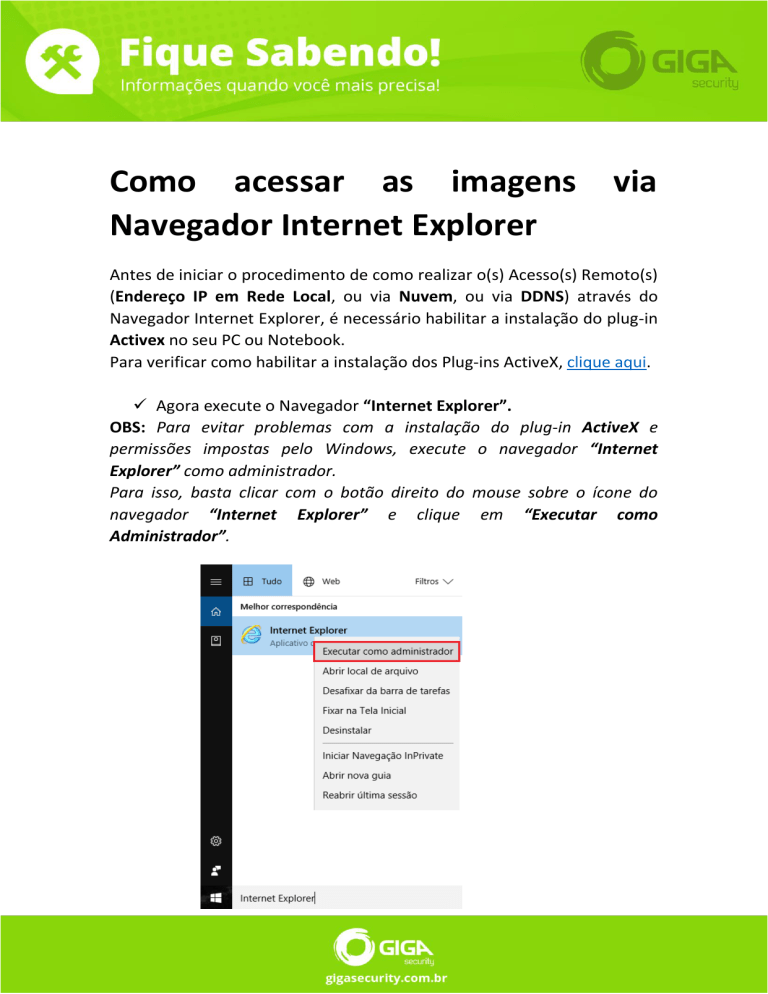 Como acessar as imagens Navegador Internet Explorer via Antes de iniciar o procedimento de como realizar o(s) Acesso(s) Remoto(s) (Endereço IP em Rede Local, ou via Nuvem, ou via DDNS) através do Navegador Internet Explorer, é necessário habilitar a instalação do plug-in Activex no seu PC ou Notebook. Para verificar como habilitar a instalação dos Plug-ins ActiveX, clique aqui. Agora execute o Navegador “Internet Explorer”. OBS: Para evitar problemas com a instalação do plug-in ActiveX e permissões impostas pelo Windows, execute o navegador “Internet Explorer” como administrador. Para isso, basta clicar com o botão direito do mouse sobre o ícone do navegador “Internet Explorer” e clique em “Executar como Administrador”. Índice 1. Para Acesso Remoto via Endereço IP em Rede Local, clique aqui 2. Para Acesso Remoto via Nuvem, clique aqui 3. Para Acesso Remoto via domínio DDNS Giga, clique aqui Acesso através do endereço IP em Rede Local (Rede Interna) Atenção: Esse tipo de acesso remoto só funciona em Rede Interna, ou seja, na mesma rede onde está instalado o equipamento (DVR / HVR / NVR / Câmera IP) Passo 1 – Digite o endereço IP configurado no gravador juntamente com a porta HTTP e aguarde o carregamento da página. OBS¹: para esse tipo de acesso remoto, não há necessidade de liberação de portas. Porém, só funcionará na rede interna (computador/notebook estiver na mesma rede que o gravador) OBS²: Se a porta HTTP configurada no gravador tiver sido mantida como “80”, não é necessário ser digitada. Exemplo 1: Endereço IP configurado no gravador: 192.168.0.102 Porta HTTP configurada no gravador: 80 Endereço a ser digitado na barra de endereços do navegador: http://192.168.0.102 Exemplo 2: Endereço IP configurado no gravador: 192.168.0.110 Porta HTTP configurada no gravador: 8080 Endereço a ser digitado na barra de endereços do navegador: http://192.168.0.110:8080 Passo 2 – Após a página carregada, clique no botão “Download” conforme indicado abaixo. OBS: esse download se refere ao plug-in ActiveX, necessário para acesso remoto ao gravador. Passo 3 – No rodapé da página, será solicitado o download do arquivo referente ao plug-in ActiveX. Clique no botão “Executar”. Passo 4 – Aguarde o término do download. Passo 5 – Após o download concluído, clique em “Executar”. Passo 6 – Assim que o instalador for executado, selecione o idioma “English” e clique no botão “Next”. Passo 7 – Clique em “Next”. Passo 8 – Clique em “Next”. Passo 9 – Clique em “Next”. Passo 10 – Clique em “Next”. Passo 11 – Aguarde a conclusão da instalação. Passo 12 – Clique em “Finish”. Passo 13 – Recarregue a página do seu navegador. Passo 14 – Ao recarregar a página, caso apareça a mensagem conforme mostrado abaixo no rodapé da página, clique no botão “Permitir”. Passo 15 – Preencha os campos “LOGIN” e “SENHA”, que é o mesmo usuário e senha utilizados para acesso ao Menu Principal do seu equipamento e clique no botão “ENVIAR”. OBS: Todos os equipamentos Giga (HVR/NVR/Câmera IP) saem por padrão de fábrica com: Usuário: admin Senha: o campo da senha em branco Se a senha do equipamento foi alterada, deve ser digitada a senha correta. Passo 16 – Pronto! Você conseguiu acessar o seu equipamento através do Acesso Remoto via endereço IP local! OBS: Para executar todas as câmeras de uma só vez, basta optar por: Conecta todos os vídeos (Main Stream) maior qualidade, maior consumo de rede Conecta todos os vídeos (Extra Stream) menor qualidade, menor consumo de rede Passo 17 – Clique no botão “OK”. Acesso via Nuvem (Rede Interna e Rede Externa) Atenção: Esse tipo de acesso remoto funciona tanto em Rede Interna, ou seja, na mesma rede onde está instalado o equipamento (DVR / HVR / NVR / Câmera IP) quanto em Rede Externa. Passo 1 – Acesse o site oficial da Giga Security: http://www.gigasecurity.com.br Passo 2 – Clique no botão “Acesso via Nuvem”. Ou acesse o link direto: http://cloudgiga.com.br Passo 3 - Clique no botão “Download WEB”. Passo 4 – No rodapé da página, será solicitado o download do arquivo referente ao plug-in ActiveX. Clique no botão “Executar”. Passo 5 – Aguarde o término do download. Passo 6 – Após o download concluído, clique em “Executar”. Passo 7 – Assim que o instalador for executado, selecione o idioma “English” e clique no botão “Next”. Passo 8 – Clique em “Next”. Passo 9 – Clique em “Next”. Passo 10 – Clique em “Next”. Passo 11 – Clique em “Next”. Passo 12 – Aguarde a conclusão da instalação. Passo 13 – Clique em “Finish”. Passo 14 – Em “Por dispositivo” preencha os dados solicitados. Nº Serial: é o serial do seu equipamento (DVR/HVR/NVR/Câmera IP) – composto por 16 caracteres, sendo eles números e letras minúsculas de “a” até “f” OBS: Para localizar o número serial do seu gravador, siga conforme a sequência abaixo: Menu Antigo: Menu Principal >> Info >> Versão >> Serial Menu Novo: Menu Principal >> Config >> Sobre >> Serial Usuário: é o usuário utilizado para acesso ao Menu Principal do seu equipamento (HVR/NVR/Câmera IP) OBS: o usuário padrão dos equipamentos Giga é: admin Senha: é a senha utilizada para acesso ao Menu Principal do seu equipamento (HVR/NVR/Câmera IP) OBS: a senha padrão dos equipamentos giga é: campo da senha em branco Verificar: é o código verificador mostrado logo à frente do campo “Verificar” Passo 15 – Após preenchidos os dados clique em “Login”. Exemplo: Passo 16 – Será exibida na tela a mensagem conforme abaixo. Basta aguardar. Passo 17 - Pronto! Você conseguiu acesso a seu equipamento através do Acesso Remoto via Nuvem! OBS: Para executar todas as câmeras de uma só vez, basta optar por: Conecta todos os vídeos (Main Stream) maior qualidade, maior consumo de rede 