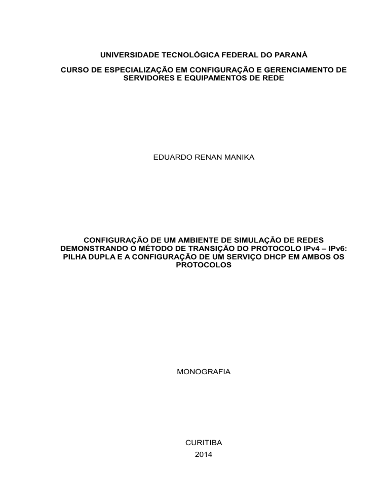 UNIVERSIDADE TECNOLÓGICA FEDERAL DO PARANÁ CURSO DE ESPECIALIZAÇÃO EM CONFIGURAÇÃO E GERENCIAMENTO DE SERVIDORES E EQUIPAMENTOS DE REDE EDUARDO RENAN MANIKA CONFIGURAÇÃO DE UM AMBIENTE DE SIMULAÇÃO DE REDES DEMONSTRANDO O MÉTODO DE TRANSIÇÃO DO PROTOCOLO IPv4 – IPv6: PILHA DUPLA E A CONFIGURAÇÃO DE UM SERVIÇO DHCP EM AMBOS OS PROTOCOLOS MONOGRAFIA CURITIBA 2014 2 EDUARDO RENAN MANIKA CONFIGURAÇÃO DE UM AMBIENTE DE SIMULAÇÃO DE REDES DEMONSTRANDO O MÉTODO DE TRANSIÇÃO DO PROTOCOLO IPv4 – IPv6: PILHA DUPLA E A CONFIGURAÇÃO DE UM SERVIÇO DHCP EM AMBOS OS PROTOCOLOS Monografia apresentada como requisito parcial para a obtenção do grau de Especialista em Configuração e Gerenciamento de servidores e equipamentos de rede, do Departamento Acadêmico de Eletrônica da Universidade Tecnológica Federal do Paraná – UTFPR Orientador: Prof. MSc. Lincoln Herbert Teixeira CURITIBA 2014 3 RESUMO MANIKA, Eduardo R. Configuração de um ambiente de simulação de redes demonstrando o método de transição do Protocolo IPv4 – IPv6: Pilha Dupla e a configuração de um serviço DHCP em ambos os protocolos. 2014. 103 f. Monografia (Especialização em Configuração e Gerenciamento de Servidores e Equipamentos de Redes). Universidade Tecnológica Federal do Paraná. Curitiba, 2014. Essa monografia aborda o estudo para desenvolver um ambiente de simulação/emulação de uma rede local utilizando o software GNS3. Apresentando um cenário que aborda uma técnica de transição do protocolo IPv4-IPv6, denominada Pilha Dupla. Transição essa que inicialmente foi projetada para ser executada tecnicamente simples e de forma gradativa, porém não ocorrendo conforme o esperado e com o esgotamento do endereçamento IPv4 e o aumento da necessidade de novos endereços, o IPv6 se torna cada vez mais necessário. Além da Pilha Dupla, abordará a demonstração da configuração dos serviços de rede sendo implementado em ambos os protocolos, no caso o serviço de DHCP Dynamic Host Configuration Protocol, que distribui os endereços IP aos hosts da rede. E para realizar o roteamento da rede será utilizado o protocolo de roteamento OSPF, que apresenta suporte a versão IPv4 e IPv6. O projeto trata-se de uma pesquisa teórica experimental, no qual é realizado um levantamento bibliográfico, seguido da configuração do ambiente de simulação e implementação dos serviços em ambos os protocolos e análise dos resultados obtidos. O resultado mostrará o impacto dessa transição na rede, nos serviços e na administração da rede. Palavras-chave: IPv6. IPv4.Transição: IPv4-IPv6. Pilha Dupla. DHCP. DHCPv6. OSPF. OSPFv3. 4 ABSTRACT MANIKA, Eduardo R. Configuring a network simulation environment demonstrate the method of transition from IPv4 protocol - IPv6: Dual stack and configuring a DHCP service in both protocols. 2014. 103.pages. Monograph (Specialization in Configuration and Management of Servers and Network Equipments) - Federal Technological University of Paraná. Curitiba, 2014. This monograph discusses the study to develop an environment for simulation / emulation of a local area network using GNS3 software. Presenting a scenario that addresses a technique of transition from IPv4-IPv6 protocol, called Dual Stack. This transition that was initially designed to run technically simple and gradually, though not occurring as expected and with the exhaustion of IPv4 addresses and the increasing need for new addresses, IPv6 becomes increasingly necessary. Beyond the Double Stack, the demonstration will address the configuration of network services of DHCP service being implemented both protocols in the case - Dynamic Host Configuration Protocol, which distributes IP addresses to network hosts. And to perform network routing protocol OSPF routing, which provides support for IPv4 and IPv6 version will be used. The project comes up from a theoretical experimental research, in which a bibliographic survey, followed by the simulation environment configuration and deployment of services in both protocols and analysis of results is performed. The results show the impact of this transition on the network, services and network administration. Keywords: IPv6, IPv4, Method of Transition: IPv4-IPv6. Dual Stack, DHCP, DHCPv6, OSPF, OSPFv3. 5 LISTA DE SIGLAS ACL - Access Control List CGN - Carrier Grade NAT CIDR - Classless Inter-Domain Routing DARPA - Defense Advanced Research Projects Agency DHCP - Dynamic Host Configuration Protocol DNS - Domain Name Server HTML - Hyper-Text Markup Language IANA - Internet Assigned Numbers Authority ICANN - Internet Corporation for Assigned Names e Numbers IETF - Internet Engineering Task Force IP - Internet Protocol LSN - Large Scale NAT MAC - Media Access Control MTU - Maximum Transmission Unit NAT - Network Address Translation OSPF - Open Shortest Path First RFC - Request for Comments RIR - Regional Internet Registry ROAD - Routing and Addressing TTL - Time To Live ULA - Unique Local Address WWW - World Wide Web 6 LISTA DE ILUSTRAÇÕES Figura 1 - Origem da Internet em 1969. ....................................................................21 Figura 2 - Notação do Endereço IPv4. ......................................................................23 Figura 3 - Cabeçalho do Pacote IPv4........................................................................24 Figura 4 - Autoridades na Governança da Internet no Mundo...................................27 Figura 5 - Perfil das Classes Padrões de Redes/Hosts no IPv4................................28 Figura 6 - Máscaras de Rede das Classes Padrões. ...............................................30 Figura 7 - Exemplo de CIDR na economia de endereços IPv4. ................................30 Figura 8 - Cabeçalho do protocolo IPv6. ...................................................................33 Figura 9 - Destaque dos campos do cabeçalho do protocolo IPv4 removido no cabeçalho do protocolo I