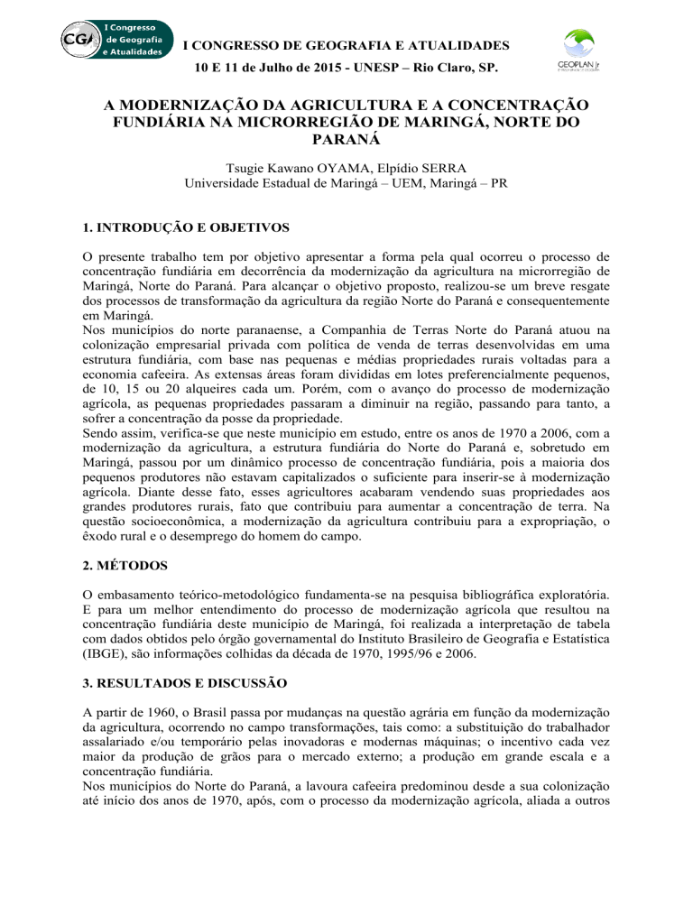 I CONGRESSO DE GEOGRAFIA E ATUALIDADES 10 E 11 de Julho de 2015 - UNESP – Rio Claro, SP. A MODERNIZAÇÃO DA AGRICULTURA E A CONCENTRAÇÃO FUNDIÁRIA NA MICRORREGIÃO DE MARINGÁ, NORTE DO PARANÁ Tsugie Kawano OYAMA, Elpídio SERRA Universidade Estadual de Maringá – UEM, Maringá – PR 1. INTRODUÇÃO E OBJETIVOS O presente trabalho tem por objetivo apresentar a forma pela qual ocorreu o processo de concentração fundiária em decorrência da modernização da agricultura na microrregião de Maringá, Norte do Paraná. Para alcançar o objetivo proposto, realizou-se um breve resgate dos processos de transformação da agricultura da região Norte do Paraná e consequentemente em Maringá. Nos municípios do norte paranaense, a Companhia de Terras Norte do Paraná atuou na colonização empresarial privada com política de venda de terras desenvolvidas em uma estrutura fundiária, com base nas pequenas e médias propriedades rurais voltadas para a economia cafeeira. As extensas áreas foram divididas em lotes preferencialmente pequenos, de 10, 15 ou 20 alqueires cada um. Porém, com o avanço do processo de modernização agrícola, as pequenas propriedades passaram a diminuir na região, passando para tanto, a sofrer a concentração da posse da propriedade. Sendo assim, verifica-se que neste município em estudo, entre os anos de 1970 a 2006, com a modernização da agricultura, a estrutura fundiária do Norte do Paraná e, sobretudo em Maringá, passou por um dinâmico processo de concentração fundiária, pois a maioria dos pequenos produtores não estavam capitalizados o suficiente para inserir-se à modernização agrícola. Diante desse fato, esses agricultores acabaram vendendo suas propriedades aos grandes produtores rurais, fato que contribuiu para aumentar a concentração de terra. Na questão socioeconômica, a modernização da agricultura contribuiu para a expropriação, o êxodo rural e o desemprego do homem do campo. 2. MÉTODOS O embasamento teórico-metodológico fundamenta-se na pesquisa bibliográfica exploratória. E para um melhor entendimento do processo de modernização agrícola que resultou na concentração fundiária deste município de Maringá, foi realizada a interpretação de tabela com dados obtidos pelo órgão governamental do Instituto Brasileiro de Geografia e Estatística (IBGE), são informações colhidas da década de 1970, 1995/96 e 2006. 3. RESULTADOS E DISCUSSÃO A partir de 1960, o Brasil passa por mudanças na questão agrária em função da modernização da agricultura, ocorrendo no campo transformações, tais como: a substituição do trabalhador assalariado e/ou temporário pelas inovadoras e modernas máquinas; o incentivo cada vez maior da produção de grãos para o mercado externo; a produção em grande escala e a concentração fundiária. Nos municípios do Norte do Paraná, a lavoura cafeeira predominou desde a sua colonização até início dos anos de 1970, após, com o processo da modernização agrícola, aliada a outros I CONGRESSO DE GEOGRAFIA E ATUALIDADES 10 E 11 de Julho de 2015 - UNESP – Rio Claro, SP. fatores desfavoráveis à manutenção dos cafezais como a crise do mercado cafeeiro e a forte geada de 1975 que arrasou as plantações de café, resultou na desarticulação da economia cafeeira, levando os produtores a desenvolverem outras alternativas de produção. Porém, nem todos os agricultores puderam inserir-se nesse novo paradigma de produção, pois a modernização da agricultura exigia-se capital para a incorporação de máquinas e insumos agrícolas, assim como também a ampliação da área a ser cultivada, visto que essas culturas temporárias dependem de grandes áreas para o seu cultivo. A crise cafeeira e a modernização da agricultura contribuíram para a penetração do capitalismo no campo, resultando em expropriação e expulsão da população rural, principalmente dos pequenos proprietários, arrendatários e parceiros, gerando inúmeros problemas sociais. “A lógica contraditória tem sido uma só, o desenvolvimento capitalista que concentra a terra, ao mesmo tempo, empurra uma parcela cada vez maior da população para as áreas urbanas, gerando nas mesmas, uma massa cada vez maior de pobres e miseráveis” (OLIVEIRA, 2007, p. 133). A modernização da agricultura resultou, portanto, em mudanças tanto na questão técnica quanto nas relações sociais no campo. O termo modernização da agricultura é utilizado para designar não só a transformação na base técnica da produção agropecuária no pós-guerra, mas também as modificações intensas da produção no campo (SILVA, 1982). Segundo o mesmo autor, na década de 60, o Brasil passa por mudança na questão agrária com a modernização da agricultura, principalmente nas regiões Sudeste e Sul. Esse processo se intensifica a partir da década de 1970. O Brasil deixa de ser um país agrário exportador para ser industrial. Essa modernização no campo brasileiro veio a favorecer o latifúndio, beneficiando os empresários do agrobusiness em detrimento dos pequenos agricultores, muitos dos quais foram expropriados e expulsos do meio rural. [...] os produtores que por motivos diversos – em geral limitações de meio ambiente físico, fertilidade e relevo natural dos solos, e/ou recursos – não fazem uso dessas técnicas tendem a não conseguir se reproduzir enquanto categoria social. Isso se percebe através do elevado número de unidades produtivas de pequenos proprietários, arrendatários e parceiros, eliminadas da estrutura produtiva do Paraná (FLEISCHFRESSER, 1988, p . 16). Diante disso, verifica-se que o pequeno produtor rural, desprovido de capital, passou a sofrer com as crises político-econômicas, pois, sem condição de investimentos financeiros para se adequarem ao novo modelo agrícola, não conseguiu se inserir no processo de modernização e consequentemente eliminado do campo. Tedesco (2001), t