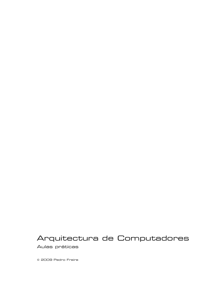 Arquitectura de Computadores Aulas práticas © 2009 Pedro Freire Este documento tem alguns direitos reservados: Atribuição-Uso Não-Comercial-Não a Obras Derivadas 2.5 Portugal http://creativecommons.org/licenses/by-nc-nd/2.5/pt/ Isto significa que podes usá-lo para fins de estudo. Para outras utilizações, lê a licença completa. Crédito ao autor deve incluir o nome (“Pedro Freire”) e referência a “www.pedrofreire.com”. REQUISITOS ................................................................................................................................................... 6 PARA A ESCOLA ............................................................................................................................................. 6 PARA O ALUNO ............................................................................................................................................... 6 AULA 01 .......................................................................................................................................................... 7 AMBIENTE DE TRABALHO ................................................................................................................................ 7 MONTAR/COMPILAR EXPLICAR E CORRER ........................................................................................................................ 7 O PRIMEIRO EXEMPLO HARDWARE: CPU, RAM .................................................................................................................. 8 E ENDEREÇAMENTO ................................................................................................. 9 AULA 02 ........................................................................................................................................................ 11 CONSTANTES ................................................................................................................................................. 11 CARACTERES E STRINGS .............................................................................................................................. 11 ETIQUETAS (LABELS) E VARIÁVEIS .......................................................................................................... 12 DB, DW, DD, DQ ........................................................................................................................................ 12 EQU E $....................................................................................................................................................... 14 AULA 03 ........................................................................................................................................................ 14 REGISTOS ..................................................................................................................................................... 14 FLAGS .......................................................................................................................................................... 14 SEGMENTOS/SECÇÕES ................................................................................................................................... 14 EXERCÍCIO ................................................................................................................................................... 14 AULA 04 ........................................................................................................................................................ 14 NOME.ASM ..................................................................................................................................................... 14 RESB, RESW, RESD, RESQ ......................................................................................................................... 14 LER DADOS DO TECLADO .............................................................................................................................. 14 REFERÊNCIAS À MEMÓRIA ............................................................................................................................ 14 EXERCÍCIO ................................................................................................................................................... 14 AULA 05 ........................................................................................................................................................ 14 PALAVRAS.ASM ............................................................................................................................................. 14 EXERCÍCIOS ................................................................................................................................................. 14 AULA 06 ........................................................................................................................................................ 14 A06-CONVERTE2.ASM .................................................................................................................................. 14 EXERCÍCIOS ................................................................................................................................................. 14 AULA 07 ........................................................................................................................................................ 14 A07-CONVERTE2A.ASM ................................................................................................................................ 14 PILHA .......................................................................................................................................................... 14 EXEMPLO....................................................................................................................................................... 14 PASSAR ARGUMENTOS A SUB-ROTINAS/FUNÇÕES USANDO A P