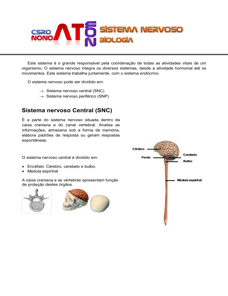Este sistema é o grande responsável pela coordenação de todas as atividades vitais de um organismo. O sistema nervoso integra os diversos sistemas, desde a atividade hormonal até os movimentos. Este sistema trabalha juntamente, com o sistema endócrino. O sistema nervoso pode ser dividido em: Sistema nervoso central (SNC) Sistema nervoso periférico (SNP) Sistema nervoso Central (SNC) É a parte do sistema nervoso situada dentro da caixa craniana e do canal vertebral. Analisa as informações, armazena sob a forma de memória, elabora padrões de resposta ou geram respostas espontâneas. O sistema nervoso central é dividido em: Encéfalo: Cérebro, cerebelo e bulbo. Medula espinhal A caixa craniana e as vértebras apresentam função de proteção destes órgãos. Sistema nervoso Periférico (SNP) É a parte do sistema nervoso situada fora da caixa craniana e do canal vertebral, interligando o SNC a todas as regiões do corpo. O sistema nervoso periférico é formado pelos nervos cranianos e raquidianos. Sistema nervoso periférico somático O sistema nervoso somático é composto por neurônios que estão submetidos ao controle consciente para gerar ações motoras voluntárias, resultantes da contração de um músculo esquelético. Sua principal função é inervar a musculatura esquelética, responsável pelas ações voluntárias, como a movimentação de um braço ou perna. Sistema nervoso periférico autônomo O SNP autônomo (SNPA) é dividido em dois ramos: simpático e parassimpático, que se distinguem tanto pela estrutura quanto pela função. Enquanto os gânglios da via simpática localizam-se ao lado da medula espinhal, distantes do órgão efetuador, os gânglios das vias parassimpáticas estão longe do sistema nervoso central e próximos ou até dentro do órgão efetuador. As fibras nervosas simpáticas e parassimpáticas inervam os mesmos órgãos, mas trabalham em oposição. Enquanto um dos ramos estimula determinado órgão, o outro o inibe, mantendo o funcionamento equilibrado dos órgãos internos. O SNPA simpático: de modo geral, estimula ações que mobilizam energia, permitindo ao organismo responder a situações de estresse. Por exemplo, é responsável pela aceleração dos batimentos cardíacos, pelo aumento da pressão sanguínea, aumento da concentração de açúcar no sangue e pela ativação do metabolismo geral do corpo. Já o SNPA parassimpático estimula principalmente atividades relaxantes, como a redução do ritmo cardíaco e da pressão sanguínea, entre outras. SNP Voluntário: Tem por função reagir a estímulos provenientes do ambiente externo. Ele é constituído por fibras motoras que conduzem impulsos do sistema nervoso central aos músculos esqueléticos. SNP Autônomo: Tem por função regular o ambiente interno do corpo, controlando a atividade dos sistemas digestivos, cardiovascular, excretor e endócrino. Ele contém fibras nervosas que conduzem impulsos do sistema nervoso central aos músculos lisos das vísceras e à musculatura do coração. Arco Reflexo O ato reflexo é o mais rápido mecanismo de estímulo e resposta do sistema nervoso. Ocorre quando reagimos de maneira instantânea e involuntária a estímulos ambientais. Alguns reflexos são inatos, como a flexão da perna de um recém nascido ao se fazer cócegas em seus pés. Outros são adquiridos, como o de se assustar ao ver um animal feroz ao nosso lado quando estamos distraídos. Exercícios 1- “O ecstasy é uma das drogas ilegais mais utilizadas atualmente, conhecida como a “píula-doamor”, possui uma substância chamada MDMA - metilenodioximetanfetamina- que atua sobre três neurotransmissores: a serotonina, a dopamina e a noradrenalina. O mais atingido é a serotonina, que controla as emoções e também regula o domínio sensorial, o domínio motor e a capacidade associativa do cérebro. O MDMA provoca uma descarga de serotonina nas células nervosas do cérebro para produzir os efeitos de leveza e bem estar; porém, a serotonina também é reguladora da temperatura do corpo, podendo causar hipertermia ou superaquecimento do organismo, sendo esta a principal causa de morte dos usuários.” Adaptado: Superinteressante, set./2000. Em relação aos neurotransmissores, analise as afirmativas abaixo: I. Os neurotransmissores são transportados através dos neurônios e liberados na fenda sináptica onde dão origem ao impulso nervoso da célula. II. Nos neurônios o impulso nervoso tem sentido unilateral e invariável - dendrito corpo celular axônio - não ocorrendo nunca em sentido contrário. III. Os neurotransmissores são transportados pela corrente sanguínea e atuam em órgãos específicos, denominados órgãos-alvo. Marque a opção que julgar verdadeira: (A) I está correta. (B) I e III estão corretas. (C) III está correta. (D) I e II estão corretas. (E) I, II e III estão corretas. 2- Com a manchete “O Vôo de Maurren”, O Estado de São Paulo noticiou, no dia 23 de agosto de 2008, que a saltadora Maurren Maggi ganhou a segunda medalha de ouro para o Brasil nos últimos Jogos Olímpicos. No salto de 7,04m de distância, Maurren utilizou a força originada da contração do tecido muscular estriado esquelético. Para que pudesse chegar a essa marca, foi preciso contração muscular e coordenação dos movimentos por meio de impulsos nervosos. a) Explique como o neurônio transmite o impulso nervoso ao músculo. _____________________________________________________________ _____________________________________________________________ _____________________________________________________________ b) Para saltar, é necessária a integração das estruturas ósseas (esqueleto) com os tendões e os músculos. Explique como ocorre a integração dessas três estruturas para propiciar à atleta a execução do salto. _____________________________________________________________ _____________________________________________________________ ________