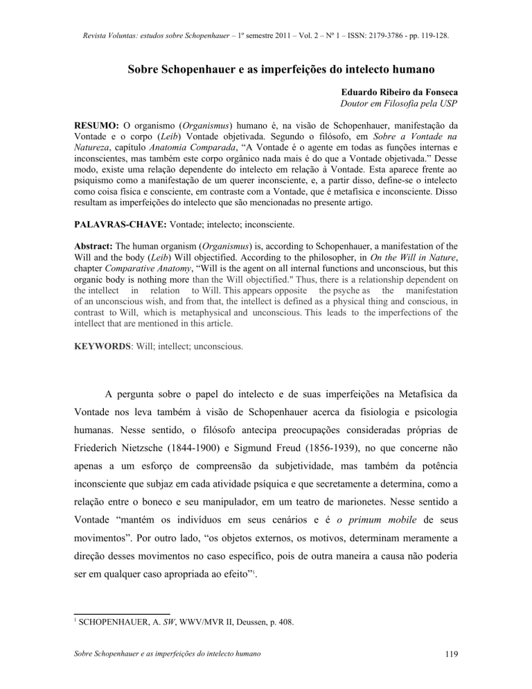 Revista Voluntas: estudos sobre Schopenhauer – 1º semestre 2011 – Vol. 2 – Nº 1 – ISSN: 2179-3786 - pp. 119-128. Sobre Schopenhauer e as imperfeições do intelecto humano Eduardo Ribeiro da Fonseca Doutor em Filosofia pela USP RESUMO: O organismo (Organismus) humano é, na visão de Schopenhauer, manifestação da Vontade e o corpo (Leib) Vontade objetivada. Segundo o filósofo, em Sobre a Vontade na Natureza, capítulo Anatomia Comparada, “A Vontade é o agente em todas as funções internas e inconscientes, mas também este corpo orgânico nada mais é do que a Vontade objetivada.” Desse modo, existe uma relação dependente do intelecto em relação à Vontade. Esta aparece frente ao psiquismo como a manifestação de um querer inconsciente, e, a partir disso, define-se o intelecto como coisa física e consciente, em contraste com a Vontade, que é metafísica e inconsciente. Disso resultam as imperfeições do intelecto que são mencionadas no presente artigo. PALAVRAS-CHAVE: Vontade; intelecto; inconsciente. Abstract: The human organism (Organismus) is, according to Schopenhauer, a manifestation of the Will and the body (Leib) Will objectified. According to the philosopher, in On the Will in Nature, chapter Comparative Anatomy, “Will is the agent on all internal functions and unconscious, but this organic body is nothing more than the Will objectified." Thus, there is a relationship dependent on the intellect in relation to Will. This appears opposite the psyche as the manifestation of an unconscious wish, and from that, the intellect is defined as a physical thing and conscious, in contrast to Will, which is metaphysical and unconscious. This leads to the imperfections of the intellect that are mentioned in this article. KEYWORDS: Will; intellect; unconscious. A pergunta sobre o papel do intelecto e de suas imperfeições na Metafísica da Vontade nos leva também à visão de Schopenhauer acerca da fisiologia e psicologia humanas. Nesse sentido, o filósofo antecipa preocupações consideradas próprias de Friederich Nietzsche (1844-1900) e Sigmund Freud (1856-1939), no que concerne não apenas a um esforço de compreensão da subjetividade, mas também da potência inconsciente que subjaz em cada atividade psíquica e que secretamente a determina, como a relação entre o boneco e seu manipulador, em um teatro de marionetes. Nesse sentido a Vontade “mantém os indivíduos em seus cenários e é o primum mobile de seus movimentos”. Por outro lado, “os objetos externos, os motivos, determinam meramente a direção desses movimentos no caso específico, pois de outra maneira a causa não poderia ser em qualquer caso apropriada ao efeito”1. 1 SCHOPENHAUER, A. SW, WWV/MVR II, Deussen, p. 408. Sobre Schopenhauer e as imperfeições do intelecto humano 119 FONSECA, Eduardo Ribeiro da Para Schopenhauer, a racionalidade é um aspecto do psiquismo humano e não seu fundamento. Mais fundamental é a intuição intelectual proporcionada pelo entendimento, que realmente capta e dá forma ao mundo, através das formas básicas a priori do tempo, do espaço, e da causalidade. Ao fundo das intuições intelectuais e das abstrações conceituais, no entanto, estão aspectos afetivos, que efetivamente direcionam o intelecto e determinam o posicionamento psíquico frente à efetividade. Em Schopenhauer, ocorre a desconstrução do primado atribuído à consciência no domínio psicológico, e, consequentemente, o reconhecimento e a valorização de um vasto e inaudito psiquismo inconsciente determinado por um caráter originário que só pode ser conhecido através de seus atos sucessivos no tempo. Disso resulta a proposta de um novo conceito de unidade subjetiva, isto é, processos que resultam na unidade fisiopsicológica do Eu, que se orienta por uma compreensão ampliada do corpo e da racionalidade. Estas preocupações psicológicas de Schopenhauer procuram estabelecer os domínios da Vontade e da Representação no campo psíquico e um dos modos de buscar na ciência da época a confirmação empírica da metafísica. É o que fica claro, por exemplo, em Sobre a Vontade na Natureza. Escreve o filósofo na introdução dessa obra: Através disso, minha metafísica se afirma como sendo a única que tem efetivamente uma fronteira (Grenzpunkt) com as ciências físicas, um ponto (Punkt) em que estas por seus próprios meios vão ao encontro dela, de modo que efetivamente elas terminam nela e concordam com ela: e, na verdade, isto não é feito torcendo-se e coagindo as ciências empíricas em direção à metafísica, nem antes abstraindo em segredo esta daquelas e, então, à maneira schellingiana, ela encontra a priori o que teria aprendido a posteriori; mas, antes, ambas se reencontram no mesmo ponto e sem compromisso2. A coerência entre a metafísica da natureza e a ciência empírica está na apresentação do mundo desde um duplo ponto de vista, preservando a diferença entre ideal e real e não tentando anulá-la de alguma maneira, como na opinião de Schopenhauer fazem Schelling e também Spinoza. Dessa dupla abordagem que se configura ao longo de toda a sua obra, surge a possibilidade de encontrarmos uma passagem subterrânea entre os pontos de vista da representação e da vontade no que concerne à natureza íntima de nosso psiquismo de fundo 2 SCHOPENHAUER, A. N/N, Suhr III, p. 320. Cf. HN/MP III, p. 86. Traduzido e citado por BRANDÃO, E. A concepção de matéria na obra de Schopenhauer, p. 89. Sobre Schopenhauer e as imperfeições do intelecto humano 120 Revista Voluntas: estudos sobre Schopenhauer – 1º semestre 2011 – Vol. 2 – Nº 1 – ISSN: 2179-3786 - pp. 119-128. orgânico. Se, por um lado, o organismo é a corporeidade de uma vontade individual, por outro, o cérebro e o sistema nervoso como um todo aparecem como um parasita que recobre a estrutura do corpo e possui uma função determinada, que é justamente a de servir de olhos e ouvidos à