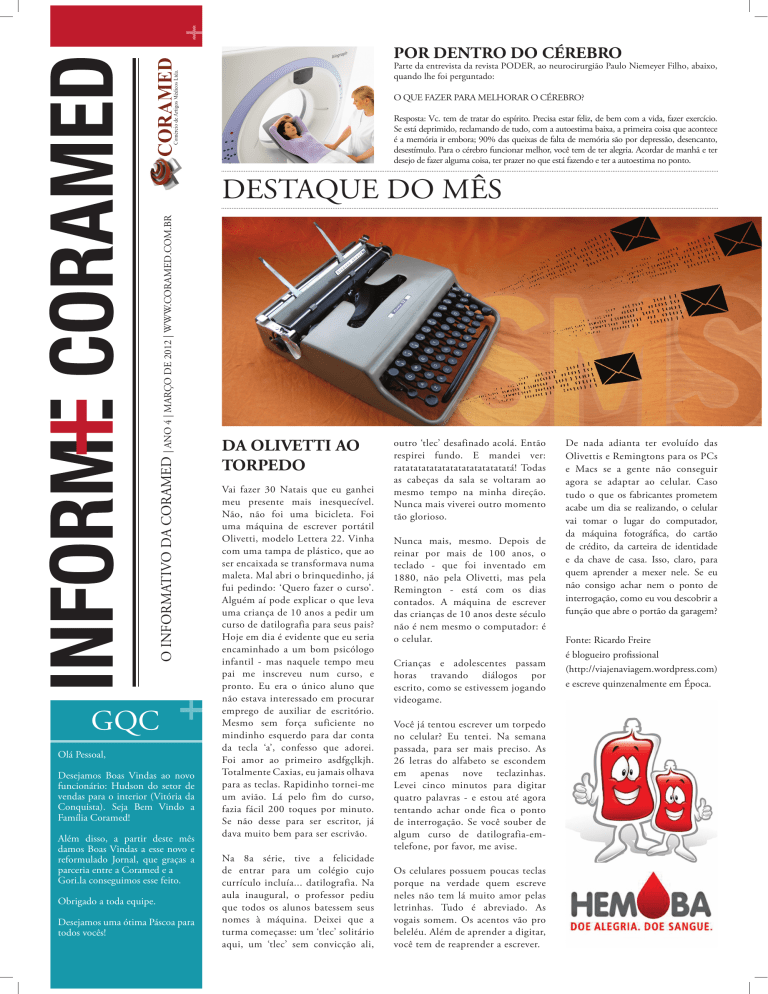 POR DENTRO DO CÉREBRO Parte da entrevista da revista PODER, ao neurocirurgião Paulo Niemeyer Filho, abaixo, quando lhe foi perguntado: O QUE FAZER PARA MELHORAR O CÉREBRO? Resposta: Vc. tem de tratar do espírito. Precisa estar feliz, de bem com a vida, fazer exercício. Se está deprimido, reclamando de tudo, com a autoestima baixa, a primeira coisa que acontece é a memória ir embora; 90% das queixas de falta de memória são por depressão, desencanto, desestímulo. Para o cérebro funcionar melhor, você tem de ter alegria. Acordar de manhã e ter desejo de fazer alguma coisa, ter prazer no que está fazendo e ter a autoestima no ponto. O INFORMATIVO DA CORAMED | ANO 4 | MARÇO DE 2012 | WWW.CORAMED.COM.BR DESTAQUE DO MÊS GQC Olá Pessoal, Desejamos Boas Vindas ao novo funcionário: Hudson do setor de vendas para o interior (Vitória da Conquista). Seja Bem Vindo a Família Coramed! Além disso, a partir deste mês damos Boas Vindas a esse novo e reformulado Jornal, que graças a parceria entre a Coramed e a Gori.la conseguimos esse feito. Obrigado a toda equipe. Desejamos uma ótima Páscoa para todos vocês! DA OLIVETTI AO TORPEDO Vai fazer 30 Natais que eu ganhei meu presente mais inesquecível. Não, não foi uma bicicleta. Foi uma máquina de escrever portátil Olivetti, modelo Lettera 22. Vinha com uma tampa de plástico, que ao ser encaixada se transformava numa maleta. Mal abri o brinquedinho, já fui pedindo: ‘Quero fazer o curso’. Alguém aí pode explicar o que leva uma criança de 10 anos a pedir um curso de datilografia para seus pais? Hoje em dia é evidente que eu seria encaminhado a um bom psicólogo infantil - mas naquele tempo meu pai me inscreveu num curso, e pronto. Eu era o único aluno que não estava interessado em procurar emprego de auxiliar de escritório. Mesmo sem força suficiente no mindinho esquerdo para dar conta da tecla ‘a’, confesso que adorei. Foi amor ao primeiro asdfgçlkjh. Totalmente Caxias, eu jamais olhava para as teclas. Rapidinho tornei-me um avião. Lá pelo fim do curso, fazia fácil 200 toques por minuto. Se não desse para ser escritor, já dava muito bem para ser escrivão. Na 8a série, tive a felicidade de entrar para um colégio cujo currículo incluía... datilografia. Na aula inaugural, o professor pediu que todos os alunos batessem seus nomes à máquina. Deixei que a turma começasse: um ‘tlec’ solitário aqui, um ‘tlec’ sem convicção ali, outro ‘tlec’ desafinado acolá. Então respirei fundo. E mandei ver: ratatatatatatatatatatatatatatá! Todas as cabeças da sala se voltaram ao mesmo tempo na minha direção. Nunca mais viverei outro momento tão glorioso. Nunca mais, mesmo. Depois de reinar por mais de 100 anos, o teclado - que foi inventado em 1880, não pela Olivetti, mas pela Remington - está com os dias contados. A máquina de escrever das crianças de 10 anos deste século não é nem mesmo o computador: é o celular. Crianças e adolescentes passam horas travando diálogos por escrito, como se estivessem jogando videogame. Você já tentou escrever um torpedo no celular? Eu tentei. Na semana passada, para ser mais preciso. As 26 letras do alfabeto se escondem em apenas nove teclazinhas. Levei cinco minutos para digitar quatro palavras - e estou até agora tentando achar onde fica o ponto de interrogação. Se você souber de algum curso de datilografia-emtelefone, por favor, me avise. Os celulares possuem poucas teclas porque na verdade quem escreve neles não tem lá muito amor pelas letrinhas. Tudo é abreviado. As vogais somem. Os acentos vão pro beleléu. Além de aprender a digitar, você tem de reaprender a escrever. De nada adianta ter evoluído das Olivettis e Remingtons para os PCs e Macs se a gente não conseguir agora se adaptar ao celular. Caso tudo o que os fabricantes prometem acabe um dia se realizando, o celular vai tomar o lugar do computador, da máquina fotográfica, do cartão de crédito, da carteira de identidade e da chave de casa. Isso, claro, para quem aprender a mexer nele. Se eu não consigo achar nem o ponto de interrogação, como eu vou descobrir a função que abre o portão da garagem? Fonte: Ricardo Freire é blogueiro profissional (http://viajenaviagem.wordpress.com) e escreve quinzenalmente em Época. SAÚDE POR DENTRO DO CÉREBRO acho que vamos entrar numa fase de reparação do funcionamento cerebral, cirurgia genética, que serão cirurgias com introdução de cateter, colocação de partículas de nanotecnologia, em que você vai entrar na célula, com partículas que carregam dentro delas um remédio que vai matar aquela célula doente que te faz infeliz. Daqui a 50 anos ninguém mais vai precisar abrir a cabeça. Por: Dr Paulo Niemeyer Filho / Neurocirurgião Parte da entrevista da revista PODER, ao neurocirurgião Paulo Niemeyer Filho, abaixo, quando lhe foi perguntado: VOCÊ ACHA QUE NÓS SOMOS A ÚLTIMA GERAÇÃO QUE VAI ENVELHECER? O QUE FAZER PARA MELHORAR O CÉREBRO? Resposta: Vc. tem de tratar do espírito. Precisa estar feliz, de bem com a vida, fazer exercício. Se está deprimido, reclamando de tudo, com a autoestima baixa, a primeira coisa que acontece é a memória ir embora; 90% das queixas de falta de memória são por depressão, desencanto, desestímulo. Para o cérebro funcionar melhor, você tem de ter alegria. Acordar de manhã e ter desejo de fazer alguma coisa, ter prazer no que está fazendo e ter a autoestima no ponto. CABEÇA TEM A VER COM ALMA? Resposta: Eu acredito que a alma está na cabeça. Quando um doente está com morte cerebral, você tem a impressão de que ele já está sem alma... Isso não dá para explicar, o coração está batendo, mas ele não está mais vivo. Isto comprova que os sentimentos se originam no cérebro e não no coração. O QUE SE PODE FAZER PARA SE PREVENIR DE DOENÇAS NEUROLÓGICAS? Resposta: Todo adulto deve incluir no check-up uma investigação cerebral. Vou dar um exemplo: os aneurismas cer