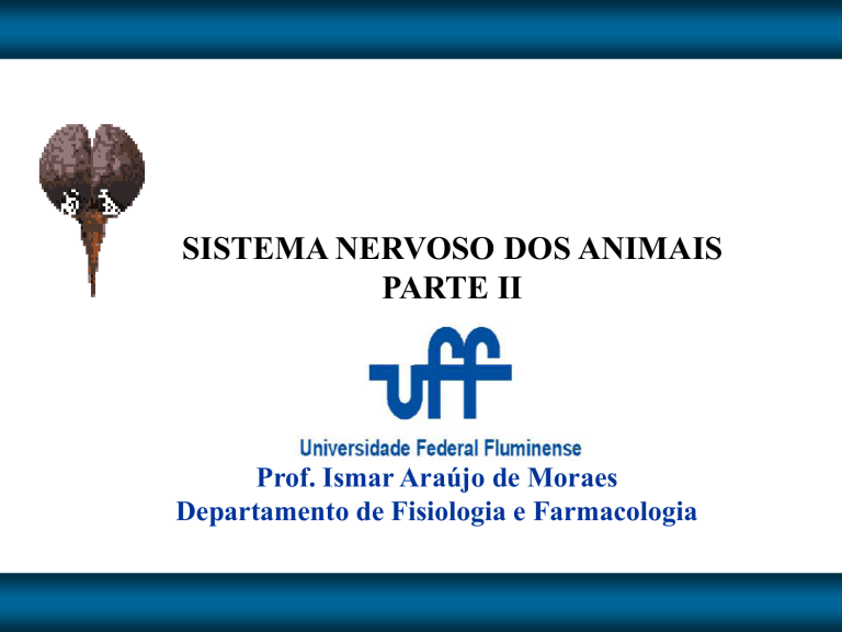 SISTEMA NERVOSO DOS ANIMAIS PARTE II Prof. Ismar Araújo de Moraes Departamento de Fisiologia e Farmacologia 1 SISTEMA NERVOSO CENTRAL O SNC pode ser dividido em 6 regiões 1- MEDULA ESPINHAL 2 - BULBO ou MEDULA OBLONGA 3 – PONTE 4 – MESENCÉFALO 5 – DIENCÉFALO 6 - HEMISFÉRIOS CEREBRAIS 2 SISTEMA NERVOSO CENTRAL 1- MEDULA ESPINHAL Conduz estímulos motores do encéfalo para as porções distais e estímulos sensitivos das partes distais para o encéfalo. 3 http://www.afh.bio.br/nervoso/nervoso4.asp#medula SISTEMA NERVOSO CENTRAL 2- MESENCÉFALO Importante para o movimento ocular e o controle postural subconsciente e contem a FORMAÇÃO RETICULAR que regula a consciência. Dispõe de um sistema de conexão dos sistemas auditivos e visual http://www.afh.bio.br/nervoso/nervoso3.asp#divisao 4 O SONO EM VIGILIA DORMINDO SONO ATIVADO SONO NÃO ATIVADO RAPOSA GATO PORCO RATO VACA OVINO COELHO COBAIO CAVALO HOMEM 9h 18min 10h 48min 11h 6min 11h 30min 12h 36min 16h 17h 6 min 17h 12min 19h 12min 16h 14h 42min 13h 12min 12h 54min 12h 30min 11h 24min 8h 6h 54min 6h 48min 4h 48min 8h 12h 18min 10h 11h 6min 10h 48min 10h 42min 7h 30min 6h 12min 5h 54min 4h 6h 2h 24 min 3h 12min 1h 48min 1h 42min 42 min 30 min 42 min 54 min 48 min 2h 5 Considerações Gerais (Humanos) • O Sono não ativado é também chamado de sono de ECG ondas lentas ou de Sono não REM e o Sono ativado é também chamado de Sono Desincronizado ou paradoxal, e o ECG é igual aquele observado durante a vigília. • Durante o período de sono ocorrem várias fases REM de 30 minutos cada • Durante a fase REM há atonia de todos os músculos com exceção dos respiratórios, cardíaco, oculares e do ouvido médio. • Acredita-se que o sono Não REM descansa o cérebro e o sono REM descansa os músculos • Sem a fase REM, os ratos apresentam baixa imunológica e morrem. • A fase REM está relacionada com o aprendizado. Há avaliação e escolha do que será memorizado ou não. • O Sonho ocorre em ambas as fases, mas na fase Não REM o sonhador é sempre passivo e na fase REM é o protagonista. • Se acordar no meio da fase REM 100% dos indivíduos se lembra do sonho e 75% deles poderão se lembrar se acordar até 8 min após o REM. 6 Considerações Gerais Golfinhos • Existe desligamento de apenas um dos hemisférios durante o sono, sendo que o tempo de desligamento é variável entre as espécies. • Ocorre desligamento unilateral durante 1 hora e em seguida a sua ativação por 2 horas e assim sucessivamente. • Os golfinhos “nariz de garrafa” desligam os dois hemisférios por 4 a 6 segundos sucessivamente 7 SISTEMA NERVOSO CENTRAL 3 - PONTE Contém grande quantidade de neurônios que retransmite informações dos hemisférios cerebrais para o cerebelo garantindo a coordenação dos movimentos pretendidos e reais. Participa da regulação da respiração http://www.afh.bio.br/nervoso/nervoso3.asp#divisao 8 SISTEMA NERVOSO CENTRAL 4 - BULBO ou MEDULA OBLONGA Contém vários núcleos motores de nervos cranianos e centros autônomos que controlam o coração, a respiração, pressão sanguínea, reflexo da tosse, da deglutição e do vômito. http://www.afh.bio.br/nervoso/nervoso3.asp#divisao 9 SISTEMA NERVOSO CENTRAL 5 - DIENCEFALO • Tálamo - estação de relé que processa os estímulos sensoriais que se projetam para o córtex cerebral e estímulos motores provenientes do córtex cerebral para o tronco encefálico e a medula espinhal. • Hipotálamo - Regula o S.N.A., hipófise, a temperatura corporal, a ingestão de alimentos e o equilíbrio hídrico. Imagem: BEAR, M.F., CONNORS, B.W. & PARADISO, M.A. Neurociências – Desvendando o Sistema Nervoso. Porto Alegre 2ª ed, Artmed Editora, 2002. 10 http://www.ufba.br/~qualibio/imagens/capitulo6/f037a.jpg SISTEMA NERVOSO CENTRAL 6 - HEMISFERIOS CEREBRAIS Formados pelo Córtex cerebral, Substância branca subjacente e Gânglios da base Contém estruturas associadas as funções sensoriais e motoras superiores e à consciência http://www.afh.bio.br/nervoso/nervoso3.asp#divisao 11 SI STEMA NERVOS O CENTRAL Imagem: McCRONE, JOHN. Como o cérebro funciona. Série Mais Ciência. São Paulo, Publifolha, 2002. 12 Homúnculo de Penfield http://anatomy.yonsei.ac.kr/LWT/images/Homunculus.JPG http://www.ugr.es/~psicolo/docs_alumnos/neuro_homunculo_sensorial.jpg 13 http://www.percepp.demon.co.uk/penfield.jpg 14 O SISTEMA NERVOSO MOTOR “Neurologicamente, a marcha se inicia por impulsos do córtex cerebral para o controle voluntário e coordenação fina. A estes estímulos, somam-se as influências do cerebelo (que torna a marcha coordenada), do sistema vestibular (que faz a manutenção do equilíbrio) e, por certo, da medula espinhal que transmite os impulsos aos órgãos efetores, através do SNP, além da manutenção da postura e estação”.( João Manoel Chapon Cordeiro, 1996) http://www.newmanveterinary.com/images/cheetah.gif http://www.newmanveterinary.com/images/sheep_dog.gif 15 NEURONIO MOTOR SUPERIOR São todos aqueles neurônios do SNC que influenciam no funcionamento do neurônio motor inferior NEURONIO MOTOR INFERIOR É o neurônio cujo corpo celular e dendritos estão localizados no SNC e cujo axônio se estende através dos nervos periféricos para fazer sinapse com as fibras musculares esqueléticas. 16 NEURONIO MOTOR SUPERIOR Eles se dividem em 3 subgrupos = PIRAMIDAL EXTRAPIRAMIDAL CEREBELO O neurônio motor superior começa no cérebro mas emite axônio longo que percorre a medula espinhal para fazer sinapse com o neurônio motor inferior. 17 http://www.colegiosaofrancisco.com.br/alfa/corpo-humano-sistema-nervoso/imagens/sistema-nervoso- NEURONIO MOTOR SUPERIOR PIRAMIDAL Desencadeamento do movimento voluntário, hábil, aprendido EXTRAPIRAMIDAL Sua maior importância é Iniciar o tônus muscular extensor postural, antigravitacional subconsciente. CEREBELO • Também importante na coordenação dos movimentos da cabeça e olhos na observação do 