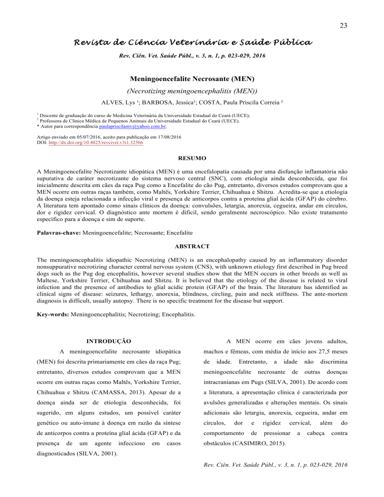 23 Revista de Ciência Veterinária e Saúde Pública Rev. Ciên. Vet. Saúde Públ., v. 3, n. 1, p. 023-029, 2016 Meningoencefalite Necrosante (MEN) (Necrotizing meningoencephalitis (MEN)) ALVES, Lys ¹; BARBOSA, Jessica¹; COSTA, Paula Priscila Correia ² 1 Discente de graduação do curso de Medicina Veterinária da Universidade Estadual do Ceará (UECE); Professora de Clínica Médica de Pequenos Animais da Universidade Estadual do Ceará (UECE). * Autor para correspondência [email protected]; 2 Artigo enviado em 05/07/2016, aceito para publicação em 17/08/2016 DOI: http://dx.doi.org/10.4025/revcivet.v3i1.32566 RESUMO A Meningoencefalite Necrotizante idiopática (MEN) é uma encefalopatia causada por uma disfunção inflamatória não supurativa de caráter necrotizante do sistema nervoso central (SNC), com etiologia ainda desconhecida, que foi inicialmente descrita em cães da raça Pug como a Encefalite do cão Pug, entretanto, diversos estudos comprovam que a MEN ocorre em outras raças também, como Maltês, Yorkshire Terrier, Chihuahua e Shitzu. Acredita-se que a etiologia da doença esteja relacionada a infecção viral e presença de anticorpos contra a proteína glial ácida (GFAP) do cérebro. A literatura tem apontado como sinais clínicos da doença: convulsões, letargia, anorexia, cegueira, andar em círculos, dor e rigidez cervical. O diagnóstico ante mortem é difícil, sendo geralmente necroscópico. Não existe tratamento específico para a doença e sim de suporte. Palavras-chave: Meningoencefalite; Necrosante; Encefalite ABSTRACT The meningoencephalitis idiopathic Necrotizing (MEN) is an encephalopathy caused by an inflammatory disorder nonsuppurative necrotizing character central nervous system (CNS), with unknown etiology first described in Pug breed dogs such as the Pug dog encephalitis, however several studies show that the MEN occurs in other breeds as well as Maltese, Yorkshire Terrier, Chihuahua and Shitzu. It is believed that the etiology of the disease is related to viral infection and the presence of antibodies to glial acidic protein (GFAP) of the brain. The literature has identified as clinical signs of disease: seizures, lethargy, anorexia, blindness, circling, pain and neck stiffness. The ante-mortem diagnosis is difficult, usually autopsy. There is no specific treatment for the disease but support. Key-words: Meningoencephalitis; Necrotizing; Encephalitis. INTRODUÇÃO A MEN ocorre em cães jovens adultos, A meningoencefalite necrosante idiopática machos e fêmeas, com média de início aos 27,5 meses (MEN) foi descrita primariamente em cães da raça Pug; de entretanto, diversos estudos comprovam que a MEN meningoencefalite ocorre em outras raças como Maltês, Yorkshire Terrier, intracranianas em Pugs (SILVA, 2001). De acordo com Chihuahua e Shitzu (CAMASSA, 2013). Apesar de a a literatura, a apresentação clínica é caracterizada por doença ainda ser de etiologia desconhecida, foi avulsões generalizadas e alterações mentais. Os sinais sugerido, em alguns estudos, um possível caráter adicionais são letargia, anorexia, cegueira, andar em genético ou auto-imune à doença em razão da síntese círculos, de anticorpos contra a proteína glial ácida (GFAP) e da comportamento presença obstáculos (CASIMIRO, 2015). de um agente infeccioso em casos idade. Entretanto, dor a idade necrosante de e rigidez de pressionar não outras cervical, a discrimina doenças além cabeça do contra diagnosticados (SILVA, 2001). Rev. Ciên. Vet. Saúde Públ., v. 3, n. 1, p. 023-029, 2016 24 Meningoencefalite Necrosante Para o diagnóstico definitivo da doença, é e fungos. Geralmente, as doenças inflamatórias tendem necessário o exame histopatológico do SNC, que deve a ter um início agudo, com distribuição no multifocal indicar processo inflamatório não supurativo e focos de ou difusa no SNC e, muitas vezes assimétrica. Os necrose na substancia branca e cinzenta do cérebro sinais neurológicos são variáveis e refletem a (SILVA, 2001). A ressonância magnética é o único localização do foco inflamatório (GONÇALVES, método de diagnostico ante mortem, porém esse não é 2016; CAMASSA, 2013). definitivo. A análise do liquido cefalorraquidiano (LCR) pode ser realizada e se caracteriza por Meningoencefalite necrosante ou encefalite do Pug infiltrados linfocitários (GONÇALVES, 2016). A meningoencefalite necrosante (MEN) é uma O tratamento da MEN é de suporte, uma vez doença inflamatória não infecciosa progressiva e que a evolução da doença é progressiva. É indicada a crônica que causa lesões necrotizantes no SNC. Essa terapia com corticosteroides em dose imunossupressora enfermidade era conhecida como encefalite dos Pugs. associada a determinados anticonvulsivantes como o Atualmente, já foi relatada em várias outras raças como fenobarbital em casos de convulsões (AMORIM, 2013; Maltês, Bichon, Chiuhuahua, Yorkshire, Shih-Tzu, CASIMIRO, 2015). O curso da doença geralmente é Papilon, fatal (SILVA, 2001). Também já foram reportados casos esporádicos noutras Coton de Tulear (CAMASSA, 2013). raças pequenas, como os Shih Tzus (GONÇALVES, Meningoencefalite 2016). As lesões são tipicamente encontradas no A meningoencefalite refere-se à inflamação do cérebro, com o envolvimento coerente das cérebro e das meninges envolventes e pode ter várias leptomeninges (termo que indica o conjunto das duas causas entre elas causas infecciosas e causas não- meninges mais internas, a aracnóide e a pia-mater) infeciosas, inflamatórias (AMORIM, 2013). O termo (CASIMIRO, 2015). Geralmente, esta doença está meningoencefalite de origem desconhecida (MOD) ou associada inflamatória, foi recentemente instituído de modo a predominantemente no córtex, mas a substância branca designar os casos em que os achados clínicos sejam subcortical também pode estar envolvida. Tem uma sugestivos de meningoencefalite de etiologia não predi