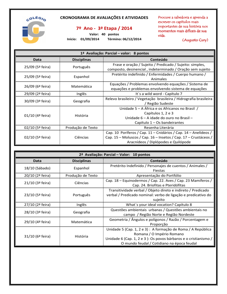 CRONOGRAMA DE AVALIAÇÕES E ATIVIDADES 7º Ano - 3ª Etapa / 2014 Início: Valor: 40 pontos 01/09/2014 Término: 06/12/2014 Procure a sabedoria e aprenda a escrever os capítulos mais importantes de sua história nos momentos mais difíceis de sua vida. (Augusto Cury) 1ª Avaliação: Parcial – valor: 8 pontos Data Disciplinas 25/09 (5ª feira) Português 25/09 (5ª feira) Espanhol 26/09 (6ª feira) Matemática 29/09 (2ª feira) Inglês 30/09 (3ª feira) Geografia 01/10 (4ª feira) História 02/10 (5ª feira) Produção de Texto 02/10 (5ª feira) Ciências Conteúdo Frase e oração / Sujeito / Predicado / Sujeito: simples, composto, desinencial , indeterminado / Oração sem sujeito Pretérito indefinido / Enfermidades / Cuerpo humano / Animales Equações / Problemas envolvendo equações / Sistema de equações e problemas envolvendo sistema de equações It´s a wild word - Capítulo 7 Relevo brasileiro / Vegetação brasileira / Hidrografia brasileira / Região Sudeste Unidade 5 – A África e os Africanos no Brasil / Capítulos 1, 2 e 3 Unidade 6 – A idade do ouro no Brasil – Capítulo 1 – Os bandeirantes Resenha Literária Cap. 10 Poríferos / Cap. 11 – Cnidários / Cap. 14 – Anelídeos / Cap. 15 – Moluscos / Cap. 16 – Insetos / Cap. 17 – Crustáceos / Aracnídeos / Diplópodes e Quilópode 2ª Avaliação: Parcial – Valor: 10 pontos Data Disciplinas 18/10 (Sábado) Espanhol 20/10 (2ª feira) Produção de Texto 21/10 (3ª feira) Ciências 23/10 (5ª feira) Português 27/10 (2ª feira) Inglês 28/10 (3ª feira) Geografia 29/10 (4ª feira) Matemática 31/10 (6ª feira) História Conteúdo Pretérito Indefinido / Personajes de cuentos / Animales / Fiestas Apresentação do Portfólio Cap. 18 – Equinodermos / Cap. 22. Aves / Cap. 23 Mamíferos / Cap. 24. Briofitas e Pteridófitas Transitividade verbal / Objeto direto e indireto / Predicado verbal / Predicado nominal: verbo de ligação e predicativo do sujeito What´s your ideal vocation? Capítulo 8 Questões ambientais urbanas / Questões ambientais no campo / Região Norte e Região Nordeste Geometria / Ângulos e polígonos / Razão / Porcentagem e Proporção Unidade 5 (Cap. 1, 2 e 3) : A formação de Roma / A República Romana / O Império Romano Unidade 6 (Cap. 1, 2 e 3 ): Os povos bárbaros e o cristianismo / O mundo feudal / Cotidiano na época feudal 3ª Avaliação: Somativa – Valor: 14 pontos Data 28/11 (6ª feira) 29/11 (Sábado) 29/11 (Sábado) 01/12 (2ª feira) 02/12 (3ª feira) Disciplinas História Português Espanhol Inglês Ciências 03/12 (4ª feira) Matemática 05/12 (6ª feira) Geografia Conteúdo Todo conteúdo da Etapa Todo o conteúdo da Etapa Todo conteúdo da Etapa Todo conteúdo da Etapa Todo conteúdo da Etapa Proposição / Razões especiais / Regra de Três / Regra de sociedade / Porcentagem e juros / Todo conteúdo da etapa e Região Centro Oeste e Região Sul 2ª Chamada – Inscrição durante a etapa na Tesouraria – Encerramento dia 04/12/2014 Data Disciplinas Conteúdo 05/12 (6ª feira) Português / Espanhol / História / Inglês 6º Horário (11h50min) Da etapa 06/12 (Sábado) Ciências / Produção de texto / Matemática / 7h30min Geografia Livros Paradidáticos – 3ª Etapa / 2014 TÍTULOS DISCIPLINAS O Príncipe e o Mendigo (Ed. Scipione – Série Reencontro com a literatura) Sinos e Queijos.com A volta ao mundo em 80 dias (Autor: Julio Verne – Ed. Ática) Produção de Texto (Resenha literária) Português Português DATA VALOR: 02/10 8,0 16/10 3,0 11/11 3,0 3ª Etapa / 2014 – Projetos / Eventos / Visitas Técnicas DATA DISCIPLINA DESCRIÇÃO Português / Inglês Visita Técnica Ouro Preto e Mariana – Pelos Caminhos das Gerais / Barroco / Relevo Abandone um livro / Leave a book Matemática Novo olhar Geométrico História / Geografia 03/10 Avaliações de Recuperação Final – 3ª Etapa DATA HORÁRIO CONTEÚDO Ciências / Inglês / Produção de Texto 17/12 18/12 DISCIPLINA 7h30min Língua Portuguesa / História Roteiros distribuídos Matemática / Geografia / Espanhol 19/12 Entrega dos resultados e roteiros para estudos autônomos de recuperação: 10/12/2014 Período de inscrição da Recuperação: 10 à 16/12 Período de recuperação (Plantões): 11 a 17/12/2014 Local: Tesouraria Resultado pós-recuperação entrega dos boletins: 22/12/2014 RENOVAÇÃO DE MATRÍCULA PARA O 8º ANO 2015: 17/12/2014
