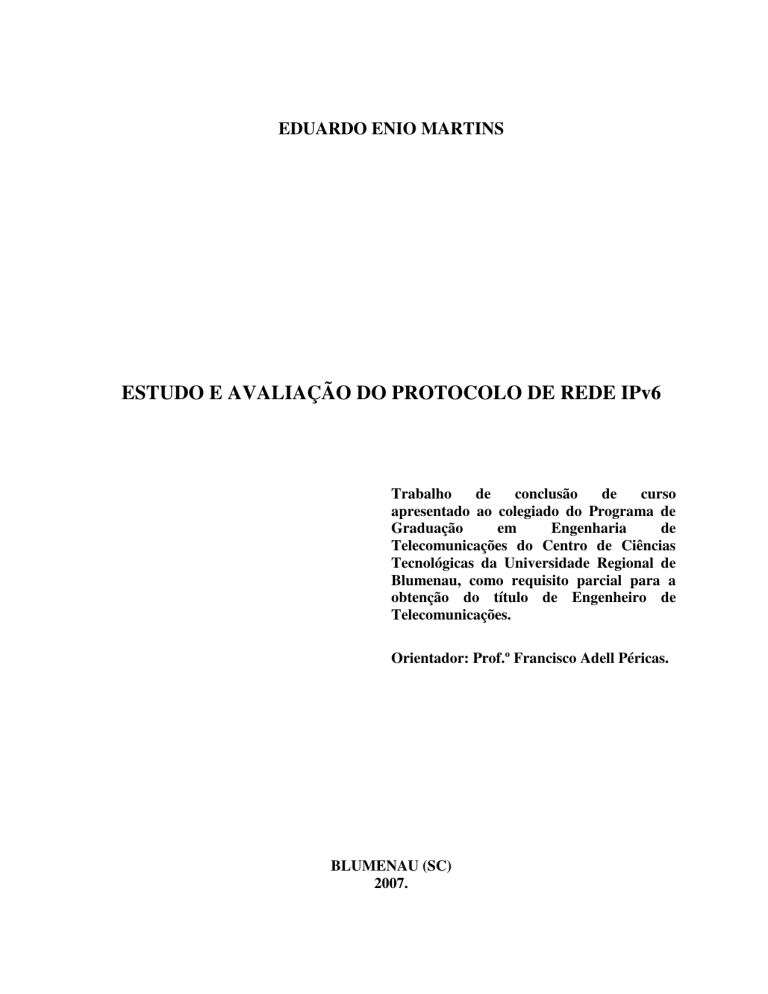 EDUARDO ENIO MARTINS ESTUDO E AVALIAÇÃO DO PROTOCOLO DE REDE IPv6 Trabalho de conclusão de curso apresentado ao colegiado do Programa de Graduação em Engenharia de Telecomunicações do Centro de Ciências Tecnológicas da Universidade Regional de Blumenau, como requisito parcial para a obtenção do título de Engenheiro de Telecomunicações. Orientador: Prof.º Francisco Adell Péricas. BLUMENAU (SC) 2007. UNIVERSIDADE REGIONAL DE BLUMENAU - FURB CENTRO DE CIÊNCIAS TECNOLÓGICAS PROGRAMA DE GRADUAÇÃO EM ENGENHARIA DE TELECOMUNICAÇÕES ESTUDO E AVALIAÇÃO DO PROTOCOLO DE REDE IPv6 Monografia submetida à Universidade Regional de Blumenau como parte dos requisitos para a obtenção do título de Engenheiro de Telecomunicações EDUARDO ENIO MARTINS Blumenau 2007 ii ESTUDO E AVALIAÇÃO DO PROTOCOLO DE REDE IPv6 EDUARDO ENIO MARTINS “Esta monografia foi julgada adequada para obtenção do Título de Engenheiro de Telecomunicações e aprovada pela Banca Examinadora.” ____________________________ Francisco Adell Péricas – Orientador Banca Examinadora: ____________________________ Fábio Rafael Segundo Presidente iii DEDICATÓRIA Dedico este trabalho a meus pais, que me deram a vida, a minhas filhas que me deram uma razão, a meu sogro e principalmente sogra que me deram incentivo para começar e minha esposa que me deu apoio, carinho e amor, sem os quais não teria forças para concretizar o meu sonho. iv AGRADECIMENTOS Agradeço a Deus por me permitir chegar até este momento. A todos que de uma forma ou de outra contribuíram neste trabalho. Aos colegas de curso que sempre me ajudaram a achar o caminho. Ao Amílcar Pinheiro que dispôs de seu tempo para me auxiliar a achar um tema para este trabalho. Ao meu Orientador que com paciência e sabedoria esteve sempre presente, me auxiliando e indicando o caminho a seguir. A minha esposa e minhas filhas que souberam suportar a minha ausência em muitos momentos em que minha presença se fazia necessária. E a Cia.Hering que em muitos momentos me permitiu encurtar o horário de trabalho para que eu pudesse me dedicar a este propósito. v SUMÁRIO LISTA DE ABREVIATURAS E SIGLAS LISTA DE TABELA LISTA DE FIGURAS RESUMO................................................................................................................................. 12 ABSTRACT ............................................................................................................................ 13 1. INTRODUÇÃO .................................................................................................................. 14 1.1. JUSTIFICATIVA ............................................................................................................ 15 1.2. DEFINIÇÃO DO PROBLEMA ...................................................................................... 15 1.3. OBJETIVOS.................................................................................................................... 16 1.4. ESTRUTURA.................................................................................................................. 16 2. INTERNET ........................................................................................................................ 17 2.1. INTERNET NO BRASIL................................................................................................ 19 2.1.1. Usuários Domiciliares de Internet ................................................................................ 19 3. ENDEREÇOS IP (INTERNET PROTOCOL)................................................................ 22 3.1. ANALISANDO O ENDEREÇO IP ................................................................................ 22 3.2. MÁSCARA DE SUB-REDE........................................................................................... 23 3.3. OBTENDO UM ENDEREÇO IP.................................................................................... 24 3.3.1. IP estático ....................................................................................................................... 26 3.3.2. IP dinâmico..................................................................................................................... 27 3.4. DOMÍNIO ....................................................................................................................... 27 4. TCP/IP ................................................................................................................................. 28 4.1 CONFIGURAÇÕES DO PROTOCOLO TCP/IP PARA UM COMPUTADOR EM REDE .......................................................................................................................................29 5. IPv4 ...................................................................................................................................... 34 5.1. INTRODUÇÃO AO IPv4 ............................................................................................... 34 5.2. ESPECIFICAÇÃO DO IPv4 ........................................................................................... 35 5.2.1. Tradução dos campos: .................................................................................................... 36 5.3. O ENDEREÇAMENTO NO IPv4 .................................................................................. 39 6. IPv6 ...................................................................................................................................... 42 6.1. INTRODUÇÃO AO PROTOCOLO IPv6 ...................................................................... 42 6.2. MUDANÇAS EM RELAÇÃO AO IPv4 ........................................................................ 44 6.3. O ENDEREÇAMENTO NO IPv6 .................................................................................. 46 6.4. TIPOS DE ENDEREÇOS ............................................................................................... 48 6.4.