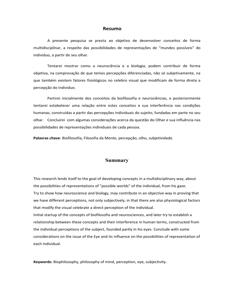Resumo A presente pesquisa se presta ao objetivo de desenvolver conceitos de forma multidisciplinar, a respeito das possibilidades de representações de “mundos possíveis” do individuo, a partir de seu olhar. Tentarei mostrar como a neurociência e a biologia, podem contribuir de forma objetiva, na comprovação de que temos percepções diferenciadas, não só subjetivamente, na que também existem fatores fisiológicos no celebro visual que modificam de forma direta a percepção do individuo. Partirei inicialmente dos conceitos da biofilosofia e neurociências, e posteriormente tentarei estabelecer uma relação entre estes conceitos e sua interferência nas condições humanas, construídas a partir das percepções individuais do sujeito, fundadas em parte no seu olhar. Concluirei com algumas considerações acerca da questão do Olhar e sua influência nas possibilidades de representações individuais de cada pessoa. Palavras chave: Biofilosofia, Filosofia da Mente, percepção, olho, subjetividade. Summary This research lends itself to the goal of developing concepts in a multidisciplinary way, about the possibilities of representations of "possible worlds" of the individual, from his gaze. Try to show how neuroscience and biology, may contribute in an objective way in proving that we have different perceptions, not only subjectively, in that there are also physiological factors that modify the visual celebrate a direct perception of the individual. Initial startup of the concepts of biofilosofia and neurosciences, and later try to establish a relationship between these concepts and their interference in human terms, constructed from the individual perceptions of the subject, founded partly in his eyes. Conclude with some considerations on the issue of the Eye and its influence on the possibilities of representation of each individual. Keywords: Biophilosophy, philosophy of mind, perception, eye, subjectivity. A Biofilosofia A biofilosofia , também chamada “filosofia da biologia” é um ramo da filosofia da ciência, que busca a inserção das ciências biológicas num campo mais filosófico, e menos empírico, permitindo que os progressos da biologia que ganham impulso na sociedade moderna, possam repensar valores tradicionais referentes á todos os aspectos da vida humana. Sendo assim, a biofilosofia é mais uma entre tantas possibilidades, que dispomos para conciliar áreas diferentes, e assim esclarecermos melhor as questões humanas, numa perspectiva mais filosófica e menos positivista. A partir do cogito cartesiano e das filosofias empiristas a razão concedeu a ciência o “status” de um novo “deus”, afastando assim qualquer possibilidade de existência fora da matéria, ou fora do contexto da prova racional. A biofilosofia surge numa tentativa de ir além dos fundamentos de uma ciência mecanicista e estimular o dialogo entre as ciências biológicas exatas e humanas e com as clinicas neurológicas e psicológicas. (Meyer, Pág. 11). Em relação ao olho e as percepções de mundo, a biofilosofia tem questionado filósofos empiristas, como David Hume, que postulava a idéia de que o Mundo que nós temos é causado pela sucessão de impressões que este mundo nos envia e são recebidas pelos sentidos, entre eles a visão. Contrariando esta idéia inicial, Meyer vai afirmar que a relação entre a visão do objeto e a sua percepção não é simplesmente causa conseqüência como sugerido pelos empiristas, ou seja,“os objetos não nos são dados como tais, são reconhecidos e reconstruídos por um cérebro dotado de capacidade de análise e representação, sendo assim, não é o olho, mas o cérebro que vê”. (Meyer, Pág. 78) Em razão disso, a biofisolofia nos levará a resgatar a perspectiva dos primeiros filósofos, que era pensar a natureza viva e seus princípios (arké), numa perspectiva menos mecânica, respeitando a subjetividade e individualidade da experiência do individuo que vê (qualia). Quando a biofilosofia se presta a discussão sobre o órgão visual, ela tenta mostrar, segundo Meyer, a qualidade objetiva da visão, não desprezando sua qualidade subjetiva. (Meyer,Pág. 81). Filosofia da mente e a percepção A filosofia da mente é o estudo filosófico dos fenômenos que envolvem os estados mentais em geral, entre eles: a consciência, como a mente conhece, a memória, a aquisição da linguagem, as percepções, etc. Manteremos o nosso foco na questão da percepção visual. A percepção é a função cerebral que atribui significado a estímulos sensoriais, através dela o individuo organiza, interpreta e significa o meio que vive. Consiste na aquisição, seleção e organização das informações obtidas, no caso específico de nossas pesquisa, nos ateremos em entender como é obtida a informação através da visão e como o cérebro interpreta e significa estas informações. A Neurociência aponta em suas pesquisas para diferenciação fisiológica no órgão visual, e que esta diferença influencia de forma objetiva na percepção dos objetos.Segundo Bosi: “A percepção visual (informações obtidas) e o órgão visual estão intimamente ligados em uma relação causal, pois a biologia comprova que as mudanças nas nossas células, a diferença de estruturas orgânicas e até a disfunção patológica e a deterioração de algumas destas estruturas, interferem também na multiplicidade de percepções individuais”(BOSI,p. g21). Ou seja, com os avanços das pesquisas no ramo das neurociências e biologia, torna-se cada vez mais perceptível a influência de fatores fisiológicos e estruturais na diferença de interpretações e representações individuais do sujeito. A interferência do cérebro visual nas condições humanas No meu entendimento, as nossas percepções em relação ao mundo que nos cerca, juntamente com as representações que fazemos deste mundo, são as responsáveis pela forma com que cada indiví