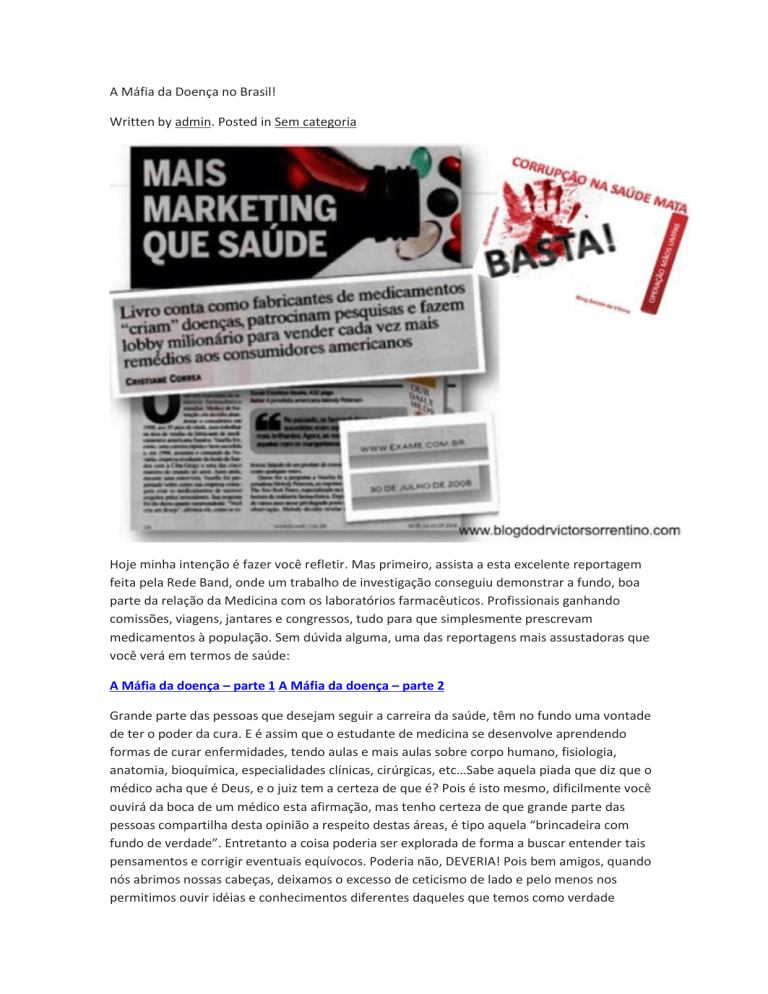 A Máfia da Doença no Brasil! Written by admin. Posted in Sem categoria Hoje minha intenção é fazer você refletir. Mas primeiro, assista a esta excelente reportagem feita pela Rede Band, onde um trabalho de investigação conseguiu demonstrar a fundo, boa parte da relação da Medicina com os laboratórios farmacêuticos. Profissionais ganhando comissões, viagens, jantares e congressos, tudo para que simplesmente prescrevam medicamentos à população. Sem dúvida alguma, uma das reportagens mais assustadoras que você verá em termos de saúde: A Máfia da doença – parte 1 A Máfia da doença – parte 2 Grande parte das pessoas que desejam seguir a carreira da saúde, têm no fundo uma vontade de ter o poder da cura. E é assim que o estudante de medicina se desenvolve aprendendo formas de curar enfermidades, tendo aulas e mais aulas sobre corpo humano, fisiologia, anatomia, bioquímica, especialidades clínicas, cirúrgicas, etc…Sabe aquela piada que diz que o médico acha que é Deus, e o juiz tem a certeza de que é? Pois é isto mesmo, dificilmente você ouvirá da boca de um médico esta afirmação, mas tenho certeza de que grande parte das pessoas compartilha desta opinião a respeito destas áreas, é tipo aquela “brincadeira com fundo de verdade”. Entretanto a coisa poderia ser explorada de forma a buscar entender tais pensamentos e corrigir eventuais equívocos. Poderia não, DEVERIA! Pois bem amigos, quando nós abrimos nossas cabeças, deixamos o excesso de ceticismo de lado e pelo menos nos permitimos ouvir idéias e conhecimentos diferentes daqueles que temos como verdade absoluta, as coisas mudam. Por vezes, até radicalmente. E é exatamente isto que acontece com os médicos que ultrapassam as cortinas da Medicina convencional. Infelizmente, o meio termo que deveria ser praticado e exercido por todos em todas as áreas, uma vez que sabemos que o ideal é o equilíbrio, “nem ao 8, nem ao 80″, não é ensinado e existe sim uma causa por trás disto: Mercado, dinheiro e poder. Hoje, através de 1 história verídica, a qual presenciei e vou com toda certeza fazê-los pensar muito. Vou resumi-la para que vocês entendam o recado diretamente. Gustavo (nome fictício) descobriu que era portador de um tumor de reto (câncer de intestino) há alguns meses. Estava bem, mas com única queixa de sangramento ao evacuar. Desespero familiar e pessoal, primeiro caso na família, homem jovem (50 anos), de hábitos de vida e alimentação saudáveis. Foi levado aos especialistas conhecidos como “professores”, “PhDs” na cidade do Rio de Janeiro e a decisão tomada. Apesar de não haverem evidências de metástase, ele entraria no protocolo da Quimioterapia + Radioterapia e depois seria submetido a cirurgia curativa. E já que ele tem médicos na família, a decisão teve forte apoio familiar e confiança total no protocolo indicado. Em seu caso, indicaram uma Quimioterapia nova, com doses orais e um tratamento particular. Naquele “jogo” habitual de um médico mandando pro outro para estabelecerem um tratamento “ideal”, o tratamento foi iniciado. Lembro como se fosse hoje, de ter passado algumas noites pensando sobre o que eu poderia fazer para ajudá-lo, já que toda estrutura da minha Clínica fica em Porto Alegre e que, mesmo assim, muito do que eu aconselharia, poderia trazer sérios problemas sociais de minha opinião, com a opinião mais ortodoxa dos familiares médicos. Passei dias pensando na frase que ouvira não só de um de meus maiores mestres, Dr. Lair Ribeiro, bem como da boca de outros muitos cientistas desvinculados às indústrias farmacêuticas: “Grande parte dos pacientes com Câncer não morrem do câncer, mas sim das Quimioterapias”. Decidi ir até ele, e ainda no primeiro dia de seu tratamento fui claro e objetivo. Disse-lhe que se fosse Eu, em seu caso, sem metástases, não faria Quimioterapia. O motivo é longo, mas fundamentalmente baseado no fato de que ninguém sabe o que pode acontecer de efeitos colaterais com estes venenos. Se fosse realizado somente Radioterapia na busca de diminuir o Tumor e, posteriormente uma Cirurgia para removê-lo, com toda certeza a segurança era muito alta de resolução do problema. Portanto, Quimioterapia para que? Para talvez uma possibilidade de, no futuro, não ter recidiva? E como acreditar nisso, se nunca comparamos os indivíduos com eles mesmos para saber se realmente vale a pena ou não nestes casos? Vejam bem, estou falando sobre um caso isolado, pois em outros tipos de tumores, as abordagens podem ser diferentes e mesmo minha opinião sobre Quimioterapia pode ser positiva. Mas isso me motivou a pesquisar, pesquisar e ver que por coincidência, a única classe de medicamentos NO MUNDO que até hoje nunca precisou ser comparada a placebo (pílula de farinha ou açúcar), foram os Quimioterápicos. Muito estranho, pois a resposta da indústria farmacêutica é que esta doença é muito importante, que não há espaço para se comparar com placebo. Peraí, então resumindo: Nunca testamos a diferença das quimioterapias em termos de recidiva, com tratamento placebo! Milhares de pessoas morrem por efeitos adversos destes venenos! Se realizar a cirurgia estaremos “nos livrando” do problema! Só Deus sabe se no futuro haverá recidiva (existem muitos detalhes aqui a serem ditos)! Bom, não tinha como eu não ir lá e falar com aquele homem, colocar pra fora a angústia que me prendia ao conhecimento que tinha comigo. Ao mesmo tempo sabia que seria somente uma voz, que apesar de ter muita confiança por parte dele, não transcenderia a opinião daqueles super especialistas. E na verdade, inclusive quando fui até o Dr. Lair Ribeiro para pedir-lhe opinião, fui aconselhado a não interferir, por diversos motivos. A evolução do tratamento passou a ser drástica e triste, pois já no quarto dia da Quimioterapia o homem estava em uma situação absolutamente debilitada, nem parecia mais 