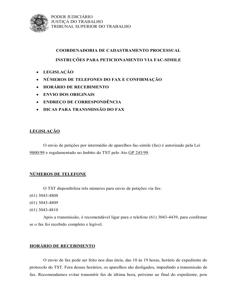 PODER JUDICIÁRIO JUSTIÇA DO TRABALHO TRIBUNAL SUPERIOR DO TRABALHO COORDENADORIA DE CADASTRAMENTO PROCESSUAL INSTRUÇÕES PARA PETICIONAMENTO VIA FAC-SIMILE • LEGISLAÇÃO • NÚMEROS DE TELEFONES DO FAX E CONFIRMAÇÃO • HORÁRIO DE RECEBIMENTO • ENVIO DOS ORIGINAIS • ENDREÇO DE CORRESPONDÊNCIA • DICAS PARA TRANSMISSÃO DO FAX LEGISLAÇÃO O envio de petições por intermédio de aparelhos fac-simile (fax) é autorizado pela Lei 9800/99 e regulamentado no âmbito do TST pelo Ato GP 245/99. NÚMEROS DE TELEFONE O TST disponibiliza três números para envio de petições via fax: (61) 3043-4808 (61) 3043-4809 (61) 3043-4810 Após a transmissão, é recomendável ligar para o telefone (61) 3043-4439, para confirmar se o fax foi recebido completo e legível. HORÁRIO DE RECEBIMENTO O envio de fax pode ser feito nos dias úteis, das 10 às 19 horas, horário de expediente do protocolo do TST. Fora desses horários, os aparelhos são desligados, impedindo a transmissão de fax. Recomendamos evitar transmitir fax de última hora, próximo ao final do expediente, pois PODER JUDICIÁRIO JUSTIÇA DO TRABALHO TRIBUNAL SUPERIOR DO TRABALHO caso haja algum problema na transmissão, pode não haver tempo hábil para a correção de tais problemas. Em hipótese nenhuma será permitido transmitir fax após as 19 horas. ENVIO DOS ORIGINAIS Conforme a Lei 9800/99, o envio de petições através de fax não prejudica o cumprimento dos prazos, devendo os originais ser apresentados em Juízo em até cinco dias. No caso das petições enviadas via fax ao TST, os peticionantes devem observar o seguinte: - As petições originais devem ser recebidas no Protocolo do TST dentro do prazo de cinco dias. - A data da postagem do documento na agência dos Correios não serve para garantir a tempestividade da petição. - O peticionante não pode utilizar os serviços de protocolo dos TRTs ou das Varas do Trabalho, para protocolizar originais de petições enviadas via fax ao TST. O Protocolo do TST não é integrado com o dos TRTs. - Conforme entendimento jurisprudencial, o prazo de cinco dias para envio dos originais referese a dias corridos, podendo incidir o início da contagem do prazo em sábados, domingos ou feriados. - Para envio dos originais ao TST, recomendamos a utilização dos serviços de encomenda expressa dos Correios (Sedex) ou de empresas de logística e de remessa expressa de documentos. ENDEREÇO DE CORRESPONDÊNCIA Após a transmissão do fax, os originais devem ser encaminhados o mais rapidamente possível para o seguinte endereço: TRIBUNAL SUPERIOR DO TRABALHO – PROTOCOLO SAFS – QUADRA 8 – LOTE 1 BRASÍLIA DF PODER JUDICIÁRIO JUSTIÇA DO TRABALHO TRIBUNAL SUPERIOR DO TRABALHO CEP 70070-600 Caso o peticionante queira obter uma cópia protocolizada da petição enviada, deve encaminhar também um envelope selado e endereçado, para que possamos proceder à devolução da cópia pelos Correios, via carta simples. O selo pode ser obtido na própria agência dos Correios onde for feita a postagem do documento, e o valor é calculado de acordo com o peso. O endereço de retorno o peticionante deve estar completo, inclusive com o CEP. ATENÇÃO: No envelope de retorno, o selo deve ser colado no mesmo lado onde for escrito o endereço do peticionante. DICAS PARA TRANSMISSÃO DO FAX Consulte sempre o manual do seu aparelho. Ele pode ajudá-lo a obter uma transmissão melhor de suas petições. Ao transmitir um fax, insira as folhas pausadamente, dando um intervalo de 3 a 5 segundos entre uma página e outra. Esse procedimento evita a sobreposição de páginas, que ocorre quando as folhas são inseridas muito rapidamente, fazendo com que o aparelho não consiga identificar onde começa ou termina cada página. A sobreposição de páginas pode suprimir linhas do texto, e isso pode até acarretar o indeferimento do pedido. Alguns aparelhos de fax emitem um sinal sonoro para indicar quando a página seguinte deve ser inserida no aparelho. Verifique se seu aparelho dispõe desse recurso. Se possível, imprima suas petições em folhas de padrão formato A4. Por ser o padrão utilizado no TST, o risco do texto sair truncado ou com linhas suprimidas é menor. Faça um teste, encaminhando um fax para um local próximo onde você possa verificar se o texto é transmitido por seu aparelho de forma legível e completa. Aparelhos muito antigos ou que não passaram pela manutenção indicada pelo fabricante podem estar obsoletos. Antecipe o máximo possível, o envio de suas petições. Lembre-se que podem ocorrer problemas de última hora que prejudicam ou inviabilizam a transmissão do fax. Conheça também o sistema de peticionamento eletrônico da Justiça do Trabalho (EDOC), além de mais prático, seguro e barato do que a utilização do fax, possibilita que o advogado possa usufruir de um maior prazo para o envio dos recursos, podendo encaminhá-los PODER JUDICIÁRIO JUSTIÇA DO TRABALHO TRIBUNAL SUPERIOR DO TRABALHO até as 24 horas do seu último dia (Art. 12, § 1º da IN 30/TST). O sistema E-DOC pode ser usado para quaisquer recursos, à exceção dos destinados ao Supremo Tribunal Federal (Recurso Extraordinário ou Agravo de Instrumento em Recurso Extraordinário). Consulte a página do EDOC no site do TST e a Instrução Normativa nº 30, para conhecer o sistema e informar-se sobre o cadastro e o envio de documentos via peticionamento eletrônico.