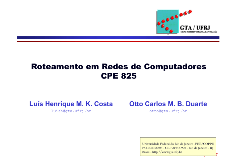Roteamento em Redes de Computadores CPE 825 Luís Henrique M. K. Costa Otto Carlos M. B. Duarte [email protected] [email protected] Universidade Federal do Rio de Janeiro -PEE/COPPE P.O. Box 68504 - CEP 21945-970 - Rio de Janeiro - RJ Brasil - http://www.gta.ufrj.br GTA/UFRJ Roteiro Conceitos Básicos Roteamento Unicast Intra-domínio Inter-domínio Roteamento Multicast Roteamento em Redes Ad Hoc GTA/UFRJ Bibliografia Christian Huitema, Routing in the Internet, Prentice Hall, 2nd. Edition Costa, L. H. M. K. e Duarte, O. C. M. B., “Roteamento Multicast na Internet”, Mini-curso SBRC’03 Williamson, B. Developing IP Multicast Networks, Vol. 1, Cisco Press Artigos em alguns dos tópicos GTA/UFRJ Parte I Conceitos Básicos: A Internet GTA/UFRJ Princípios de Projeto da Internet Datagramas x circuitos virtuais Inteligência nos terminais A rede fornece a conectividade, nada mais GTA/UFRJ Envio de informação Internet Protocol – IP Internet Program Redes são interconectadas através de “programas interredes” Cada sistema conectado à Internet executa uma instância deste programa inter-redes, ou internet Aplicações geralmente acessam este programa através de um programa de transporte (ex. TCP, UDP) GTA/UFRJ Operação do IP GTA/UFRJ Transmissão de um Pacote IP Rede 1 Rede 2 Roteador C Estação A A1 > C1, IP A > B, TCP Cabeçalho Ethernet Cabeçalho IP Estação B cabeçalho TCP + dados C2 > B2, IP A > B, TCP Cabeçalho Ethernet Cabeçalho IP cabeçalho TCP + dados GTA/UFRJ Endereçamento IP Cada interface de rede é identificada por um endereço IP de 32 bits Formato do Endereço IP Dividido em duas partes, “identificador de rede” e “identificador de estação” 3 classes de “números de rede”, A, B e C Mais tarde, classe D definida para endereços multicast A classe E possui endereços reservados para utilização experimental GTA/UFRJ Classes de Endereços IP Classe Bits mais significativos A 0 7 bits de redes 24 bits de estações B 10 14 bits de redes 16 bits de estações C 110 21 bits de redes 8 bits de estações D 1110 28 bits de endereços de grupo multicast E 1111 reservados para testes Formato GTA/UFRJ Classes A, B e C classe A 0 netid hostid 7 bits 24 bits 27 = 128 prefixos de classe A (0.x.x.x a 127.x.x.x) (224 - 2) = 16.777.214 estações em cada rede classe B 1 0 netid hostid 14 bits 16 bits 214 = 16.384 prefixos de classe B (128.x.x.x a 191.x.x.x) (216 - 2) = 65.534 estações em cada rede classe C 1 1 0 netid hostid 21 bits 8 bits 221 = 2.097.152 prefixos de classe C (192.x.x.x a 223.x.x.x) (28 - 2) = 254 estações em cada rede GTA/UFRJ Estrutura de Endereçamento Quando o IP foi padronizado, em 1981 Números de rede (netid) são alocados por uma autoridade de numeração Internet Números de estação (hostid) são alocados pelo gerente de rede A unicidade dos números de rede associada à unicidade dos números de estação garantem a unicidade global dos endereços IP unicast GTA/UFRJ Estrutura de Endereçamento Com a maior utilização de redes locais, estações de trabalho, e PCs, tornou-se necessário estruturar a rede dentro de cada organização Em 1984, o conceito de sub-rede (subnet id) foi adicionado ao endereço IP GTA/UFRJ Máscaras de sub-rede Máscara Endereço Rede Sub-rede Estação 255.255.0.0 0x FF FF 00 00 10.27.32.100 A: 10 27 32.100 255.255.254.0 0x FF FF FE 00 136.27.33.100 B: 136.27 16 (33) 1.100 255.255.254.0 0x FF FF FE 00 136.27.34.141 B: 136.27 17 (34) 0.141 255.255.255.192 0x FF FF FF C0 193.27.32.197 C: 193.27.32 3 (192) 5 n-ésima rede da máscara (número da rede) GTA/UFRJ Endereços e Interfaces Endereços IP identificam interfaces de rede, não identificam estações Uma estação com várias interfaces de rede possui vários endereços IP (a estação é dita multi-homed) Ex. roteadores, estações que balanceiam o tráfego entre diversas redes Cada endereço pertence a uma sub-rede, que geralmente corresponde a uma “rede física” GTA/UFRJ Endereços e Interfaces Entradas na tabela de roteamento dos roteadores normalmente apontam para sub-redes Eventualmente, podem apontar para endereços de máquinas Porque não um endereço por estação? Um endereço por interface permite escolher o caminho utilizado para chegar a uma estação Endereços por interface permitem a agregação de endereços nas tabelas de roteamento Se os endereços não fossem ligados à topologia, seria necessária uma entrada na tabela de roteamento para cada estação GTA/UFRJ Endereços e Interfaces Desvantagens Todos os endereços de uma estação devem ser incluídos no servidor de nomes O “melhor endereço” deve ser escolhido para uma conexão O endereço fonte deve ser cuidadosamente escolhido pela aplicação determina o caminho seguido pelos pacotes de resposta GTA/UFRJ Endereços Especiais “0” pode ser utilizado como endereço fonte, quando o número de rede é desconhecido, portanto: 0.0.0.0 significa “esta estação nesta rede” 0.X.Y.Z significa “a estação X.Y.Z nesta rede” utilizado por ex. quando uma estação está iniciando Difusão limitada (limited broadcast) Formado por todos os bits em “1” – 255.255.255.255 só pode ser utilizado como endereço destino o pacote é enviado a todas as estações da sub-rede não é retransmitido por um roteador GTA/UFRJ Endereços Especiais Difusão direcionada (directed broadcast) Todos os bits da “parte estação” do endereço são colocados em “1” Ex. “A.255.255.255”, “C.C.C.255” Com sub-redes a mesma regra é válida (todos os bits do complemento da máscara são colocados em “1”) Conseqüências Não existe sub-rede identificada apenas por 0’s, assim como não existe sub-rede identificada apenas por 1’s O tamanho da sub-rede é maior ou igual a 2 bits GTA/UFRJ Endereços Especiais Endereço de loopback Na verdade, existe um número de rede de loopback: Rede Classe A 127 Qualquer endereço da forma 127.X.Y.Z deve ser considerado local e 