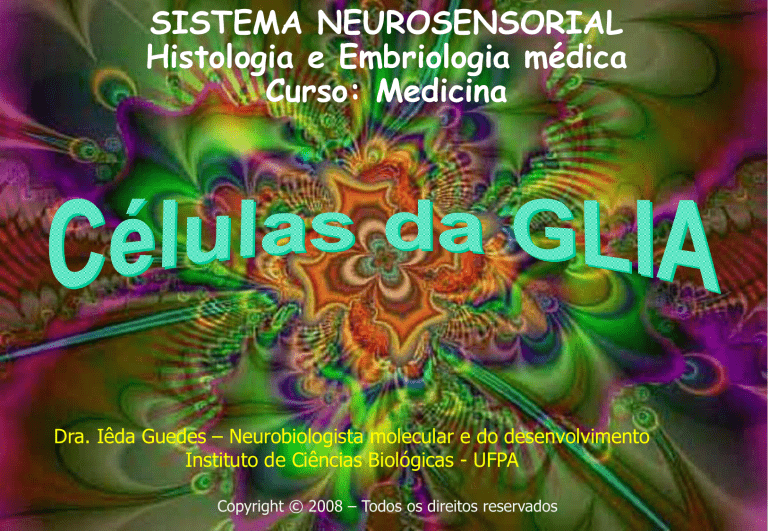 SISTEMA NEUROSENSORIAL Histologia e Embriologia médica Curso: Medicina Dra. Iêda Guedes – Neurobiologista molecular e do desenvolvimento Instituto de Ciências Biológicas - UFPA Copyright © 2008 – Todos os direitos reservados Células da Glia TECIDO NERVOSO - Glia Células da Neuroglia Central TECIDO NERVOSO - Glia Células da Neuroglia Central Ocorrência no SNC Gliócitos livres a - Macróglia . Astrócitos - Protoplasmáticos - Fibrosos . Oligodendrócitos b – Micróglia Epitelial Células ependimárias TECIDO NERVOSO - Glia Células da Neuroglia Central TECIDO NERVOSO - Glia Células da Neuroglia Central TECIDO NERVOSO - Glia Células da Neuroglia Central Astrócito e Oligodendrócito Neuróglia Central Macróglia Andreas Reichbach TECIDO NERVOSO - Glia GLIAL RADIAL Neuróglia Central Macróglia TECIDO NERVOSO - Glia GLIAL RADIAL Gangliosídeos 9O-acetilatos – neurônio migrante Golgi–Del Rio Ortega pequenas expansões perpendiculares–mesencéfalo/vimentina Neuróglia Central Macróglia TECIDO NERVOSO - Glia ASTRÓCITOS Feixes de filamentos proteina ácida fibrilar\ Diferenciação astrocitária – hormônio tireóide – fatores de crescimento +IL Nestina/vimentina/GFAP Comunicação/junções comunicantes – citocinaS/FGF/EGF/TNF/IL – morfog~enese neuronal/diferenciação astrocitária e reparo dano neuronal Neuróglia Central Macróglia TECIDO NERVOSO - Glia ASTRÓCITOS ASTRÓCITOS FIBROSO Prolongamentos finos,delgados e longos, que não se ramificam com freqüência. Localização preferencial Substância Branca do encéfalo e da medula.. ASTRÓCITOS PROTOPLASMÁTICOS Citoplasma abundante e grânulos, com prolongamentos não tão longos. Prolongamentos muito ramificados e espessos Localização preferencial Substância Cinzenta do encéfalo e da medula espinhal. Neuróglia Central Macróglia TECIDO NERVOSO - Glia ASTRÓCITOS Sustentação Cicatrização Neurônios – capilares sanguíneo – pia-máter – pés vasculares Controle da composição iônica Regulação atividade neurônio – noradrenalina, GABA, hormônio angiotensina II, endotelinas receptores natriurético, Atividade sobrevivência neurônios – capacidade controlar o meio extracelular/absorver excessos neurotransmissores/ sintetizar moléculas neuroativas – angiotensinas e ancefalinas (precursores opiódes) Transportam compostos ricos metabolizam glicose - lactato em energia – Neuróglia Central TECIDO NERVOSO - Glia ASTRÓCITOS Neuróglia Central Macróglia TECIDO NERVOSO - Glia ASTRÓCITOS ASTRÓCITOS PROTOPLASMÁTICOS Neuróglia Central Macróglia TECIDO NERVOSO - Glia ASTRÓCITOS ASTRÓCITOS PROTOPLASMÁTICOS Neuróglia Central Macróglia TECIDO NERVOSO - Glia ASTRÓCITOS ASTRÓCITOS FIBROSO Neuróglia Central Macróglia TECIDO NERVOSO - Glia ASTRÓCITOS ASTRÓCITOS FIBROSO Neuróglia Central Macróglia TECIDO NERVOSO - Glia OLIGODENDRÓCITO Bainha mielina – isolante térmico Prolongamentos - neurônio Neuróglia Central Macróglia TECIDO NERVOSO - Glia OLIGODENDRÓCITO Neuróglia Central Macróglia TECIDO NERVOSO - Glia OLIGODENDRÓCITO CNPase - neuroepitélio 4th ventrículo – divisão - Segmentos axonais - fascículos Neuróglia Central Macróglia diferenciação - Cultura - Anti-CNPase - Anti-BMP TECIDO NERVOSO - Glia OLIGODENDRÓCITO Neuróglia Central Macróglia TECIDO NERVOSO - Glia OLIGODENDRÓCITO Neuróglia Central Macróglia TECIDO NERVOSO - Glia MICRÓGLIA OU MICROGLIÓCITO Neuróglia Central Macróglia TECIDO NERVOSO - Glia MICRÓGLIA OU MICROGLIÓCITO Centro visual mamífero – isolectina B4 Neuróglia Central Macróglia TECIDO NERVOSO - Neuróglia MICRÓGLIA OU MICROGLIÓCITO Neuróglia Central Epitelial TECIDO NERVOSO - Glia CÉLULAS EPENDIMÁRIAS - EPENDIMÓCITO Revestimento - canal central da medula e ventrículos Neuróglia Central Epitelial TECIDO NERVOSO - Glia CÉLULAS EPENDIMÁRIAS - EPENDIMÓCITO Revestimento - canal central da medula e ventrículos Neuróglia Central Epitelial TECIDO NERVOSO - Glia CÉLULAS EPENDIMÁRIAS - EPENDIMÓCITO . Secretora -plexo corióide TECIDO NERVOSO - Glia Células da Neuroglia Ocorrência no SNP Célula de Schwann: produção de de mielina (nódulo de Ranvier e incisura de Schimidt Lantermann). Células Satélites (Anficitos): manutenção e controle do microambiente ao redor do corpo do neurônio nos gânglios. TECIDO NERVOSO - Glia Neuróglia Periférica - Células de Schwann - fibras mielínicas - Células satélite (Anfícitos) TECIDO NERVOSO - Glia Neuróglia Periférica - Células de Schwann - fibras mielínicas - Células satélite (Anfícitos) As imagens e informações contidas na presente apresentação estão referenciadas e fazer parte da seguinte bibliografia, ou fazem parte de sites livres abertos. HISTOLOGIA: - Carvalho, H. F. & Collares-Buzato, C. B. Células: uma abordagem multidisciplinar. São Paulo: Manole, 2005. - Junqueira, L.C. & Carneiro, J. Histologia Básica. 10ed. Rio de Janeiro: Guanabara Koogan, 2004. (edição mais encontrada na biblioteca), podendo ser versão mais atual (12ed). - Ross, M. H. & Pawlina, W. Histologia: texto e Atlas. 6ed. Rio de Janeiro: Guanabara Koogan, 2012. - Young, B; Lowe, J; Stevens, A; Heath, J. W. Wheater Histologia Funcional. 5ed. Elsevier, 2007. - Gartner, L.P. & Hiatt, J.L. Tratado de Histologia. 2ª ed. Rio de Janeiro: Guanabara Koogan, 2003. EMBRIOLOGIA: - Sadler, T.W. Lagman - Embriologia médica, 11a edição, Rio de Janeiro: Guanabara Koogan, 2010. - Wolpert, L; Jessell, T; Lawrence, P; Meyerowitz, E; Robertson, E; Smith, J. Princípios de Biologia do desenvolvimento. 3ed. Porto Alegre: Artmed, 2008. - Bear, M. F.; Connors, B. W.; Paradiso, M. A. Neurociência. 3ed. Artmed, 2010. - Lent, R. Cem bilhões de neurônios. 2ª edição. Editora Atheneu. 2010 - Moore, K. L.; Persaud, T. V. N.; Shiota, K. Atlas colorido de Embriologia. 2ed. Rio de Janeiro: Guanabara Koogan, 200.
