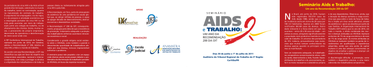 Os portadores do vírus HIV e da Aids sofrem grande discriminação, sobretudo no mundo do trabalho, tanto na contratação, quanto na manutenção do contrato de trabalho. O argumento do empregador, via de regra, é o do prejuízo à atividade econômica que o empregado portador do vírus HIV ou da Aids pode acarretar, por meio de indisposição junto aos colegas de trabalho, ou do afastamento dos clientes. Existe, muitas vezes, o preconceito do próprio empresário, decorrente da ignorância e desinformação do meio social onde vive. A 99ª Conferência Internacional do Trabalho, realizada em junho de 2010, em Genebra, adotou a Recomendação nº 200, relativa ao vírus HIV, a Aids e o mundo do trabalho. De acordo com essa Recomendação, a OIT visa intensificar sua ação em favor do respeito aos compromissos assumidos, nacional e internacionalmente, com vistas a proteger os direitos e a dignidade dos trabalhadores e de todas as pessoas direta ou indiretamente atingidas pelo vírus HIV e pela Aids. Seminário Aids e Trabalho: A Recomendação, em foco, parte do pressuposto da existência de uma pandemia em escala global que, ao atingir milhões de pessoas, é capaz de apagar décadas de desenvolvimento, destruir economias e desestabilizar sociedades. A Recomendação nº 200 da OIT, consequentemente, propugna pela ideia de que a inexistência de prevenção, tratamento adequado e proteção dos trabalhadores enfermos acarretará retrocessos econômico e social. Um ano da Recomendação 200 da OIT APOIO SEMINÁRIO N o Brasil, até junho de 2010, haviam sido registrados 592.914 casos de Aids desde 1980, sendo que a taxa de incidência oscila em torno de 20 casos por 100 mil habitantes. Apenas em 2009 foram notificados 38.538 casos da doença. Outro dado relevante é a faixa etária em que isso acontece – entre 20 e 59 anos de idade –, em ambos os sexos, atingindo significativamente a população mais produtiva inserida no mercado de trabalho. O universo dos portadores do HIV, todavia, provavelmente seja maior, visto que muitos tomam conhecimento da doença apenas quando os principais sintomas se manifestam. REALIZAÇÃO Considerando o grande estigma social existente sobre o HIV/Aids, como também a grande e desconhecida quantidade de trabalhadores afetados por essa doença, torna-se imprescindível enfrentar o problema. O seminário possui este propósito: criar um espaço onde diversos atores sociais possam debater a problemática da discriminação do trabalhador portador do HIV/Aids, em busca das respostas necessárias. Dias 30 de junho e 1º de julho de 2011 Auditório do Tribunal Regional do Trabalho da 9ª Região Curitiba/PR Sem um tratamento adequado, os trabalhadores soropositivos economicamente ativos, cedo ou tarde, desenvolverão a Aids, ficando impossibilitados de trabalhar e de, precocemente, auferir os meios necessários à subsistência própria e de seus dependentes. Observe-se, ainda, que a duração da doença aumenta a carga econômica que pesa sobre o resto da força de trabalho e impõe um ônus social adicional, através da assistência e apoio aos doentes por parte de suas famílias. A Organização Internacional do Trabalho (OIT) estima que no ano de 2015, em todo o mundo, o efeito combinado das mortes e doenças atribuídas ao HIV/Aids implicará acréscimo de 1% da carga econômica e de mais de 1% da carga social. As mortes atribuídas ao HIV/Aids se traduzem também na perda de investimentos em qualificações e experiências adquiridas, sendo que esta perda de capital humano é uma das ameaças concernentes ao objetivo de erradicar a pobreza e alcançar um desenvolvimento sustentável. A discriminação dificulta a prevenção, como também o diagnóstico precoce, e uma maior sobrevida dos trabalhadores soropositivos. Os portadores do vírus HIV e da Aids sofrem grande discriminação, sobretudo no mundo do trabalho, tanto na contratação, quanto na manutenção do contrato de trabalho. O argumento do empregador, via de regra, é o do prejuízo à atividade econômica que o empregado portador do vírus HIV ou da Aids pode acarretar, por meio de indisposição junto aos colegas de trabalho, ou do afastamento dos clientes. Existe, muitas vezes, o preconceito do próprio empresário, decorrente da ignorância e desinformação do meio social onde vive. A 99ª Conferência Internacional do Trabalho, realizada em junho de 2010, em Genebra, adotou a Recomendação nº 200, relativa ao vírus HIV, a Aids e o mundo do trabalho. De acordo com essa Recomendação, a OIT visa intensificar sua ação em favor do respeito aos compromissos assumidos, nacional e internacionalmente, com vistas a proteger os direitos e a dignidade dos trabalhadores e de todas as pessoas direta ou indiretamente atingidas pelo vírus HIV e pela Aids. Seminário Aids e Trabalho: A Recomendação, em foco, parte do pressuposto da existência de uma pandemia em escala global que, ao atingir milhões de pessoas, é capaz de apagar décadas de desenvolvimento, destruir economias e desestabilizar sociedades. A Recomendação nº 200 da OIT, consequentemente, propugna pela ideia de que a inexistência de prevenção, tratamento adequado e proteção dos trabalhadores enfermos acarretará retrocessos econômico e social. Um ano da Recomendação 200 da OIT APOIO SEMINÁRIO N o Brasil, até junho de 2010, haviam sido registrados 592.914 casos de Aids desde 1980, sendo que a taxa de incidência oscila em torno de 20 casos por 100 mil habitantes. Apenas em 2009 foram notificados 38.538 casos da doença. Outro dado relevante é a faixa etária em que isso acontece – entre 20 e 59 anos de idade –, em ambos os sexos, atingindo significativamente a população mais produtiva inserida no mercado de trabalho. O universo dos portadores do HIV, todavia, provavelmente seja maior, visto que muitos tomam conhecimento da doença apenas quando os principais sintomas se manifestam. REALIZAÇÃO Considerando 
