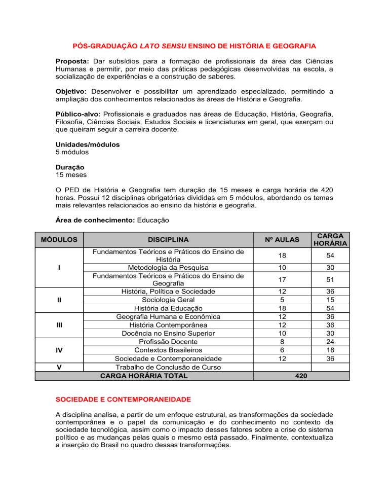 PÓS-GRADUAÇÃO LATO SENSU ENSINO DE HISTÓRIA E GEOGRAFIA Proposta: Dar subsídios para a formação de profissionais da área das Ciências Humanas e permitir, por meio das práticas pedagógicas desenvolvidas na escola, a socialização de experiências e a construção de saberes. Objetivo: Desenvolver e possibilitar um aprendizado especializado, permitindo a ampliação dos conhecimentos relacionados às áreas de História e Geografia. Público-alvo: Profissionais e graduados nas áreas de Educação, História, Geografia, Filosofia, Ciências Sociais, Estudos Sociais e licenciaturas em geral, que exerçam ou que queiram seguir a carreira docente. Unidades/módulos 5 módulos Duração 15 meses O PED de História e Geografia tem duração de 15 meses e carga horária de 420 horas. Possui 12 disciplinas obrigatórias divididas em 5 módulos, abordando os temas mais relevantes relacionados ao ensino da história e geografia. Área de conhecimento: Educação MÓDULOS I II III IV V DISCIPLINA Fundamentos Teóricos e Práticos do Ensino de História Metodologia da Pesquisa Fundamentos Teóricos e Práticos do Ensino de Geografia História, Política e Sociedade Sociologia Geral História da Educação Geografia Humana e Econômica História Contemporânea Docência no Ensino Superior Profissão Docente Contextos Brasileiros Sociedade e Contemporaneidade Trabalho de Conclusão de Curso CARGA HORÁRIA TOTAL Nº AULAS CARGA HORÁRIA 18 54 10 30 17 51 12 5 18 12 12 10 8 6 12 36 15 54 36 36 30 24 18 36 420 SOCIEDADE E CONTEMPORANEIDADE A disciplina analisa, a partir de um enfoque estrutural, as transformações da sociedade contemporânea e o papel da comunicação e do conhecimento no contexto da sociedade tecnológica, assim como o impacto desses fatores sobre a crise do sistema político e as mudanças pelas quais o mesmo está passado. Finalmente, contextualiza a inserção do Brasil no quadro dessas transformações. PROGRAMA Aula 1: As sociedades como sistemas Aula 2: Grandes ciclos de transformação sistêmica da sociedade Aula 3: A sociedade agrícola Aula 4: A sociedade industrial Aula 5: A história da globalização Aula 6: A ordem internacional pós–segunda guerra Aula 7: A sociedade pós-industrial Aula 8: Identidades em transformação Aula 9: Significados e representações no mercado de símbolos Aula 10: O poder na sociedade pós-industrial Aula 11: A sociedade brasileira como sistema Aula 12: As chances da democracia no Brasil BIBLIOGRAFIA BÁSICA GIDDENS, Anthony. Política, sociologia e teoria social. São Paulo: UNESP, 1998. LAHIRE, Bernard.Retratos Sociológicos: Disposição e Variações Individuais Porto Alegre, Artmed, 2008. CAREL, Havi e GAMEZ, David. Filosofia Contemporânea em Ação: Debates Contemporâneos. Porto Alegre, Artmed. BIBLIOGRAFIA COMPLEMENTAR GIDDENS, Anthony. Sociologia. Porto Alegre, Artmed, 2007. HISTÓRIA, POLÍTICA E SOCIEDADE Estado, capitalismo e luta de classes. Estado, liberalismo e bem comum. Formas de governo e regimes políticos: democracia, ditadura, presidencialismo, parlamentarismo, república e monarquia. Ideologia: trabalho e dominação. Burocracia: controle, poder e alienação. Globalização, neoliberalismo e Imperialismo. PROGRAMA Aula 1: História e sociedade Aula 2: Estado, sociedade e luta de classes Aula 3: A expansão dos Estados nacionais Aula 4: Governar na Era Moderna Aula 5: Governo e formas políticas Aula 6: O Iluminismo e a era das revoluções Aula 7: Movimentos sociais nos séculos XVIII e XIX Aula 8: Formas políticas do século XX Aula 9: Sociedade e trabalho no mundo contemporâneo Aula 10: Globalização, neoliberalismo e o indivíduo Aula 11: Arte e sociedade I Aula 12: Arte e sociedade II BIBLIOGRAFIA BÁSICA CHATELET, François. História das idéias políticas. Rio de Janeiro, Zahar,2001. CARNOY, M. Estado e teoria política. Campinas, Papirus, 1990. BOBBIO, Norberto. Liberalismo e democracia. São Paulo, Brasiliense, 1990. BIBLIOGRAFIA COMPLEMENTAR LAHIRE, Bernard. A cultura dos Indivíduos. Porto Alegre, Artmed, 2007. SOCIOLOGIA GERAL Estudo da história da Sociologia. O pensamento sociológico: referências dos teóricos clássicos para o estudo da sociedade. Socialização, valores sociais e individuais. PROGRAMA Aula 1: A promessa e as tarefas das Ciências Sociais Aula 2: As sociedades industriais capitalistas Aula 3: As diferentes formas de administração do processo de trabalho no capitalismo moderno Aula 4: A crise econômica mundial, a globalização da economia e a reestruturação produtiva Aula 5: Novas competências profissionais BIBLIOGRAFIA BÁSICA DEMETERCO, Solange Menezes da Silva. Sociologia da Educação. Curitiba: IESDE, 2003. LAZZARESCHI, NOÊMI. Sociologia geral. Curitiba: IESDE Brasil S.A., 2007. NERY, Maria Clara. Sociologia contemporânea. Curitiba: IESDE Brasil S.A., 2007. BIBLIOGRAFIA COMPLEMENTAR MEKSENAS, Paulo. Sociologia. São Paulo: Cortez, 2006. NÉSPOLI, Ziléa Baptista. Sociologia Geral. Rio de Janeiro: UCB, 2007. METODOLOGIA DA PESQUISA Estudo das diferentes formas de interpretação do mundo através dos saberes espontâneos e racionais. A utilização de instrumentos didáticos para leitura, estruturação, elaboração e apresentação de trabalhos acadêmicos. O saber científico e a evolução dos paradigmas da pesquisa científica. Os tipos de pesquisa, métodos e processos utilizados na realização de estudos científicos. O cotidiano da pesquisa científica. O Projeto e o Relatório de Pesquisa. PROGRAMA Aula 1: O que é Pesquisa? Aula 2: O trabalho científico Aula 3: Modalidades de pesquisa em Educação Aula 4: Técnicas e instrumentos de pesquisa Aula 5: O projeto da pesquisa Aula 6: O processo de pesquisa Aula 7: Normas para redação de trabalhos científicos Aula 8: O relatório de pesquisa Aula 9: Cuidados para o pesquisador iniciante Aula 10: Temas e problemas de pesquisa em Educação BIBLIOGRAFIA BÁSICA BARBOSA, Liliana Lúcia da Silveira. Me