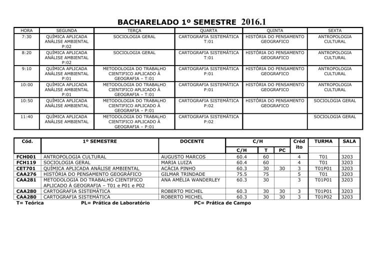 BACHARELADO 1º SEMESTRE HORA 7:30 8:20 9:10 10:00 10:50 11:40 Cód. FCH001 FCH119 CET701 CAA276 CAA281 SEGUNDA QUÍMICA APLICADA ANÁLISE AMBIENTAL P:02 QUÍMICA APLICADA ANÁLISE AMBIENTAL P:02 QUÍMICA APLICADA ANÁLISE AMBIENTAL P:01 QUÍMICA APLICADA ANÁLISE AMBIENTAL P:01 QUÍMICA APLICADA ANÁLISE AMBIENTAL QUÍMICA APLICADA ANÁLISE AMBIENTAL 2016.1 TERÇA SOCIOLOGIA GERAL QUARTA CARTOGRAFIA SISTEMÁTICA T:01 QUINTA HISTÓRIA DO PENSAMENTO GEOGRAFICO SEXTA ANTROPOLOGIA CULTURAL SOCIOLOGIA GERAL CARTOGRAFIA SISTEMÁTICA T:01 HISTÓRIA DO PENSAMENTO GEOGRAFICO ANTROPOLOGIA CULTURAL METODOLOGIA DO TRABALHO CIENTIFICO APLICADO À GEOGRAFIA – T:01 METODOLOGIA DO TRABALHO CIENTIFICO APLICADO À GEOGRAFIA – T:01 METODOLOGIA DO TRABALHO CIENTIFICO APLICADO À GEOGRAFIA – P:01 METODOLOGIA DO TRABALHO CIENTIFICO APLICADO À GEOGRAFIA – P:01 CARTOGRAFIA SISTEMÁTICA P:01 HISTÓRIA DO PENSAMENTO GEOGRAFICO ANTROPOLOGIA CULTURAL CARTOGRAFIA SISTEMÁTICA P:01 HISTÓRIA DO PENSAMENTO GEOGRAFICO ANTROPOLOGIA CULTURAL CARTOGRAFIA SISTEMÁTICA P:02 HISTÓRIA DO PENSAMENTO GEOGRAFICO SOCIOLOGIA GERAL 1º SEMESTRE ANTROPOLOGIA CULTURAL SOCIOLOGIA GERAL QUÍMICA APLICADA ANÁLISE AMBIENTAL HISTÓRIA DO PENSAMENTO GEOGRÁFICO METODOLOGIA DO TRABALHO CIENTIFICO APLICADO À GEOGRAFIA – T01 e P01 e P02 CAA280 CARTOGRAFIA SISTEMÁTICA CAA280 CARTOGRAFIA SISTEMÁTICA T= Teórica PL= Prática de Laboratório CARTOGRAFIA SISTEMÁTICA P:02 DOCENTE AUGUSTO MARCOS MARIA LUIZA ACÁCIA PINHO GILMAR TRINDADE ANA AMÉLIA WANDERLEY SOCIOLOGIA GERAL C/H C/H 60.4 60.4 60.3 75.5 60.3 ROBERTO MICHEL 60.3 ROBERTO MICHEL 60.3 PC= Prática de Campo Créd ito TURMA T01 T01 T01P01 T01 T01P01 3203 3203 3203 3203 3203 T01P01 T01P02 3203 3203 T 60 60 30 75 30 PC 30 4 4 3 5 3 30 30 30 30 3 3 SALA BACHARELADO – 3º SEMESTRE HORA 7:30 SEGUNDA BIOGEOGRAFIA TERÇA MANEJO ÁREAS NATURAIS E PROTEGIDAS (OPTIVA) MANEJO ÁREAS NATURAIS E PROTEGIDAS (OPTIVA) QUARTA BIOGEOGRAFIA PC QUINTA ORGANIZAÇÃO DO ESPAÇO GEOGRÁFICO SEXTA CARTOGRAFIA TEMÁTICA T:01 SÁBADO ORGANIZAÇÃO DO ESPAÇO GEOGRÁFICO P 8:20 BIOGEOGRAFIA BIOGEOGRAFIA PC ORGANIZAÇÃO DO ESPAÇO GEOGRÁFICO CARTOGRAFIA TEMÁTICA T:01 ORGANIZAÇÃO DO ESPAÇO GEOGRÁFICO P 9:10 GEOGRAFIA DA POPULAÇÃO GEOGRAFIA DA POPULAÇÃO PEDOLOGIA GEOMORFOLOGIA PEDOLOGIA GEOMORFOLOGIA FUNDAMENTOS DE ESTATISTICA FUNDAMENTOS DE ESTATISTICA CARTOGRAFIA TEMÁTICA P:01 CARTOGRAFIA TEMÁTICA P:01 PEDOLOGIA P PEDOLOGIA P 10:50 GEOGRAFIA DA POPULAÇÃO PEDOLOGIA GEOMORFOLOGIA FUNDAMENTOS DE ESTATISTICA CARTOGRAFIA TEMÁTICA P:02 11:40 GEOGRAFIA DA POPULAÇÃO PEDOLOGIA GEOMORFOLOGIA FUNDAMENTOS DE ESTATISTICA CARTOGRAFIA TEMÁTICA P:02 MANEJO ÁREAS NATURAIS E PROTEGIDAS (OPTIVA) P MANEJO ÁREAS NATURAIS E PROTEGIDAS (OPTIVA) P 10:00 Tarde GEOMORFOLOGIA P GEOMORFOLOGIA P Tarde Horas / aula Código Disciplinas C/H CAA227 CAA278 GEOMORFOLOGIA CARTOGRAFIA TEMÁTICA 90.5 60.3 60 30 P C 30 30 CAA278 CARTOGRAFIA TEMÁTICA 60.3 30 CAA225 PEDOLOGIA 90.5 60 CAA244 GEOGRAFIA DA POPULAÇÃO 60.4 60 CAA013 BIOGEOGRAFIA 60.3 60 JACQUES HUBERT DELABIE CET702 FUNDAMENTOS DE ESTATISTICA 60.4 60 JOSÉ CLAÚDIO CAA287 ORGANIZAÇÃO DO ESPAÇO GEOGRÁFICO 60.3 30 30 CAA156 MANEJO DE ÁREAS NATURAIS E PROTEGIDAS - OPTATIVA 30 30 60.3 T PROFESSOR TURMA SALA E EDNICE FONTES GIL MARCELO T01P01 T01P01 3205 3205 30 GIL MARCELO T01P02 3205 30 ANA MARIA MOREAU T01P01 3205 T01 3205 T01P01 3205 T01 3205 RITA JAQUELINE CHIAPETTI T01P01 3205 MARIA EUGÊNIA/RUI ROCHA T01P01 3205 MARIA CRISTINA RANGEL BACHARELADO – 5º SEMESTRE HORA 7:30 SEGUNDA 8:20 GEOPROCESSAMENTO – T:01 9:10 10:00 GEOPROCESSAMENTO – T:01 GEOPROCESSAMENTO – P:01 10:50 GEOPROCESSAMENTO – P:01 11:40 12:30 TERÇA QUARTA QUINTA SEXTA GEOGRAFIA DO BRASIL GEOGRAFIA DO BRASIL GEOGRAFIA URBANA GEOGRAFIA URBANA HIDROGRAFIA HIDROGRAFIA ECOLOGIA DA PAISAGEM GEOGRAFIA DO BRASIL GEOGRAFIA DO BRASIL GEOGRAFIA URBANA GEOGRAFIA URBANA HIDROGRAFIA HIDROGRAFIA ECOLOGIA DA PAISAGEM GEOGRAFIA DA BAHIA ECOLOGIA DA PAISAGEM (P) ECOLOGIA DA PAISAGEM (P) GEOGRAFIA DA BAHIA GEOGRAFIA URBANA (P) GEOGRAFIA URBANA (P) HIDROGRAFIA (P) HIDROGRAFIA (P) GEOGRAFIA DA BAHIA (P) GEOGRAFIA DA BAHIA (P) 13:20 5º . SEMESTRE - BACHARELADO Horas / aula PROFESSOR TURMA SALA Código Disciplinas C/H T PC E CAA285 GEOPROCESSAMENTO 60/3 30 30 GIL MARCELO E MAURICIO MOREAU T01P01 3207 CAA299 ECOLOGIA DA PAISAGEM 60.3 30 30 MARIA EUGÊNIA T01P01 3207 CAA223 GEOGRAFIA URBANA 90/5 60 30 GILSÉLIA LEMOS MOREIRA T01P01 3207 CAA271 GEOGRAFIA DA BAHIA 60/3 30 30 RUI BARBOSA ROCHA T01P01 3207 CAA269 HIDROGRAFIA 90/5 60 30 FRANCISCO DE PAULA T01P01 3207 CAA272 GEOGRAFIA DO BRASIL 60.4 60 RUI BARBOSA ROCHA T01 3207 BACHARELADO – 7º SEMESTRE HORA 7:30 SEGUNDA ESTÁGIO TERÇA PESQUISA APLICADA A GEOGRAFIA – P:01 8:20 ESTÁGIO PESQUISA APLICADA A GEOGRAFIA – P:01 9:10 GEOGRAFIA POLITICA E GEOPOLITICA GEOGRAFIA POLITICA E GEOPOLITICA PESQUISA APLICADA A GEOGRAFIA – P:01 GEOGRAFIA POLITICA E GEOPOLITICA GEOGRAFIA POLITICA E GEOPOLITICA 10:00 QUINTA GEOGRAFIA AGRÁRIA SEXTA ESTÁGIO GEOGRAFIA AGRÁRIA PESQUISA APLICADA A GEOGRAFIA – P:02 QUARTA PLANEJAMENTO E GESTÃO DO ESPAÇO TURISTICO PLANEJAMENTO E GESTÃO DO ESPAÇO TURISTICO PLANEJAMENTO E GESTÃO DO ESPAÇO TURISTICO GESTÃO DE BACIAS HIDROGRÁFICAS GEOGRAFIA ECONÔMICA OPTATIVA GEOGRAFIA ECONÔMICA OPTATIVA GEOGRAFIA ECONÔMICA OPTATIVA PESQUISA APLICADA A GEOGRAFIA – P:02 GESTÃO DE BACIAS HIDROGRÁFICAS PESQUISA APLICADA A GEOGRAFIA – P:01 OPTATIVA PESQUISA APLICADA A GEOGRAFIA – P:02 GESTÃO DE BACIAS HIDROGRÁFICAS (P) PESQUISA APLICADA A GEOGRAFIA – P:02 PLANEJAMENTO E GESTÃO DO ESPAÇO TURISTICO GEOGRAFIA AGRÁRIA (P) GEOGRAFIA AGRÁRIA (P) SÁBADO (P) 10:50 11:40 (P) (P) Tarde GESTÃO DE BACIAS HIDROGRÁFICAS (P) PLANEJAMENTO E GESTÃO DO ESPAÇO TURISTICO (P) Horas / aula Código Disciplinas C/H T PC CAA290 PLANEJAMENTO E GESTÃO DO E TURISTICO 75.4 45 30 CAA247 GEOGRAFIA POLITICA E GEOPOLITICA 60.4 60 CAA29