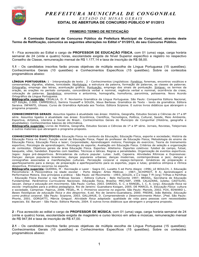 PREFEITURA MUNICIPAL DE CONGONHAL ESTADO DE MINAS GERAIS EDITAL DE ABERTURA DE CONCURSO PÚBLICO Nº 01/2013 PRIMEIRO TERMO DE RETIFICAÇÃO A Comissão Especial de Concurso Público da Prefeitura Municipal de Congonhal, através deste Termo de Retificação, comunica as seguintes alterações no Edital nº 01/2013, do seu Concurso Público. 1 - Fica acrescido ao Edital o cargo de PROFESSOR DE EDUCAÇÃO FÍSICA, com 01 (uma) vaga, carga horária semanal de 24 (vinte e quatro) horas, escolaridade exigida de Nível Superior específico e registro no respectivo Conselho de Classe, remuneração mensal de R$ 1.177,14 e taxa de inscrição de R$ 58,00. 1.1 - Os candidatos inscritos farão provas objetivas de múltipla escolha de Língua Portuguesa (15 questões); Conhecimentos Gerais (10 questões) e Conhecimentos Específicos (15 questões). Sobre os conteúdos programáticos abaixo: LÍNGUA PORTUGUESA: 1 - Interpretação de texto . 2 - Conhecimentos Lingüísticos: Fonética: fonemas, encontros vocálicos e consonantais, dígrafos, sílabas, tonicidade. Morfologia: a estrutura da palavra, formação de palavras, as classes de palavras. Ortografia: emprego das letras, acentuação gráfica. Pontuação: emprego dos sinais de pontuação. Sintaxe: os termos da oração, as orações no período composto, concordância verbal e nominal, regência verbal e nominal, ocorrência da crase, colocação de palavras. Semântica: sinonímia e antonímia, homografia, homofonia, paronímia, polissemia. Novo Acordo Ortográfico da Língua Portuguesa. Bibliografia sugerida: CEGALLA, D. P. Novíssima Gramática da Língua Portuguesa. São Paulo: Companhia Editora Nacional, 42ª Edição, 2.000. CAMPEDELLI, Samira Yousseff e SOUZA, Jésus Barbosa. Gramática do Texto - texto da gramática. Editora Saraiva. INFANTE, Ulisses. Curso de Gramática Aplicada aos Textos. Editora Scipione. E outros livros didáticos que abrangem o programa proposto. CONHECIMENTOS GERAIS: Assuntos ligados à atualidade nas áreas: História, Geografia, Estudos Sociais e Ciências de 1ª a 8ª série. Assuntos ligados à atualidade nas áreas: Econômica, Científica, Tecnológica, Política, Cultural, Saúde, Meio Ambiente, Esportiva, Artística, Literária e Social do Brasil.. Conhecimentos Gerais do Município de Congonhal (História, geografia e atualidades). Conhecimentos básicos de informática. Bibliografia sugerida: Livros de História, Geografia, Estudos Sociais e Ciências de 1ª a 8ª série. Jornais, Revistas, Telejornais e outros materiais que abrangem o programa proposto. CONHECIMENTOS ESPECÍFICOS: Educação Física no contexto da Educação; Educação Física, esporte e sociedade; História da Educação Física no Brasil; Função social da Educação Física; Papel do professor de Educação Física; Metodologia do ensino da Educação Física; Educação Física e lazer; Corporeidade; Aprendizagem motora; Fisiologia do exercício; Teoria do treinamento esportivo; Psicologia da aprendizagem; Psicologia do esporte; Avaliação em Educação Física. Critérios de seleção e organização de conteúdos. Objetivos gerais da área Educação Física. Esportes: Atletismo. Esportes coletivos: futebol de campo, futsal, basquete, vôlei, handebol. Esportes com bastões. Técnicas e táticas. Regras e penalidades. Organização de eventos esportivos. Jogos: Jogos pré-desportivos. Brincadeiras da cultura popular. Lutas: Judô, Capoeira. Atividades Rítmicas e Expressivas: Danças: danças populares brasileiras; danças populares urbanas; danças modernas, contemporâneas e jazz; danças e coreografias associadas a manifestações culturais. Percepção corporal e espaço-temporal. Ginásticas de preparação e aperfeiçoamento para a dança; de preparação e aperfeiçoamento para os esportes, jogos e lutas; ginástica olímpica e rítmica desportiva. Primeiros socorros no esporte. Bibliografia sugerida: GUERRA, M - Recreação e Lazer - Sagra DC, Luzatto 5 ed Porto Alegre -1996; LE BOULCH, J. Educação Psicomotora: A Psicocinética na idade escolar - Porto Alegre: Artes Médicas - 1987; SCHIMIDT, R A; Aprendizagem e Performance Motora. Dos princípios a prática - São Paulo: ed Movimento - 1993; SOUZA, e s e Vago T M (org) Trilhas e Partilhas - Educação Física Escolar e nas Práticas Sociais - Editora Cultura - Belo Horizonte 1997; BRASIL, Secretaria de Educação Fundamental. Parâmetros Curriculares Nacionais. Educação física, Brasília: MEC/SEF, 1998. CALAZANS, Julieta; CASTILHO, Jacyan. Dança e educação em movimento. São Paulo: Cortez, 2003. DARIDO, S. C. e RANGEL, I. C. A. (org). Educação física na escola: implicações para a prática pedagógica. Rio de Janeiro: Guanabara Koogan, 2005. DE MARCO, A. Educação Física: cultura e sociedade. Campinas: Papirus, 2006. FEGEL, M. J. Primeiros socorros no esporte. São Paulo: Manole, 2002. FOX, EDWARD L. Bases fisiológicas da educação física e dos desportos. 6.ed. Rio de Janeiro:Guanabara, 2000. FREIRE, João Batista. Educação como prática corporal. São Paulo: Scipione, 2003. GALLAHUE, D. Compreendendo o Desenvolvimento Motor. 2ªed. São Paulo: Phorte, 2001. GORGATTI, Márcia Greguol. Atividade física adaptada: qualidade de vida para pessoas com necessidades especiais. Ed. Barueri - São Paulo: Editora Manole, 2004. E outros livros didáticos que abrangem o programa proposto. 2 - Fica acrescido ao edital o cargo de PROFESSOR DE MÚSICA, com 01 (uma) vaga, carga horária semanal de 24 (vinte e quatro) horas, escolaridade exigida de magistério e curso técnico em artes e músicas, remuneração mensal de R$ 947,84 e taxa de inscrição de R$ 47,00. 2.1 - Os candidatos inscritos farão provas objetivas de múltipla escolha de Língua Portuguesa (15 questões); Conhecimentos Gerais (10 questões) e Conhecimentos Específicos (15 questões). Sobre os conteúdos programáticos abaixo: 1 PREFEITURA MUNICIPAL DE CONGONHAL ESTADO DE MINAS GERAIS EDITAL