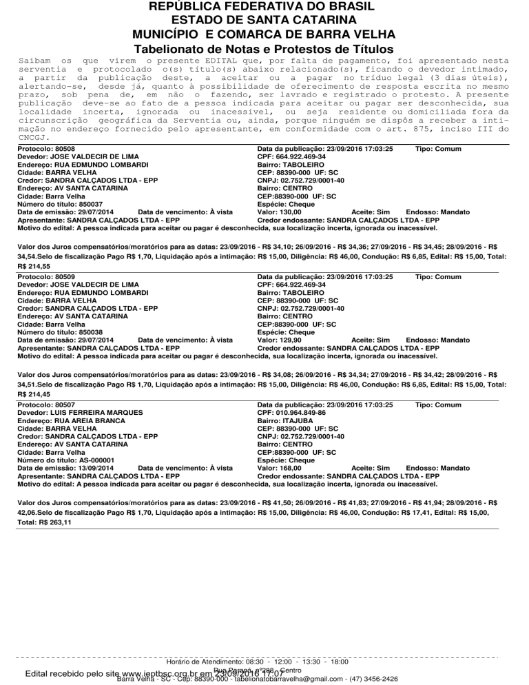 REPÚBLICA FEDERATIVA DO BRASIL ESTADO DE SANTA CATARINA MUNICÍPIO E COMARCA DE BARRA VELHA Tabelionato de Notas e Protestos de Títulos Saibam os que virem o presente EDITAL que, por falta de pagamento, foi apresentado nesta serventia e protocolado o(s) título(s) abaixo relacionado(s), ficando o devedor intimado, a partir da publicação deste, a aceitar ou a pagar no tríduo legal (3 dias úteis), alertando-se, desde já, quanto à possibilidade de oferecimento de resposta escrita no mesmo prazo, sob pena de, em não o fazendo, ser lavrado e registrado o protesto. A presente publicação deve-se ao fato de a pessoa indicada para aceitar ou pagar ser desconhecida, sua localidade incerta, ignorada ou inacessível, ou seja residente ou domiciliada fora da circunscrição geográfica da Serventia ou, ainda, porque ninguém se dispôs a receber a intimação no endereço fornecido pelo apresentante, em conformidade com o art. 875, inciso III do CNCGJ. Protocolo: 80508 Data da publicação: 23/09/2016 17:03:25 Tipo: Comum Devedor: JOSE VALDECIR DE LIMA CPF: 664.922.469-34 Endereço: RUA EDMUNDO LOMBARDI Bairro: TABOLEIRO Cidade: BARRA VELHA CEP: 88390-000 UF: SC Credor: SANDRA CALÇADOS LTDA - EPP CNPJ: 02.752.729/0001-40 Endereço: AV SANTA CATARINA Bairro: CENTRO Cidade: Barra Velha CEP:88390-000 UF: SC Número do título: 850037 Espécie: Cheque Data de emissão: 29/07/2014 Data de vencimento: À vista Valor: 130,00 Aceite: Sim Endosso: Mandato Apresentante: SANDRA CALÇADOS LTDA - EPP Credor endossante: SANDRA CALÇADOS LTDA - EPP Motivo do edital: A pessoa indicada para aceitar ou pagar é desconhecida, sua localização incerta, ignorada ou inacessível. Valor dos Juros compensatórios/moratórios para as datas: 23/09/2016 - R$ 34,10; 26/09/2016 - R$ 34,36; 27/09/2016 - R$ 34,45; 28/09/2016 - R$ 34,54.Selo de fiscalização Pago R$ 1,70, Liquidação após a intimação: R$ 15,00, Diligência: R$ 46,00, Condução: R$ 6,85, Edital: R$ 15,00, Total: R$ 214,55 Protocolo: 80509 Data da publicação: 23/09/2016 17:03:25 Tipo: Comum Devedor: JOSE VALDECIR DE LIMA CPF: 664.922.469-34 Endereço: RUA EDMUNDO LOMBARDI Bairro: TABOLEIRO Cidade: BARRA VELHA CEP: 88390-000 UF: SC Credor: SANDRA CALÇADOS LTDA - EPP CNPJ: 02.752.729/0001-40 Endereço: AV SANTA CATARINA Bairro: CENTRO Cidade: Barra Velha CEP:88390-000 UF: SC Número do título: 850038 Espécie: Cheque Data de emissão: 29/07/2014 Data de vencimento: À vista Valor: 129,90 Aceite: Sim Endosso: Mandato Apresentante: SANDRA CALÇADOS LTDA - EPP Credor endossante: SANDRA CALÇADOS LTDA - EPP Motivo do edital: A pessoa indicada para aceitar ou pagar é desconhecida, sua localização incerta, ignorada ou inacessível. Valor dos Juros compensatórios/moratórios para as datas: 23/09/2016 - R$ 34,08; 26/09/2016 - R$ 34,34; 27/09/2016 - R$ 34,42; 28/09/2016 - R$ 34,51.Selo de fiscalização Pago R$ 1,70, Liquidação após a intimação: R$ 15,00, Diligência: R$ 46,00, Condução: R$ 6,85, Edital: R$ 15,00, Total: R$ 214,45 Protocolo: 80507 Data da publicação: 23/09/2016 17:03:25 Tipo: Comum Devedor: LUIS FERREIRA MARQUES CPF: 010.964.849-86 Endereço: RUA AREIA BRANCA Bairro: ITAJUBA Cidade: BARRA VELHA CEP: 88390-000 UF: SC Credor: SANDRA CALÇADOS LTDA - EPP CNPJ: 02.752.729/0001-40 Endereço: AV SANTA CATARINA Bairro: CENTRO Cidade: Barra Velha CEP:88390-000 UF: SC Número do título: AS-000001 Espécie: Cheque Data de emissão: 13/09/2014 Data de vencimento: À vista Valor: 168,00 Aceite: Sim Endosso: Mandato Apresentante: SANDRA CALÇADOS LTDA - EPP Credor endossante: SANDRA CALÇADOS LTDA - EPP Motivo do edital: A pessoa indicada para aceitar ou pagar é desconhecida, sua localização incerta, ignorada ou inacessível. Valor dos Juros compensatórios/moratórios para as datas: 23/09/2016 - R$ 41,50; 26/09/2016 - R$ 41,83; 27/09/2016 - R$ 41,94; 28/09/2016 - R$ 42,06.Selo de fiscalização Pago R$ 1,70, Liquidação após a intimação: R$ 15,00, Diligência: R$ 46,00, Condução: R$ 17,41, Edital: R$ 15,00, Total: R$ 263,11 Edital recebido pelo Horário de Atendimento: 08:30 - 12:00 - 13:30 - 18:00 Paraná, nº288 - Centro site www.ieptbsc.org.br em Rua 23/09/2016 17:07 Barra Velha - SC - Cep: 88390-000 - [email protected] - (47) 3456-2426 REPÚBLICA FEDERATIVA DO BRASIL ESTADO DE SANTA CATARINA MUNICÍPIO E COMARCA DE BARRA VELHA Tabelionato de Notas e Protestos de Títulos Saibam os que virem o presente EDITAL que, por falta de pagamento, foi apresentado nesta serventia e protocolado o(s) título(s) abaixo relacionado(s), ficando o devedor intimado, a partir da publicação deste, a aceitar ou a pagar no tríduo legal (3 dias úteis), alertando-se, desde já, quanto à possibilidade de oferecimento de resposta escrita no mesmo prazo, sob pena de, em não o fazendo, ser lavrado e registrado o protesto. A presente publicação deve-se ao fato de a pessoa indicada para aceitar ou pagar ser desconhecida, sua localidade incerta, ignorada ou inacessível, ou seja residente ou domiciliada fora da circunscrição geográfica da Serventia ou, ainda, porque ninguém se dispôs a receber a intimação no endereço fornecido pelo apresentante, em conformidade com o art. 875, inciso III do CNCGJ. Protocolo: 80500 Devedor: MARCELO BRUSCO HAUDSCH Endereço: RUA PAULISTA Cidade: BALNEÁRIO PIÇARRAS Credor: VILMAR SIZINO GARCIA Endereço: RUA NELSON NAZATO Cidade: Jaraguá do Sul Número do título: 01 Data de emissão: 28/12/2015 Data de vencimento: 01/08/2016 Apresentante: JOSIANE ZWIRTES Motivo do edital: A pessoa indicada para aceitar ou pagar MUDOU-SE Data da publicação: 23/09/2016 17:04:09 Tipo: Comum CPF: 060.385.319-63 Bairro: ITACOLOMI CEP: 88380-000 UF: SC CPF: 514.083.929-68 Bairro: CENTRO CEP:89253-040 UF: SC Espécie: Espécie de Contrato Valor: 850,00 Aceite: Sim Endosso: Mandato Credor endossante: VILMAR SIZINO GARCIA Valor dos Juros para as datas: 23/09/2016 - R$ 15,02; 26/09/2016 - R$ 15,87; 27/09/2016 - R$ 16,15; 28/09/20