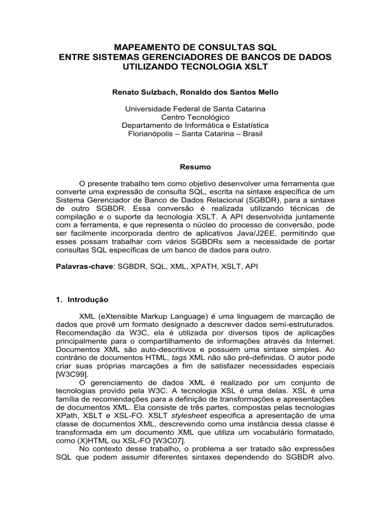 MAPEAMENTO DE CONSULTAS SQL ENTRE SISTEMAS GERENCIADORES DE BANCOS DE DADOS UTILIZANDO TECNOLOGIA XSLT Renato Sulzbach, Ronaldo dos Santos Mello Universidade Federal de Santa Catarina Centro Tecnológico Departamento de Informática e Estatística Florianópolis – Santa Catarina – Brasil Resumo O presente trabalho tem como objetivo desenvolver uma ferramenta que converte uma expressão de consulta SQL, escrita na sintaxe específica de um Sistema Gerenciador de Banco de Dados Relacional (SGBDR), para a sintaxe de outro SGBDR. Essa conversão é realizada utilizando técnicas de compilação e o suporte da tecnologia XSLT. A API desenvolvida juntamente com a ferramenta, e que representa o núcleo do processo de conversão, pode ser facilmente incorporada dentro de aplicativos Java/J2EE, permitindo que esses possam trabalhar com vários SGBDRs sem a necessidade de portar consultas SQL específicas de um banco de dados para outro. Palavras-chave: SGBDR, SQL, XML, XPATH, XSLT, API 1. Introdução XML (eXtensible Markup Language) é uma linguagem de marcação de dados que provê um formato designado a descrever dados semi-estruturados. Recomendação da W3C, ela é utilizada por diversos tipos de aplicações principalmente para o compartilhamento de informações através da Internet. Documentos XML são auto-descritivos e possuem uma sintaxe simples. Ao contrário de documentos HTML, tags XML não são pré-definidas. O autor pode criar suas próprias marcações a fim de satisfazer necessidades especiais [W3C99]. O gerenciamento de dados XML é realizado por um conjunto de tecnologias provido pela W3C. A tecnologia XSL é uma delas. XSL é uma família de recomendações para a definição de transformações e apresentações de documentos XML. Ela consiste de três partes, compostas pelas tecnologias XPath, XSLT e XSL-FO. XSLT stylesheet especifica a apresentação de uma classe de documentos XML, descrevendo como uma instância dessa classe é transformada em um documento XML que utiliza um vocabulário formatado, como (X)HTML ou XSL-FO [W3C07]. No contexto desse trabalho, o problema a ser tratado são expressões SQL que podem assumir diferentes sintaxes dependendo do SGBDR alvo. Vários SGBDRs possuem como característica diferentes formas de disponibilizar uma determinada funcionalidade através de comandos SQL. Essas diferentes formas de implementação trazem dificuldades aos usuários, pois nem sempre uma expressão SQL escrita por um fabricante é válida para outra. Com essa falta de padronização, usuários têm de recorrer a diferentes fontes de pesquisa em busca da tradução correta de uma expressão para o SGBDR ao qual deseja aplicar. Um exemplo dessa heterogeneidade é o comando que especifica o primeiro conjunto de linhas a ser retornado do resultado de uma consulta SQL. Tal comando pode assumir diferenças tanto na grafia quanto na posição na estrutura da expressão SQL. 1.1. Objetivo Construir uma ferramenta onde uma determinada expressão de consulta SQL de entrada, escrita para um determinado SGBDR, e representada em um documento XML, pode ser convertida para o dialeto SQL de outro SGBDR 1.2. Motivação Limitações existentes nos trabalhos relacionados. Estas limitações dizem respeito à falta de flexibilidade para o mapeamento de consultas entre SGBDs de interesse e a inexistência de soluções gratuitas para a realização desta tarefa. 2. Ferramenta proposta Neste trabalho é proposta e implementada uma ferramenta de mapeamento de consultas SQL entre diferentes SGBDRs. O objetivo é, dada uma expressão SQL qualquer, de um determinado SGBDR, a ferramenta possa mapear e transformar para a expressão SQL equivalente de outro SGBDR. Devido à grande variedade de comandos SQL, a ferramenta implementa o mapeamento de comandos de consulta (SELECT), uma vez que são os tipos mais frequentes de operações que um SGBD executa e por mais apresentarem diferenças sintáticas. Para que o mapeamento possa ser realizado, a ferramenta funciona com base em dois processos: compilação e transformação. O usuário informa a expressão SQL e a qual SGBDR ela pertence. Ele informa também o SGBDR para o qual se deseja que a expressão SQL de entrada seja transformada. A partir dessas informações de entrada, a ferramenta inicia o processo de compilação, analisando os aspectos léxicos e sintáticos da expressão de entrada. Em caso de erro, o sistema informa ao usuário a falha na compilação e indica a posição exata onde ocorreu esse erro. Se nenhum erro ocorrer é iniciada a análise semântica da compilação juntamente com a geração de código intermediário. O código intermediário gerado representa a expressão SQL de entrada estruturada no formato XML. A ferramenta então seleciona o conjunto de regras de transformação e aplica ao código intermediário gerado enviando ao fluxo de saída a expressão SQL do SGBDR de destino. A Figura 1 mostra a arquitetura geral do processo de mapeamento. Figura 1 – Esquema geral do processo de mapeamento entre comandos SQL 2.1. Compilação Para o processo de compilação, foi utilizada a ferramenta GALS (Gerador de Analisadores Léxicos e Sintáticos) (GESSER, 2002). Nela foi inserida uma gramática específica para cada um dos possíveis SGBDRs de entrada. O presente trabalho implementou regras de mapeamento para quatro SGBDRs: Microsoft SQL Server, MySQL, PostgreSQL e Firebird. Entretanto, outros SGBDRs também podem ser integrados à ferramenta, que é facilmente extensível por definir regras de mapeamento em gramáticas e arquivos XSL independentes. O GALS gera, de forma automatizada, todas as classes necessárias para o processo de análise léxica e sintática. A classe de análise semântica é gerada em branco. Nela então são definidos os métodos que implementam cada uma das ações semânticas separadamente. Conforme comentado anteriormente, a análise semântica gera o código intermediário no form