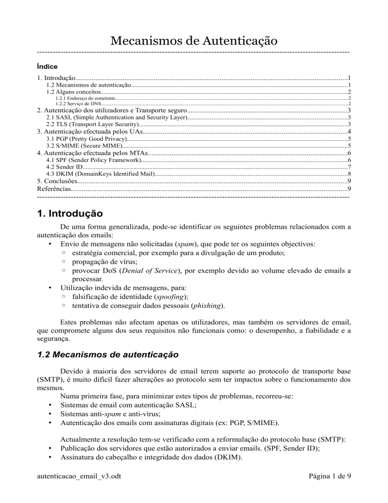 Mecanismos de Autenticação -----------------------------------------------------------------------------------------------------------------------Índice 1. Introdução.....................................................................................................................................................1 1.2 Mecanismos de autenticação.....................................................................................................................................1 1.2 Alguns conceitos.......................................................................................................................................................2 1.2.1 Endereço do remetente..................................................................................................................................................................................2 1.2.2 Serviço de DNS.............................................................................................................................................................................................2 2. Autenticação dos utilizadores e Transporte seguro.......................................................................................3 2.1 SASL (Simple Authentication and Security Layer)..................................................................................................3 2.2 TLS (Transport Layer Security)................................................................................................................................3 3. Autenticação efectuada pelos UAs................................................................................................................4 3.1 PGP (Pretty Good Privacy).......................................................................................................................................5 3.2 S/MIME (Secure MIME)..........................................................................................................................................5 4. Autenticação efectuada pelos MTAs.............................................................................................................6 4.1 SPF (Sender Policy Framework)..............................................................................................................................6 4.2 Sender ID..................................................................................................................................................................7 4.3 DKIM (DomainKeys Identified Mail)......................................................................................................................8 5. Conclusões....................................................................................................................................................9 Referências.......................................................................................................................................................9 ------------------------------------------------------------------------------------------------------------------------ 1. Introdução De uma forma generalizada, pode-se identificar os seguintes problemas relacionados com a autenticação dos emails: • Envio de mensagens não solicitadas (spam), que pode ter os seguintes objectivos: ◦ estratégia comercial, por exemplo para a divulgação de um produto; ◦ propagação de vírus; ◦ provocar DoS (Denial of Service), por exemplo devido ao volume elevado de emails a processar. • Utilização indevida de mensagens, para: ◦ falsificação de identidade (spoofing); ◦ tentativa de conseguir dados pessoais (phishing). Estes problemas não afectam apenas os utilizadores, mas também os servidores de email, que compromete alguns dos seus requisitos não funcionais como: o desempenho, a fiabilidade e a segurança. 1.2 Mecanismos de autenticação Devido à maioria dos servidores de email terem suporte ao protocolo de transporte base (SMTP), é muito difícil fazer alterações ao protocolo sem ter impactos sobre o funcionamento dos mesmos. Numa primeira fase, para minimizar estes tipos de problemas, recorreu-se: • Sistemas de email com autenticação SASL; • Sistemas anti-spam e anti-vírus; • Autenticação dos emails com assinaturas digitais (ex: PGP, S/MIME). • • Actualmente a resolução tem-se verificado com a reformulação do protocolo base (SMTP): Publicação dos servidores que estão autorizados a enviar emails. (SPF, Sender ID); Assinatura do cabeçalho e integridade dos dados (DKIM). autenticacao_email_v3.odt Página 1 de 9 1.2 Alguns conceitos 1.2.1 Endereço do remetente Como no correio postal, as mensagens de email no mínimo têm dois tipos de endereços: um no envelope e outro no cabeçalho da carta/mensagem. [1] • O endereço do remetente no envelope (return-path) é utilizado durante o transporte da mensagem entre os servidores de email. Em caso de falha na entrega, o servidor devolve a mensagem para este endereço. • O endereço do remetente no cabeçalho da mensagem é incluído no campo “From:” ou “Sender:”, sendo este visível nos UAs. Normalmente os servidores de email não dão muita importância a este endereço. 1.2.2 Serviço de DNS O DNS (Domain Name System), é um serviço que efectua a tradução de um domínio num endereço IP e vice-versa. É um serviço que funciona segundo o modelo cliente-servidor. gnu14.netlab.fe.up.pt ↔ 172.16.2.14 O servidor de email interage com o DNS de dois modos: • Para enviar emails – O servidor de email deve possuir uma ligação fiável ao servidor de DNS para a resolução de domínios, de modo a determinar o encaminhamento a efectuar. • Para receber emails – O domínio de destino deve estar correctamente configurado para encaminhar as mensagens para o servidor de email do seu domínio. Uma configuração incorrecta do servidor de DNS é uma fonte comum de problemas no serviço de email. Os nomes estão 