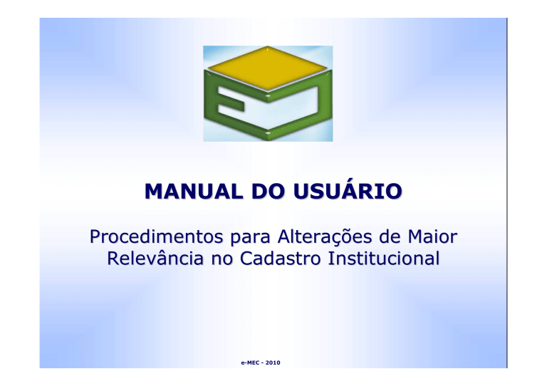 MANUAL DO USUÁRIO Procedimentos para Alterações de Maior Relevância no Cadastro Institucional e-MEC - 2010 Acesse http:// emec.mec. .mec.gov gov..br http://emec Clique em Avaliação e-MEC - 2010 Regulação/ Para alterações de Maior relevância no Cadastro Institucional , o acesso deve ser feito com o perfil da mantida. Informe o CPF do PI. Informe a senha e clique em “Entrar” e-MEC - 2010 Caso seja PI de mais de uma Instituição, selecione a IES para a qual irá realizar o procedimento e clique em AUTENTICAR. e-MEC - 2010 No Menu Cadastro, selecione esta opção para iniciar o procedimento de Alterações de Maior Relevância. Procedimentos para alterações de menor relevância estão disponíveis no manual de Alterações de Menor Relevância. Esta opção permite visualizar os dados da Mantenedora Acessando esta opção, é possível editar dados da mantida como os nºs de telefone e fax, o site e o ee-mail da IES. e-MEC - 2010 1º PASSO – ORIENTAÇÕES GERAIS A tela funciona de forma seqüencial, a fim de evitar a abertura de várias janelas. Após a leitura de todas as orientações gerais do 1º passo, clique em CONCORDO para acessar o 2º passo. e-MEC - 2010 2º PASSO - AGRUPADORES Após ler atentamente as orientações do 2º passo, clique na opção adequada para cadastrar ou não cadastrar agrupadores. Esse filtro endereço específico. permite localizar ou agrupador Para inativar endereços incorretos clique aqui. Visualize aqui os Endereços da IES constantes no Cadastro. Visualize aqui os Agrupadores de Endereços da IES constantes no Cadastro. e-MEC - 2010 Endereços com esse ícone não podem ser inativados, pois vieram da Regulação. 2º PASSO - AGRUPADORES Caso pretenda cadastrar agrupador, clique em SIM. Se não pretende cadastrar Agrupador(es ), clique em NÃO e Agrupador(es), siga para o 3º Passo. e-MEC - 2010 2º PASSO – AGRUPADORES Selecione o município no qual estão localizados os endereços a serem agrupados. e-MEC - 2010 2º PASSO – AGRUPADORES Atenção: O 2º Passo se destina ao cadastramento de Agrupadores referentes aos endereços constantes no cadastro. Caso o endereço não seja listado, listado, significa que não está no cadastro. Neste caso, cadastre os agrupadores ignorando ignorando os endereços não listados, pois no 3º passo será possível informáinformá-los e associáassociá-los ao agrupador adequado. Ao selecionar o município, são listados os endereços localizados neste. Utilize este botão para adicionar endereços a serem agrupados após selecionáselecioná-los na lista superior. Utilize este botão se pretende agrupar todos os endereços do município em um único agrupador. e-MEC - 2010 Utilize este botão se pretende remover todos os endereços adicionados Utilize este botão se pretende remover algum endereço associado por equívoco a um agrupador. 2º PASSO – AGRUPADORES Digite aqui um nome para o agrupador. Classifique o Agrupador como Campus, Unidade ou Pólo. Defina aqui se o Agrupador é sede ou não Endereço pertencente ao Agrupador. Ao selecionar um endereço desta lista e adicionáadicioná-lo à lista de endereços a serem agrupados, este não mais estará disponível para outros agrupamentos. Após adicionar os endereços do mesmo município a serem agrupados, selecione aqui qual deles é o principal. Concluído o preenchimento do Agrupador, clique em SALVAR. e-MEC - 2010 2º PASSO – AGRUPADORES Se pretende cadastrar um novo agrupador, clique SIM e repita os procedimentos de cadastro de Agrupador. Se não, clique em NÃO e avance ao 3º Passo. Ao clicar em SALVAR na tela anterior, o sistema retorna para a tela inicial do 2º Passo. O agrupador cadastrado é listado aqui. Este ícone sinaliza se o Agrupador é ou não é Sede. e-MEC - 2010 Clicando aqui é possível Editar as informações do Agrupador. 3º PASSO – INFORMAR ENDEREÇOS Após a leitura atenta das orientações do 3º passo, clique em SIM caso algum endereço existente não conste no cadastro. Se todos os endereços existentes constam no Cadastro, clique em NÃO e avance para o 4º passo. e-MEC - 2010 3º PASSO – INFORMAR ENDEREÇOS Informe aqui o CEP do endereço. Informe aqui endereço. o logradouro do Informe aqui o complemento do endereço. Informe aqui a qual agrupador deve ser associado o endereço (Esta indicação é opcional). Clique aqui para anexar o arquivo com a imagem do ato que referencie o endereço em questão. e-MEC - 2010 Após conferir as clique em SALVAR. informações, 3º PASSO – INFORMAR ENDEREÇOS Se pretende cadastrar um novo endereço, clique SIM e repita os procedimentos de cadastro de Endereços. Se não, clique em NÃO e avance ao 4º Passo. Ao clicar em SALVAR na tela anterior, o sistema retorna para a tela inicial do 3º Passo. O endereço cadastrado é listado aqui. Este ícone sinaliza que há necessidade de confirmação do endereço pela Secretaria Competente. e-MEC - 2010 Clicando aqui possível Excluir endereço. é o 4º PASSO – VERIFICAR CURSOS Após ler atentamente às orientações do 4º passo, será necessário realizar o procedimento em todos os cursos. Esse filtro permite localizar um curso específico. Clique aqui para Verificar/Editar dados do curso. Caso tenha alguma duvida sobre o significado dos ícones, verifique a Legenda. Aqui é apresentada a lista de cursos existentes no cadastro. ATENÇÃO: Caso algum curso existente não conste nesta lista, realize o procedimento com os listados, pois será possível informar cursos não constantes no cadastro no 5º passo. e-MEC - 2010 4º PASSO – VERIFICAR CURSOS Após atenta leitura das orientações, verifique os dados do curso para ratificáratificálos ou retificáretificá-los. Selecione aqui a denominação do curso. Esta seleção deve ser feita em todos os cursos, inclusive aqueles em que não é necessária mudança de denominação. Caso a denominação necessária não conste na lista, pode ser utilizada a opção Out