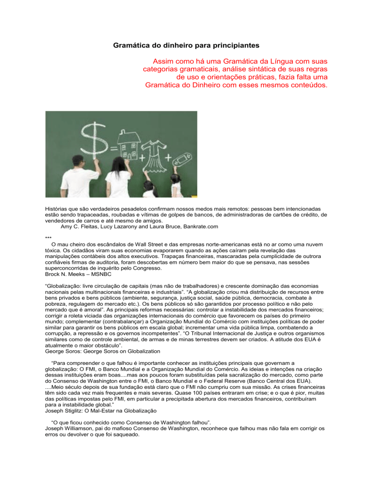 Gramática do dinheiro para principiantes Assim como há uma Gramática da Língua com suas categorias gramaticais, análise sintática de suas regras de uso e orientações práticas, fazia falta uma Gramática do Dinheiro com esses mesmos conteúdos. Histórias que são verdadeiros pesadelos confirmam nossos medos mais remotos: pessoas bem intencionadas estão sendo trapaceadas, roubadas e vítimas de golpes de bancos, de administradoras de cartões de crédito, de vendedores de carros e até mesmo de amigos. Amy C. Fleitas, Lucy Lazarony and Laura Bruce, Bankrate.com *** O mau cheiro dos escândalos de Wall Street e das empresas norte-americanas está no ar como uma nuvem tóxica. Os cidadãos viram suas economias evaporarem quando as ações caíram pela revelação das manipulações contábeis dos altos executivos. Trapaças financeiras, mascaradas pela cumplicidade de outrora confiáveis firmas de auditoria, foram descobertas em número bem maior do que se pensava, nas sessões superconcorridas de inquérito pelo Congresso. Brock N. Meeks – MSNBC “Globalização: livre circulação de capitais (mas não de trabalhadores) e crescente dominação das economias nacionais pelas multinacionais financeiras e industriais”. “A globalização criou má distribuição de recursos entre bens privados e bens públicos (ambiente, segurança, justiça social, saúde pública, democracia, combate à pobreza, regulagem do mercado etc.). Os bens públicos só são garantidos por processo político e não pelo mercado que é amoral”. As principais reformas necessárias: controlar a instabilidade dos mercados financeiros; corrigir a roleta viciada das organizações internacionais do comércio que favorecem os países do primeiro mundo; complementar (contrabalançar) a Organização Mundial do Comércio com instituições políticas de poder similar para garantir os bens públicos em escala global; incrementar uma vida pública limpa, combatendo a corrupção, a repressão e os governos incompetentes”. “O Tribunal Internacional de Justiça e outros organismos similares como de controle ambiental, de armas e de minas terrestres devem ser criados. A atitude dos EUA é atualmente o maior obstáculo”. George Soros: George Soros on Globalization “Para compreender o que falhou é importante conhecer as instituições principais que governam a globalização: O FMI, o Banco Mundial e a Organização Mundial do Comércio. As ideias e intenções na criação dessas instituições eram boas....mas aos poucos foram substituídas pela sacralização do mercado, como parte do Consenso de Washington entre o FMI, o Banco Mundial e o Federal Reserve (Banco Central dos EUA). ....Meio século depois de sua fundação está claro que o FMI não cumpriu com sua missão. As crises financeiras têm sido cada vez mais frequentes e mais severas. Quase 100 países entraram em crise; e o que é pior, muitas das políticas impostas pelo FMI, em particular a precipitada abertura dos mercados financeiros, contribuíram para a instabilidade global.” Joseph Stiglitz: O Mal-Estar na Globalização “O que ficou conhecido como Consenso de Washington falhou”. Joseph Williamson, pai do mafioso Consenso de Washington, reconhece que falhou mas não fala em corrigir os erros ou devolver o que foi saqueado. INTRODUÇÃO À GRAMÁTICA DO DINHEIRO “O que está em sua mente determina o que estará em seu bolso”! O que o dinheiro faz por nós não é nada em comparação com o que nós fazemos por ele (Millôr Fernandes) Você tem inteligência financeira? O teste chamado Quociente Triádico do Mercador lhe dará uma resposta. Qual é seu nível de vivência? Você terá que ampliar seu conceito de classe social, ou estrato A, B, C, D, E para responder, não só com seu nível financeiro, mas combinando-o com seu nível educacional e nível de felicidade. É a teoria dos três cérebros, apresentada adiante. Você entende bem e sabe explicar as razões de sua situação financeira atual? Você poderá organizar sua “História Contábil” pessoal/familiar e ter uma visão mais clara de seu fluxo de caixa (receitas, gastos fixos, gastos variáveis e reservas) nesta Gramática do Dinheiro. O seu dinheiro é difícil de ganhar e não pára em seu bolso? Pois é, a escola esqueceu ou não quis ensinar-lhe a linguagem e a sintaxe financeira resumida e simplificada nesta “Gramática do Dinheiro”. Recupere, aqui, o tempo perdido e o dinheiro desperdiçado. O que é o dinheiro? É uma ideia, uma crença num símbolo! Por que uns poucos têm tanto, outros mais ou menos e tantos têm tão pouco? É opção dos deuses por um povo, é sorte, é herança (genética) ou é inteligência, aptidão financeira? Claro que é inteligência ou aptidão para os negócios e as espertezas que eles requerem. Por que, então, tantos têm tão pouca aptidão financeira e levam uma vida de sufoco? É o que a Gramática do Dinheiro quer explicar e ajudar a corrigir. E quer servir também de manual de desenvolvimento dessa nada secreta ou divina inteligência financeira. Começa-se por entender um pouco melhor nosso cérebro visto como três blocos de funções: O primeiro quadro da esquerda dá o conceito básico de cérebro tri-uno (três em um, um em três) em quatro níveis de desenvolvimento possível, e o título geral das funções de cada um dos três blocos. Há pessoas com mentes rústicas (a maioria) com essas funções num nível primário ou nível 1 (um) porque não tiveram acesso à educação e às tecnologias que amplificam o potencial humano herdado. Há outras mais desenvolvidas, expandindo seus três blocos de funções pelos níveis mais altos, de forma integrada e balanceada mediante a aquisição das tecnologias tricerebrais adequadas. Outras há com apenas dois blocos em nível mais alto e um deixado para trás. E há outras, menos normais, dedicadas exclusivamente a um só bloco de funções criando os fundament