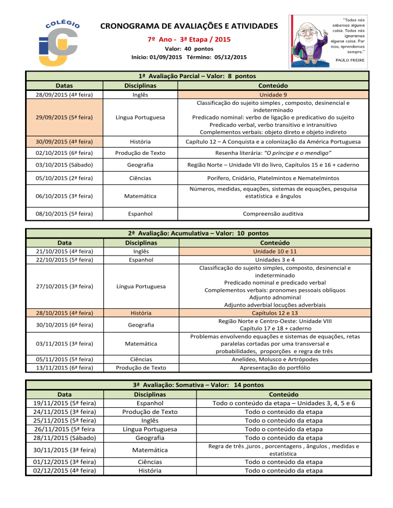 CRONOGRAMA DE AVALIAÇÕES E ATIVIDADES 7º Ano - 3ª Etapa / 2015 Valor: 40 pontos Início: 01/09/2015 Término: 05/12/2015 Datas 1ª Avaliação Parcial – Valor: 8 pontos Disciplinas Conteúdo 28/09/2015 (4ª feira) Inglês 29/09/2015 (5ª feira) Língua Portuguesa 30/09/2015 (4ª feira) História Capítulo 12 – A Conquista e a colonização da América Portuguesa 02/10/2015 (6ª feira) Produção de Texto Resenha literária: “O príncipe e o mendigo” 03/10/2015 (Sábado) Geografia Região Norte – Unidade VII do livro, Capítulos 15 e 16 + caderno 05/10/2015 (2ª feira) Ciências Porífero, Cnidário, Platelmintos e Nematelmintos 06/10/2015 (3ª feira) Matemática Números, medidas, equações, sistemas de equações, pesquisa estatística e ângulos 08/10/2015 (5ª feira) Espanhol Compreensão auditiva Data 2ª Avaliação: Acumulativa – Valor: 10 pontos Disciplinas Conteúdo 21/10/2015 (4ª feira) 22/10/2015 (5ª feira) Inglês Espanhol 27/10/2015 (3ª feira) Língua Portuguesa 28/10/2015 (4ª feira) História 30/10/2015 (6ª feira) Geografia 03/11/2015 (3ª feira) Matemática 05/11/2015 (5ª feira) 13/11/2015 (6ª feira) Ciências Produção de Texto Data 19/11/2015 (5ª feira) 24/11/2015 (3ª feira) 25/11/2015 (5ª feira) 26/11/2015 (5ª feira 28/11/2015 (Sábado) Unidade 9 Classificação do sujeito simples , composto, desinencial e indeterminado Predicado nominal: verbo de ligação e predicativo do sujeito Predicado verbal, verbo transitivo e intransitivo Complementos verbais: objeto direto e objeto indireto Unidade 10 e 11 Unidades 3 e 4 Classificação do sujeito simples, composto, desinencial e indeterminado Predicado nominal e predicado verbal Complementos verbais: pronomes pessoais oblíquos Adjunto adnominal Adjunto adverbial locuções adverbiais Capítulos 12 e 13 Região Norte e Centro-Oeste: Unidade VIII Capítulo 17 e 18 + caderno Problemas envolvendo equações e sistemas de equações, retas paralelas cortadas por uma transversal e probabilidades, proporções e regra de três Anelídeo, Molusco e Artrópodes Apresentação do portfólio 3ª Avaliação: Somativa – Valor: 14 pontos Disciplinas Conteúdo Espanhol Todo o conteúdo da etapa – Unidades 3, 4, 5 e 6 Produção de Texto Todo o conteúdo da etapa Inglês Todo o conteúdo da etapa Língua Portuguesa Todo o conteúdo da etapa Geografia Todo o conteúdo da etapa 30/11/2015 (3ª feira) Matemática Regra de três ,juros , porcentagens , ângulos , medidas e estatística 01/12/2015 (3ª feira) 02/12/2015 (4ª feira) Ciências História Todo o conteúdo da etapa Todo o conteúdo da etapa Data 02/12/2015 (4ª feira) 2ª Chamada – Inscrição até dia 02/12/2015 na Tesouraria Disciplinas Conteúdo Produção de Texto / História / Espanhol 03/12/2015 (5ª feira) Língua Portuguesa / Ciências 04/12/2015 (6ª feira) Matemática / Inglês / Geografia DATA 22/09/2015 (3ª feira) 08/10/2015 (5ª feira) 10/11/2015 (3ª feira) Da etapa Livros Paradidáticos TÍTULOS DISCIPLINAS Língua A droga da obediência Portuguesa Produção de O príncipe e o mendigo Texto Língua O menino sem imaginação Portuguesa DATA Horário 11h40min AUTOR EDITORA VALOR Pedro Bandeira Materna 2,0 Mark Twain ÁTICA 8,0 Carlos Eduardo Novais Ática 2,0 Projetos / Eventos / Visitas Técnicas / Trabalhos DISCIPLINA DESCRIÇÃO 11/09/2015 Interdisciplinar Pelos caminhos das Gerais – Ouro Preto 19/09/2015 Interdisciplinar Feira de Cultura Outubro Formação Humana Projeto Social DATA 15/12/2015 (3ª feira) DISCIPLINA Inglês / Língua Portuguesa / Ciências HORÁRIO 16/12/2015 (4ª feira) Geografia / História / Produção de Texto 7h30min 17/12/2015 (5ª feira) Matemática / Espanhol Entrega dos resultados e roteiros para estudos autônomos de recuperação: 07/12 (2ª feira) às 14 horas Período de Recuperação: 09 a 15/12/2015 Data de Renovação de matrícula 2016 para 8º Ano / Ensino Fundamental : 16/12/2015 – 4ª feira Provas de Recuperação : 15, 16 e 17/12/2015 Resultado pós-recuperação e entrega dos boletins : 21/12/2015
