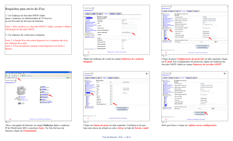 Requisitos para envio do iFax: 1. Um Endereço de Servidor SMTP válido (peça o endereço ao Administrador de TI local ou ao seu Provedor de Serviços de Internet). Nota 1: Para verificar se o Servidor SMTP é válido, consulte o folheto Verificação do Servidor SMTP. 2. Um endereço de e-mail para a máquina. Nota 2: A função iFax não estará disponível se a máquina não tiver um endereço de e-mail. Nota 3: O Fax da Internet somente estará disponível em Preto e Branco. Fig. 1-2 Fig. 1-4 Digite um endereço de e-mail no campo Endereço de e-mail da máquina. Clique na pasta Configurações do protocolo no lado esquerdo, clique em E-mail. Em Configurações do protocolo, digite um Endereço do Servidor SMTP válido no campo Endereço do servidor SMTP. Fig. 1-1 Fig. 1-3 Fig. 1-5 Abra o navegador da Internet, no campo Endereço digite o endereço IP do WorkCentre M24 e pressione Enter. Na Tela Serviços da Internet, clique em Propriedades. Clique em Status da porta no lado esquerdo. Certifique-se de que haja uma marca de seleção na caixa Ativar ao lado de Enviar e-mail. Role para baixo e clique em Aplicar novas configurações. Fax da Internet / iFax - 1 de 6 Guia de Início Rápido Fax da Internet / iFax Fax da Internet / iFax Parte 1 de 3 Fig. 1-6 Digite o nome e a senha do administrador do WorkCentre M24. Clique em OK. Fig. 1-7 Clique em Reinicializar. A reinicialização acontecerá em aproximadamente 5 minutos. Agora que você está pronto para usar o iFax, consulte o folheto Fax da Internet / iFax Parte 2 de 3. Fax da Internet / iFax -2 de 6 Fig. 2-1 Coloque o documento que você está enviando no alimentador de originais. Fig. 2-4 Fig. 2-7 Selecione iFax/Fax. Nota: Se o botão iFax/Fax não estiver sendo exibido, veja os requisitos para o Envio de iFax no folheto Fax da Internet / iFax, Parte 1 de 3. O endereço do destinatário será exibido no campo Endereço no alto da tela. . Fig. 2-2 Fig. 2-5 Pressione Menu. Pressione Teclado. Fig. 2-8 Pressione Iniciar para enviar o documento. Fig. 2-3 Fig. 2-6 Fig. 2-9 Pressione Fax. Usando o teclado e o teclado numérico (veja Figura 2-8), digite o endereço de e-mail do destinatário. A tela Digitalização de documentos será exibida enquanto o documento é digitalizado e enviado. Fax da Internet / iFax -3 de 6 Guia de Início Rápido Fax da Internet / iFax Fax da Internet / iFax Parte 2 de 3 Fax da Internet / iFax -4 de 6 Note: If you will not be using WorkCentre M24 to receive Internet faxes, please disregard this pamphlet. Requirements For iFax Receiving: 1. A known working Mail (POP3) Server Address (obtain the address from your local IT Administrator or Internet Service Provider). 2. A known working username and password for the Mail (POP3) Server from which you are retrieving e-mail. Fig. 3-2 Fig. 3-4 Clique em Status da porta no lado esquerdo. Certifique-se de que haja uma marca de seleção na caixa Ativar ao lado de Receber email. Role para baixo e clique em Aplicar novas configurações. Fig. 3-3 Fig. 3-1 Abra o navegador da Internet, no campo Endereço digite o endereço IP do WorkCentre M24 e pressione Enter. Na Tela Serviços da Internet, clique em Propriedades. No lado esquerdo, clique na pasta Configurações do protocolo e clique em E-mail. Selecione POP3 no campo Protocolo de recebimento. Digite um Endereço do servidor POP3, Nome de usuário POP3, Senha de usuário POP3 e Confirmar senha válidos nos campos adequados. Fax da Internet / iFax -5 de 6 Fig. 3-5 Digite o nome e a senha do administrador do WorkCentre M24. Clique em OK. Guia de Início Rápido Fax da Internet / iFax Fax da Internet / iFax Parte 3 de 3 Fig.3-6 Clique em Reinicializar. A reinicialização acontecerá em aproximadamente 5 minutos. Agora você está pronto para receber e-mail. Nota: O WorkCentre M24 somente receberá mensagens de e-mail em preto e branco. Um documento colorido somente pode ser recebido como um anexo em formato PDF.