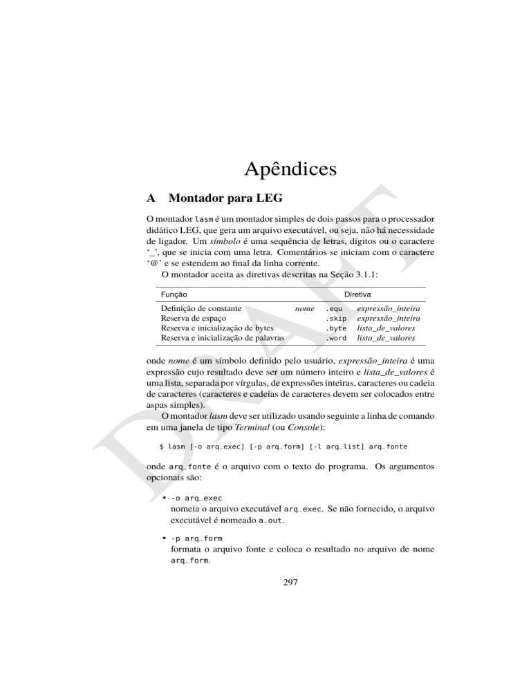 Apêndices A Montador para LEG Função FT O montador lasm é um montador simples de dois passos para o processador didático LEG, que gera um arquivo executável, ou seja, não há necessidade de ligador. Um símbolo é uma sequência de letras, dígitos ou o caractere ‘_’, que se inicia com uma letra. Comentários se iniciam com o caractere ‘@’ e se estendem ao final da linha corrente. O montador aceita as diretivas descritas na Seção 3.1.1: Diretiva nome RA Definição de constante Reserva de espaço Reserva e inicialização de bytes Reserva e inicialização de palavras .equ .skip .byte .word expressão_inteira expressão_inteira lista_de_valores lista_de_valores onde nome é um símbolo definido pelo usuário, expressão_inteira é uma expressão cujo resultado deve ser um número inteiro e lista_de_valores é uma lista, separada por vírgulas, de expressões inteiras, caracteres ou cadeia de caracteres (caracteres e cadeias de caracteres devem ser colocados entre aspas simples). O montador lasm deve ser utilizado usando seguinte a linha de comando em uma janela de tipo Terminal (ou Console): D $ lasm [-o arq_exec] [-p arq_form] [-l arq_list] arq_fonte onde arq_fonte é o arquivo com o texto do programa. Os argumentos opcionais são: • -o arq_exec nomeia o arquivo executável arq_exec. Se não fornecido, o arquivo executável é nomeado a.out. • -p arq_form formata o arquivo fonte e coloca o resultado no arquivo de nome arq_form. 297 APÊNDICES 298 D RA FT • -l arq_list gera um arquivo de listagem, contendo o código gerado em hexadecimal, juntamente com o arquivo fonte, e coloca o resultado no arquivo de nome arq_list. B. SIMULADORES PARA LEG E ARM B 299 Simuladores para LEG e Arm Este apêndice apresenta brevemente as funcionalidades dos simuladores LEG (legsim) e ARM (armsim), com uma descrição sucinta dos comandos disponíveis ao usuário. O simulador deve ser iniciado em uma janela de tipo Terminal (ou Console), com a seguinte linha de comando: [-l arq_exec] [-lc arq_com] [-nw] FT $ xxxsim [-c] [-d arq_disp] onde xxxsim pode ser armsim ou legsim, respectivamente os simuladores para os processadores ARM e LEG. Os argumentos opcionais são: • -c inicia também um painel de console, para entrada e saída de dados, descrito a seguir. RA • -d arq_disp usa o arquivo arq_disp para instalar os dispositivos de E/S especificados. • -l arq_exec carrega na memória o arquivo arq_exec. D • -lc arq_com lê um arquivo de comandos arq_com e executa os comandos especificados. B.1 Convenções Durante a execução, qualquer comando pode ser interrompido pressionando <CTRL>-c (tecla Control e tecla C do teclado pressionadas ao mesmo tempo). O símbolo ‘.’(ponto) é usado para indicar encerramento do comando em comandos de entrada de dados. Todos os números são interpretados como hexadecimais; por exemplo o valor 100 indica 0x100. Além disso, na entrada de dados para o simulador, os números devem iniciar-se com um dígito entre 0 e 9; por exemplo deve-se usar 0ff, e não simplesmente ff, para representar o valor 0xff. APÊNDICES 300 B.2 Ajuda Digite ‘?’ na linha de comando do simulador para listar os comandos disponíveis. Uma saída como a abaixo é mostrada: CARACTERES ESPECIAIS . encerra entrada de dados (ctr-c) interrompe execução de qualquer comando COMANDOS DISPONÍVEIS: b breakpoints | l carrega arquivo constantes e símbolos mostra memória preenche memória go inspeciona memória jornal k mostra ciclos | | | | | | q r s t u x termina execução inspeciona registradores passo a passo trace unassemble mostra estado FT c d f g i j | RA Para saber mais sobre cada comando, digite a letra correspondente ao comando seguida de ‘?’. B.3 Aritmética simples Além dos comandos descritos a seguir, o simulador também permite realizar somas e subtrações entre dois números hexadecimais, digitando a operação desejada diretamente na linha de comando do simulador. Exemplos: • 1000 + 1fa mostra o resultado da adição 0x1000 + 0x1fa. D • 1000 - 1fa mostra o resultado da subtração 0x1000 - 0x1fa. B.4 Comandos Comando b (breakpoint) • b mostra breakpoints correntes. • br ender_ini ender_fim [contador] associa um breakpoint para cada contador acessos para leitura no B. SIMULADORES PARA LEG E ARM 301 intervalo de endereços ender_ini a ender_fim. contador é um número hexadecimal; se não especificado o valor é 1. • bw ender_ini ender_fim [contador] associa um breakpoint para cada contador acessos para escrita no intervalo de endereços ender_ini a ender_fim. contador é um número hexadecimal; se não especificado o valor é 1. FT • bx ender_ini ender_fim [contador] associa um breakpoint para cada contador acessos para execução no intervalo de endereços ender_ini a ender_fim. contador é um número hexadecimal; se não especificado o valor é 1. • br ~ender bw ~ender bx ~ender remove breakpoint do endereço ender. RA • b ~ remove todos os breakpoints. Exemplos: • br mostra breakpoints de acesso de leitura correntes. D • bx 2af2 define breakpoint de execução no endereço 0x2af2, para cada execução. • bw tabela tabela+4 10 define breakpoint no intervalo de endereços tabela até tabela+4, para cada 10 acessos de escrita. • bw ~1000 remove breakpoint de acesso de escrita no endereço 0x1000. • br ~ remove todos os breakpoints. APÊNDICES 302 B.5 Comando c (examina constantes) O comando c permite examinar as constantes importadas do arquivo executável (em geral, rótulos do programa, repassados pelo montador), ou definir e modificar novas constantes. • c mostra todas as constantes e símbolos conhecidos. FT • c nome mostra o endereço associado à constante ou símbolo nome. • c nome ender atribui o endereço ender à constante ou símbolo nome. Exemplos: RA • c inicio mostra o endereço do rótulo inicio. • c volta 2020 associa o símbolo volta ao valor 0x2020. B.6 Comando d (display memory) D • d ender_ini [conta