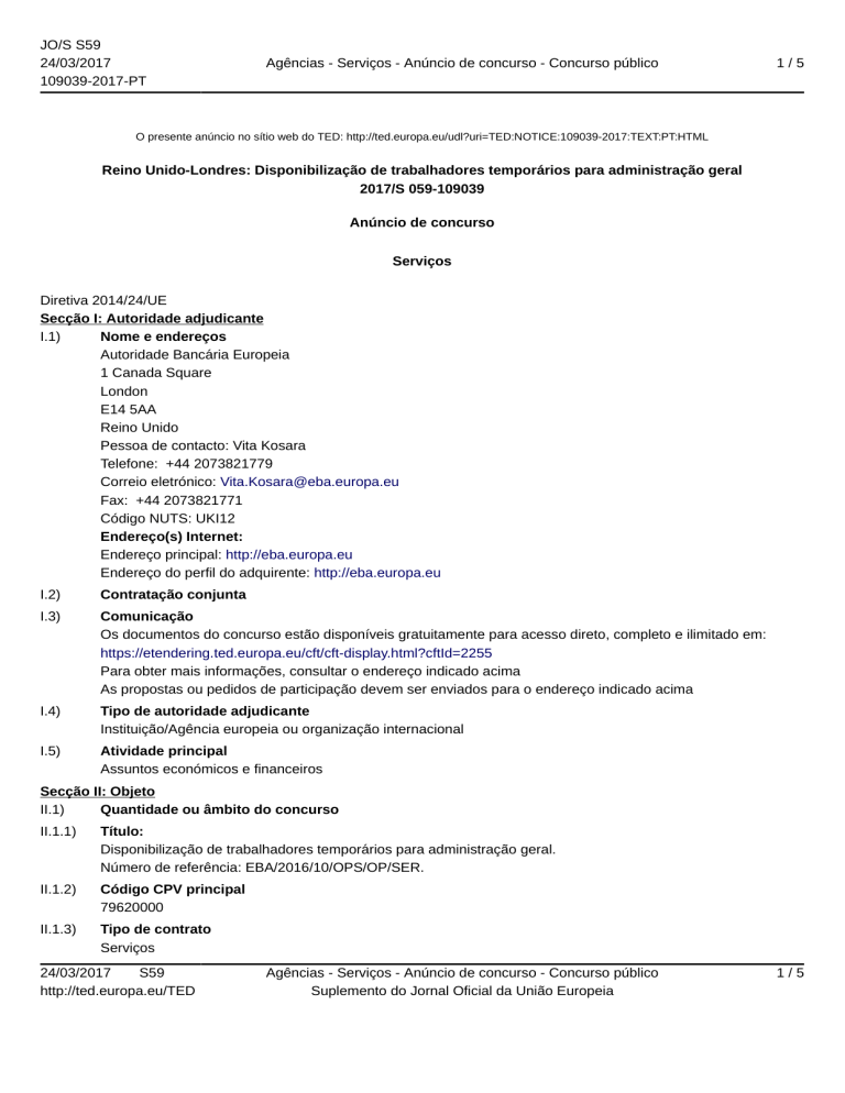 JO/S S59 24/03/2017 109039-2017-PT Agências - Serviços - Anúncio de concurso - Concurso público 1/5 O presente anúncio no sítio web do TED: http://ted.europa.eu/udl?uri=TED:NOTICE:109039-2017:TEXT:PT:HTML Reino Unido-Londres: Disponibilização de trabalhadores temporários para administração geral 2017/S 059-109039 Anúncio de concurso Serviços Diretiva 2014/24/UE Secção I: Autoridade adjudicante I.1) Nome e endereços Autoridade Bancária Europeia 1 Canada Square London E14 5AA Reino Unido Pessoa de contacto: Vita Kosara Telefone: +44 2073821779 Correio eletrónico: [email protected] Fax: +44 2073821771 Código NUTS: UKI12 Endereço(s) Internet: Endereço principal: http://eba.europa.eu Endereço do perfil do adquirente: http://eba.europa.eu I.2) Contratação conjunta I.3) Comunicação Os documentos do concurso estão disponíveis gratuitamente para acesso direto, completo e ilimitado em: https://etendering.ted.europa.eu/cft/cft-display.html?cftId=2255 Para obter mais informações, consultar o endereço indicado acima As propostas ou pedidos de participação devem ser enviados para o endereço indicado acima I.4) Tipo de autoridade adjudicante Instituição/Agência europeia ou organização internacional I.5) Atividade principal Assuntos económicos e financeiros Secção II: Objeto II.1) Quantidade ou âmbito do concurso II.1.1) Título: Disponibilização de trabalhadores temporários para administração geral. Número de referência: EBA/2016/10/OPS/OP/SER. II.1.2) Código CPV principal 79620000 II.1.3) Tipo de contrato Serviços 24/03/2017 S59 http://ted.europa.eu/TED Agências - Serviços - Anúncio de concurso - Concurso público Suplemento do Jornal Oficial da União Europeia 1/5 JO/S S59 24/03/2017 109039-2017-PT Agências - Serviços - Anúncio de concurso - Concurso público 2/5 II.1.4) Descrição resumida: O objeto do contrato consiste na disponibilização de pessoal temporário no domínio da administração geral para a Autoridade Bancária Europeia (EBA). II.1.5) Valor total estimado Valor sem IVA: 2 500 000.00 GBP II.1.6) Informação sobre os lotes Contrato dividido em lotes: não II.2) Descrição II.2.1) Título: II.2.2) Código(s) CPV adicional(is) II.2.3) Local de execução Código NUTS: UKI12 Local principal de execução: Autoridade Bancária Europeia, Floor 46, 1 Canada Square, London, E14 5AA, REINO UNIDO. II.2.4) Descrição do concurso: O objeto do contrato consiste na disponibilização de trabalhadores temporários no domínio da administração geral para a Autoridade Bancária Europeia (EBA). A EBA pode solicitar pessoal temporário pelas seguintes razões: para substituição de funcionários ausentes devido a licença de maternidade, doença ou outra razão, para fazer face aos períodos de maior volume de trabalho, para desempenhar tarefas relacionadas com projetos específicos, para realizar tarefas que requerem competências indisponíveis internamente, para disponibilizar recursos humanos temporários devido à falta de pessoal, etc. O principal objetivo dos acordosquadro previstos consiste em proporcionar uma forma rápida e flexível de satisfazer as necessidades de pessoal temporário da EBA no domínio da administração geral. II.2.5) Critérios de adjudicação O preço não é o único critério de adjudicação e todos os critérios se encontram enunciados apenas na documentação do concurso II.2.6) Valor estimado Valor sem IVA: 2 500 000.00 GBP II.2.7) Duração do contrato, acordo-quadro ou sistema de aquisição dinâmico Duração em meses: 12 O contrato é passível de recondução: sim Descrição das renovações: O contrato-quadro pode ser renovado até 3 vezes por um período de 12 meses cada. II.2.10) Informação sobre as variantes São aceites variantes: não II.2.11) Informação sobre as opções Opções: não II.2.12) Informação relativa a catálogos eletrónicos II.2.13) Informação sobre os fundos da União Europeia O contrato está relacionado com um projeto e/ou programa financiado por fundos da União Europeia: não II.2.14) Informação adicional 24/03/2017 S59 http://ted.europa.eu/TED Agências - Serviços - Anúncio de concurso - Concurso público Suplemento do Jornal Oficial da União Europeia 2/5 JO/S S59 24/03/2017 109039-2017-PT Agências - Serviços - Anúncio de concurso - Concurso público 3/5 A EBA pode exercer a opção de aumentar o limite financeiro do contrato-quadro numa fase posterior através de o um procedimento por negociação para a repetição de serviços similares em conformidade com o artigo 134. , o n. 1, alínea e), das normas de execução aplicáveis ao orçamento-geral da União Europeia. Secção III: Informação de carácter jurídico, económico, financeiro e técnico III.1) Condições de participação III.1.1) Habilitação para o exercício da atividade profissional, incluindo requisitos em matéria de inscrição em registos profissionais ou comerciais Lista e breve descrição das condições: Tal como descrito na documentação do concurso. III.1.2) Capacidade económica e financeira Lista e breve descrição dos critérios de seleção: Tal como descrito na documentação do concurso. Nível(is) mínimo(s) das normas eventualmente aplicáveis: Tal como descrito na documentação do concurso. III.1.3) Capacidade técnica e profissional Lista e breve descrição dos critérios de seleção: Tal como descrito na documentação do concurso. Nível(is) mínimo(s) das normas eventualmente aplicáveis: Tal como descrito na documentação do concurso. III.1.5) Informação sobre contratos reservados III.2) Condições relacionadas com o contrato III.2.1) Informação sobre uma profissão específica III.2.2) Condições de execução do contrato: III.2.3) Informação sobre o pessoal responsável pela execução do contrato Secção IV: Procedimento IV.1) Descrição IV.1.1) Tipo de procedimento Concurso aberto IV.1.3) Informação acerca do acordo-quadro ou siste