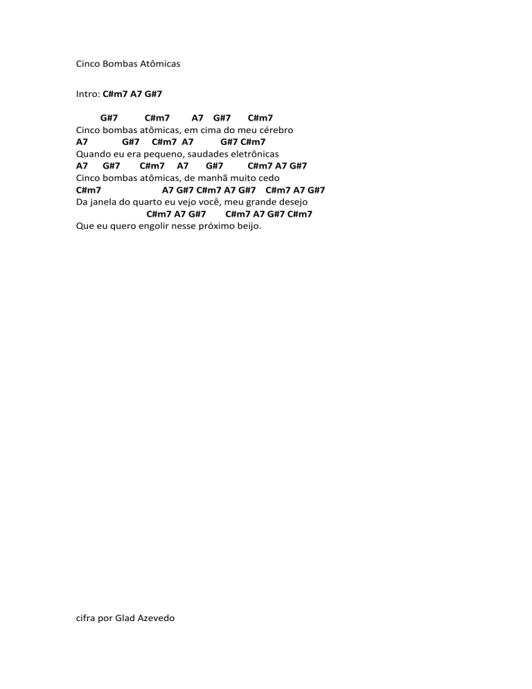 Cinco Bombas Atômicas Intro: C#m7 A7 G#7 G#7 C#m7 A7 G#7 C#m7 Cinco bombas atômicas, em cima do meu cérebro A7 G#7 C#m7 A7 G#7 C#m7 Quando eu era pequeno, saudades eletrônicas A7 G#7 C#m7 A7 G#7 C#m7 A7 G#7 Cinco bombas atômicas, de manhã muito cedo C#m7 A7 G#7 C#m7 A7 G#7 C#m7 A7 G#7 Da janela do quarto eu vejo você, meu grande desejo C#m7 A7 G#7 C#m7 A7 G#7 C#m7 Que eu quero engolir nesse próximo beijo. cifra por Glad Azevedo