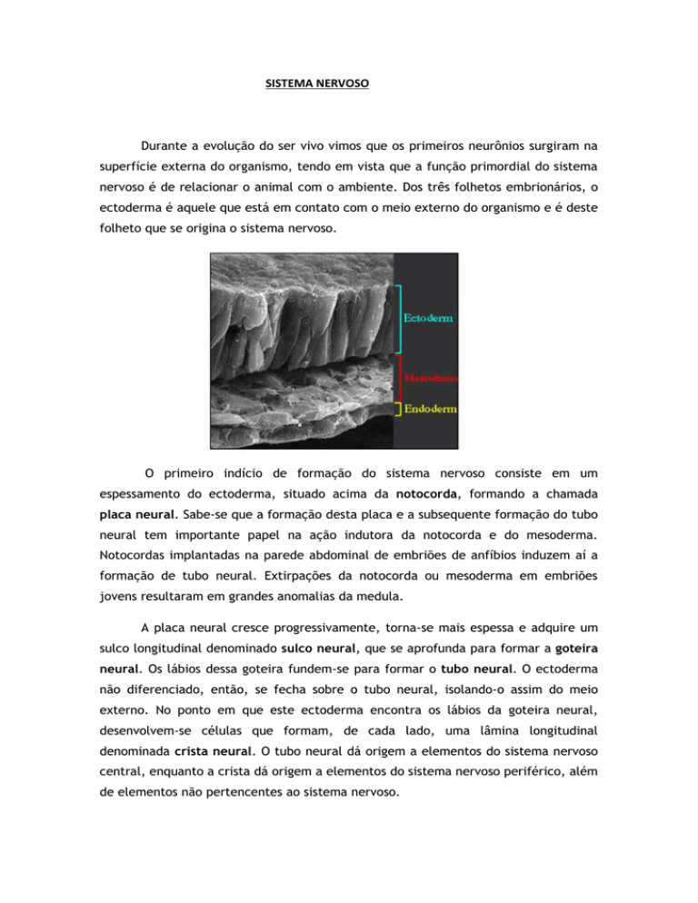 SISTEMA NERVOSO Durante a evolução do ser vivo vimos que os primeiros neurônios surgiram na superfície externa do organismo, tendo em vista que a função primordial do sistema nervoso é de relacionar o animal com o ambiente. Dos três folhetos embrionários, o ectoderma é aquele que está em contato com o meio externo do organismo e é deste folheto que se origina o sistema nervoso. O primeiro indício de formação do sistema nervoso consiste em um espessamento do ectoderma, situado acima da notocorda, formando a chamada placa neural. Sabe-se que a formação desta placa e a subsequente formação do tubo neural tem importante papel na ação indutora da notocorda e do mesoderma. Notocordas implantadas na parede abdominal de embriões de anfíbios induzem aí a formação de tubo neural. Extirpações da notocorda ou mesoderma em embriões jovens resultaram em grandes anomalias da medula. A placa neural cresce progressivamente, torna-se mais espessa e adquire um sulco longitudinal denominado sulco neural, que se aprofunda para formar a goteira neural. Os lábios dessa goteira fundem-se para formar o tubo neural. O ectoderma não diferenciado, então, se fecha sobre o tubo neural, isolando-o assim do meio externo. No ponto em que este ectoderma encontra os lábios da goteira neural, desenvolvem-se células que formam, de cada lado, uma lâmina longitudinal denominada crista neural. O tubo neural dá origem a elementos do sistema nervoso central, enquanto a crista dá origem a elementos do sistema nervoso periférico, além de elementos não pertencentes ao sistema nervoso. Desde o início de sua formação, o calibre do tubo neural não é uniforme. A parte cranial, que dá origem ao encéfalo do adulto, torna-se dilatada e constitui o encéfalo primitivo, ou arquencéfalo; a parte caudal, que dá origem à medula do adulto, permanece com calibre uniforme e constitui a medula primitiva do embrião. No arquencéfalo distinguem-se inicialmente três dilatações, que são as vesículas encefálicas primordiais denominadas: prosencéfalo, mesencéfalo e rombencéfalo. Com o subsequente desenvolvimento do embrião, o prosencéfalo dá origem a duas vesículas, telencéfalo e diencéfalo. O mesencéfalo não se modifica, e o rombencéfalo origina o metencéfalo e o mielencéfalo. O telencéfalo compreende uma parte mediana, da qual se evagina duas porções laterais, as vesículas telencefálicas laterais. A parte mediana é fechada anteriormente por uma lâmina que constitui a porção mais cranial do sistema nervoso e se denomina lâmina terminal. As vesículas telencéfalicas laterais crescem muito para formar os hemisférios cerebrais e escondem quase completamente a parte mediana e o diencéfalo. O diencéfalo apresenta quatro pequenos divertículos: dois laterais, as vesículas ópticas, que formam a retina; um dorsal, que forma a glândula pineal; e um ventral, o infundíbulo, que forma a neurohipófise. Cavidades do tubo neural: a luz do tubo neural permanece no sistema nervoso do adulto, sofrendo, em algumas partes, várias modificações. A luz da medula primitiva forma, no adulto, o canal central da medula. A cavidade dilatada do rombencéfalo forma o IV ventrículo. A cavidade do diencéfalo e a da parte mediana do telencéfalo forma o III ventrículo. A luz do mesencéfalo permanece estreita e constitui o aqueduto cerebral que une o III ao IV ventrículo. A luz das vesículas telencéfalicas laterais forma, de cada lado, os ventrículos laterais, unidos ao III ventrículo pelos dois forames interventriculares. Todas as cavidades são revestidas por um epitélio denominado epêndima e, com exceção do canal central da medula, contêm o líquido cefalorraquidiano (LCR), ou líquor. O sistema nervoso central é aquele localizado dentro do esqueleto axial (cavidade craniana, com exceção dos nervos cranianos, e canal vertebral); o sistema nervoso periférico é aquele que se localiza no esqueleto apendicular. O encéfalo é a parte do sistema nervoso central situado dentro do neurocrânio; e a medula é localizada dentro do canal vertebral. O encéfalo e a medula constituem o neuroeixo. No encéfalo temos cérebro, cerebelo e tronco encefálico. Pode-se dividir o sistema nervoso em sistema nervoso da vida de relação, ou somático, e sistema nervoso da vida vegetativa, ou visceral. O sistema nervoso da vida de relação é aquele que se relaciona o organismo com o meio ambiente, apresentando um componente aferente e outro eferente. O componente aferente conduz aos centros nervosos impulsos originados em receptores periféricos, informando-os sobre o que passa no meio ambiente. O componente eferente leva aos músculos estriados esqueléticos o comando dos centros nervosos resultando em movimentos voluntários. O sistema nervoso visceral é aquele que se relaciona com a inervação e com o controle das vísceras. O componente aferente conduz os impulsos nervosos originados em receptores das vísceras a áreas especificas do sistema nervoso. O componente eferente leva os impulsos originados em centros nervosos até as vísceras. Este componente eferente é também denominado de sistema nervoso autônomo e pode ser dividido em sistema nervoso simpático e parassimpático. O TECIDO NERVOSO O tecido nervoso compreende basicamente dois tipos de celulares: os neurônios e as células da glia (neuróglia). Neurônio: é a unidade estrutural e funcional do sistema nervoso que é especializada para a comunicação rápida. Tem a função básica de receber, processar e enviar informações. Neuróglia: compreende as células que ocupam os espaços entre os neurônios e tem como função sustentação, revestimento ou isolamento, e modulação da atividade neural. Neurônios: são células altamente excitáveis que se comunicam entre si ou com outras células efetuadoras, usando basicamente uma linguagem elétrica. A maioria dos neurônios possui três regiões responsáveis por funç