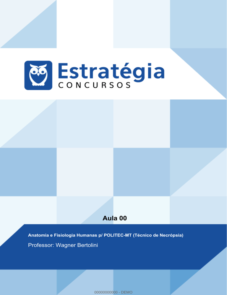 Aula 00 Anatomia e Fisiologia Humanas p/ POLITEC-MT (Técnico de Necrópsia) Professor: Wagner Bertolini 00000000000 - DEMO BIOLÓGICAS TEORIA E EXERCÍCIOS COMENTADOS Prof. WAGNER BERTOLINI AULA: APRESENTAÇÃO DO CURSO SUMÁRIO PÁGINA 1. Saudação e Apresentação do professor 01 2. Apresentação do curso 03 3. Cronograma das Aulas 04 4. Sistema Nervoso 05 5. QUESTÕES 20 1. SAUDAÇÃO E APRESENTAÇÃO DO PROFESSOR Olá meus novos amigos, É com grande satisfação que apresento a vocês este curso de FISIOLOGIA E ANATOMIA, projetado especialmente para ajuda-los a serem aprovados neste concurso para TÉCNICO de NECROPSIA, da POLITEC DO ESTADO DE MATO GROSSO. A escolha da banca nos traz uma dificuldade em selecionar questões para o curso, que seja da POLITEC. Então, usarei questões de diferentes bancas e buscarei o que tiver desta banca. O que encontrar colocarei no simulado. 00000000000 Está é uma das profissões mais respeitadas e valorizadas pelos peritos e Médicos Legistas. Você será um cara que se dedica em prol de todo trabalho que se faz necessário para a Segurança Pública. Sabendo disto, é óbvio que MUITOS candidatos buscarão esta vaga. Muitos já estavam estudando para este concurso. Mesmo sem sair o edital. Portanto, você deve começar já seus estudos, pois, agora com o edital publicado teremos um intervalo de tempo de quase dois meses para sua preparação. E a concorrência será briga de cachorro louco. Prof. Wagner Bertolini www.estrategiaconcursos.com.br 00000000000 - DEMO 1 BIOLÓGICAS TEORIA E EXERCÍCIOS COMENTADOS Prof. WAGNER BERTOLINI A banca escolhida é a POLITEC e a prova está prevista para 21 de maio. Para tranquilizá-lo: se houver alguma modificação ou divergência de conteúdos devido a alterações que possam ocorrer no conteúdo previsto no edital farei as devidas adequações. As datas previstas para as aulas poderão ser modificadas. Mas, coloquei algumas datas em que são datas máximas das postagens, podendo aulas serem antecipadas. Quero tranquilizá-los quanto a isto: tenho 100% do curso feito. Se você conhece algum dos meus cursos sabe que tenho centenas e centenas de questões das bancas mais importantes do país e, principalmente, dos concursos mais recentes. APRESENTAÇÃO DO PROFESSOR Permitam-me fazer uma breve apresentação de minha trajetória acadêmica e profissional: - Sou Perito Criminal da PCSP, atuando na cidade de Ribeirão Preto/SP. - Professor de editoras voltadas a concursos públicos, ministrando diversos cursos e, em especial, na área de Segurança Pública. -Graduado pela Faculdade de Ciências Farmacêuticas pela USP-RP, em 1990; - Mestre em síntese de complexos bioinorgânicos de Rutênio, com liberação de óxido nítrico, pela Faculdade de Ciências Farmacêuticas 00000000000 USP-RP; - Doutor em farmacotécnica, estudando o efeito de promotores de absorção cutânea visando à terapia fotodinâmica para o câncer de pele, Faculdade de Ciências Farmacêuticas pela USP-RP; - Especialista em espectrometria de massas, pela Faculdade de Química, USP-RP; - Professor de Química em ensino Médio e pré-vestibular (Anglo, Objetivo, COC) desde 1992. Prof. Wagner Bertolini www.estrategiaconcursos.com.br 00000000000 - DEMO 2 BIOLÓGICAS TEORIA E EXERCÍCIOS COMENTADOS Prof. WAGNER BERTOLINI - Professor de Química (Orgânica, Geral, Analítica, Físico-Química e Inorgânica) em cursos de graduação; - Professor de Química Farmacêutica, em curso de graduação em Farmácia; - Professor de Pós-Graduação em Biotecnologia (controle de produtos e processos biotecnológicos); - Analista Químico em indústria farmacêutica, AKZO do Brasil, em São Paulo - SP. Espero poder contribuir com a sua capacitação para este concurso e consiga realizar seu sonho, como eu consegui realizar o meu. A felicidade em ver meu aluno ser aprovado é muito grande, pois, indiretamente valoriza meu trabalho e nos dá a satisfação de ver que pude ajudar alguém a atingir seus sonhos. Só para ilustrar: nos últimos concursos diversos alunos que adquiriram meu curso foram aprovados em Perito Criminal de SP; Perito Criminal de Goiás (inclusive, o primeiro colocado foi meu aluno); Papiloscopistas em Goiás e do Distrito Federal; Químicos para o Ministério da Agricultura; diversos cargos em concursos da PETROBRÁS, etc. E tenho grande orgulho em dizer que meus cursos sempre são muitíssimos bem avaliados pelos meus alunos (geralmente 90 a 95% entre ótimo e excelente). 00000000000 Você que é concursando sabe que faço as correções comentadas das questões, analisando as possibilidades de recursos, de anulação, etc. Inclusive, pode acompanhar estas publicações nos grupos do facebook dos quais participo ou sou administrador. 2. APRESENTAÇÃO DO CURSO Prof. Wagner Bertolini www.estrategiaconcursos.com.br 00000000000 - DEMO 3 BIOLÓGICAS TEORIA E EXERCÍCIOS COMENTADOS Prof. WAGNER BERTOLINI Seguem abaixo comentários acerca do conteúdo e da metodologia do nosso curso: Os tópicos são de abordagem compatível com o que é cobrado pelas bancas. Teremos aulas em pdf, com direito a fórum de dúvidas e outros assuntos pertinentes. Alguns vídeos já foram gravados para este concurso. Ainda não terminei a gravação de todas as aulas. Mas, temos vídeos em algumas delas. A proposta do curso é facilitar o seu trabalho e reunir teoria e inúmeros exercícios, no que tange aos assuntos abordados no edital, em um só material. Mas, se atente: INICIALMENTE TEREMOS vídeo em algumas aulas, mas todas as aulas terão PDF. Teremos um simulado bem próximo da data da prova. Servirá como uma revisão. Também servirá como uma avaliação de sua preparação. E ainda há um tempo hábil para reforçar ou rever tópicos em que seu desempenho tenha sido menor. 3. PROGRAMAÇÃO DO CURSO 00000000000 AULA CONTEÚDO ESPECÍFICO TÉCNICO VIDEO NECROPSIA 00 APRESENTAÇÃO. FISIOLOGIA: SISTEMA 5.7 27 MAR NERVOSO 01 SISTEMAS CIRCULATÓRIO E 