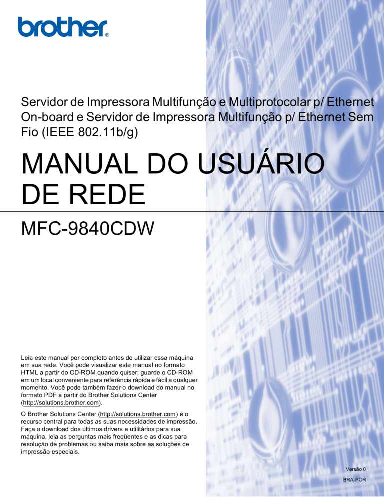Servidor de Impressora Multifunção e Multiprotocolar p/ Ethernet On-board e Servidor de Impressora Multifunção p/ Ethernet Sem Fio (IEEE 802.11b/g) MANUAL DO USUÁRIO DE REDE MFC-9840CDW Leia este manual por completo antes de utilizar essa máquina em sua rede. Você pode visualizar este manual no formato HTML a partir do CD-ROM quando quiser; guarde o CD-ROM em um local conveniente para referência rápida e fácil a qualquer momento. Você pode também fazer o download do manual no formato PDF a partir do Brother Solutions Center (http://solutions.brother.com). O Brother Solutions Center (http://solutions.brother.com) é o recurso central para todas as suas necessidades de impressão. Faça o download dos últimos drivers e utilitários para sua máquina, leia as perguntas mais freqüentes e as dicas para resolução de problemas ou saiba mais sobre as soluções de impressão especiais. Versão 0 BRA-POR Definições de avisos, cuidados e observações Utilizamos o seguinte ícone ao longo deste Manual do Usuário: As observações lhe dizem como você deverá reagir a uma situação que possa surgir ou fornecem dicas sobre como a operação interage com outros recursos. Marcas comerciais Brother e o logotipo da Brother são marcas registradas e BRAdmin Light e BRAdmin Professional são marcas comerciais da Brother Industries, Ltd. UNIX é uma marca registrada do The Open Group. Apple e Macintosh são marcas registradas e Safari é uma marca comercial da Apple, Inc. HP, Hewlett-Packard, Jetdirect e PCL são marcas registradas da Hewlett-Packard Company. PostScript é uma marca registrada da Adobe Systems Incorporated. Microsoft, Windows e Windows Server são marcas registradas da Microsoft Corporation nos EUA e em outros países. Windows Vista é uma marca registrada ou marca comercial da Microsoft Corporation nos EUA e/ou em outros países. BROADCOM, SecureEasySetup e o logotipo do SecureEasySetup são marcas comerciais ou registradas da Broadcom Corporation. Wi-Fi, WPA e WPA2 são marcas registradas da Wi-Fi Alliance. Firefox é uma marca registrada da Mozilla Foundation. Cisco é uma marca registrada da Cisco Systems, Inc. OpenLDAP é uma marca registrada da OpenLDAP Foundation. Todos os outros termos, marcas e nomes de produtos mencionados neste Manual do Usuário são marcas registradas ou comerciais de suas respectivas empresas. Aviso de publicação e compilação Este manual foi compilado e publicado sob a supervisão da Brother Industries Ltd., abrangendo as últimas especificações e descrições do produto. O conteúdo deste manual e as especificações deste produto estão sujeitos a alterações sem aviso prévio. A Brother reserva o direito de fazer alterações sem aviso prévio nas especificações e nos materiais aqui contidos e não se responsabilizará por qualquer dano (incluindo danos indiretos) causados pela confiança nos materiais apresentados, incluindo dentre outros, erros tipográficos e outros erros relativos à publicação. ©2007 Brother Industries Ltd. i NOTA IMPORTANTE Este produto é aprovado para uso somente no país de compra. Não use este produto fora do país de compra, pois ele pode violar os regulamentos de energia e de telecomunicação sem fios daquele país. Neste documento, Windows® XP representa o Windows® XP Professional, Windows® XP Professional x64 Edition e Windows® XP Home Edition. Neste documento, Windows® Server 2003 representa o Windows ® Server 2003 e Windows® Server 2003 x64 Edition. Visite o Brother Solutions Center (http://solutions.brother.com) para obter mais informações sobre o suporte ao Windows® Server 2003 x64 Edition. ii Números da Brother IMPORTANTE Para assistência técnica e operacional, você deverá ligar para o número correspondente no país onde adquiriu a máquina. As chamadas deverão ser feitas de dentro desse país. Para atendimento ao cliente Nos EUA 1-800-284-4329 No Canadá 1-877-BROTHER Na Europa Visite o site http://www.brother.com para obter informações de contato do escritório da Brother local. Localizador de central de assistência técnica (EUA) Para saber a localização de uma central de assistência técnica Brother autorizada, ligue para 1-800-284-4357. Localidades da central de assistência técnica (Canadá) Para a localização de uma central de assistência técnica autorizada Brother, telefone para 1-877-BROTHER. Caso tenha algum comentário ou sugestão, escreva-nos para: Nos EUA Atendimento ao cliente Brother International Corporation 100 Somerset Corporate Boulevard Bridgewater NJ 08807-0911 No Canadá Brother International Corporation (Canada), Ltd. - Marketing Dept. 1 Hôtel de Ville Dollard des Ormeaux, QC H9B 3H6 Canada Na Europa Atendimento ao Produto e Serviço Europeu 1 Tame Street Audenshaw Manchester, M34 5JE, UK Endereço na Internet Site global da Brother na web: http://www.brother.com Para informar-se sobre as perguntas mais freqüentes (FAQs), suporte ao produto, atualizações do driver e utilitários: http://www.brother.com (Somente nos EUA) Para suprimentos e acessórios da Brother: http://www.brothermall.com iii Sistema Brother fax-back (EUA) A Brother implementou um sistema de resposta por fax fácil de utilizar para que você possa obter respostas imediatas a questões técnicas comuns e informações sobre todos os nossos produtos. Este sistema está disponível 24 horas por dia, sete dias por semana. Você pode utilizá-lo para enviar informações para qualquer aparelho de fax. Ligue para o número abaixo e siga as instruções gravadas para receber um fax sobre como utilizar o sistema e um índice dos tópicos sobre os quais você poderá obter informações. Apenas nos EUA 1-800-521-2846 iv Índice 1 Introdução 1 Visão geral.................................................................................................................................................1 Recursos de rede ..........................................................