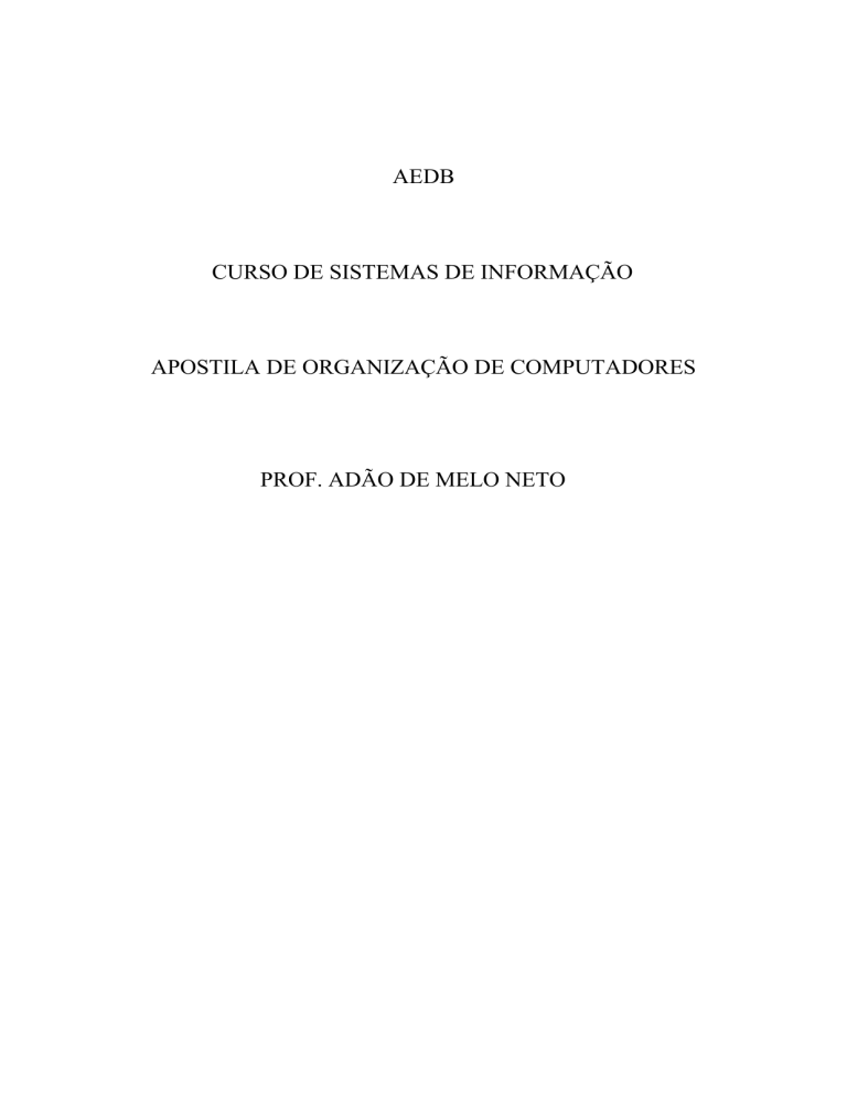 AEDB CURSO DE SISTEMAS DE INFORMAÇÃO APOSTILA DE ORGANIZAÇÃO DE COMPUTADORES PROF. ADÃO DE MELO NETO 2 Organização de Computadores PREFÁCIO Esta apostila não tem a pretensão de ser uma obra inédita no assunto. Constitui-se de uma compilação resumida dos melhores títulos bibliográficos sobre Organização de Computadores. Desta forma, o mérito da produção dos textos é reconhecido aos autores destas obras. Esta apostila é apenas um documento de apoio à disciplina de Organização de Computadores nas instituições de ensino superior. Prof. Adão de Melo Neto Prof. Adão de Melo Neto 1 INTRODUÇÃO, SISTEMAS DE COMPUTAÇÃO, HISTÓRICO Um computador digital é uma combinação de circuitos e dispositivos digirais que podem realizar uma seqüência programada de operações com mínima intervenção humana. E s t a seqüência de operações é chamada de programa. O programa é um conjunto de instruções codificadas que é armazenada na memória interna do computador juntamente com todos os dados de que o programa necessita. 1.1 Organização de um computador Básico Todos os computadores contém cinco elementos ou unidades essenciais: a unidade 1ógica e aritmética (UIA). a unidade de memória, a unidade de controle, a unidade de entrada e a unidade de saída. A interconexão básica destas unidades é apresentada na Figura 1. As setas mais largas representam dados ou informações na verdade consistem em um número relativamente grande de linhas paralelas. As setas mais estreitas, por sua vez , representam sinais de controle que normalmente consistem em uma ou poucas linhas. Fig. 1 – Organização Básica de um Computador Unidade Logica e Aritmetica A ULA e a área do computador na qual as operacões lógicas e aritmeticas são realizadas sobre os dados. 0 tipo de operação realizada édeterminado pelos sinais da unidade de controle (seta 1). Os dados a serem operados pela ULA podem ser oriundos da unidade de memória (seta 2) ou da unidade de entrada (seta 3). Os resultados das operações realizadas na ULA podem ser transferidos tanto para a unidade de memória para armazenamento (seta 4) como para a unidade de saída (seta 5) 1 Unidade de Memoria A memória armazena grupos de dígitos binarios (palavras) que podem representar instruções (programa), que o computador vai executar, e os dados que serãoo manipulados pelo programa . A memória tambem serve para o armazenamento de resultados intermediários ou finais das operações aritméticas (Seta 4). A operação da memória é controlada pela unidade de controle (seta 6), que sinaliza uma operacão de leitura ou uma operação de escrita. Uma determinada posição de memória é acessada pela unidadede controle que fornece o código de endereço apropriado (seta 7). Informações oriundas da ULA ou da unidade de entrada (seta 8) podem serem escritas na memória, também sob o controle da unidade de controle. Informações podem ser lidas da memória para a ULA (seta 2) ou para a unidade de saída (seta 9). Unidade de Entrada A unidade de entrada consiste em todos os dispositivos utilizados para obter informações e dados externos ao computador e colocá-los na unidade de memória (seta 8) ou na ULA (seta 3). A unidade de controle determina para onde a informação de entrada é enviada (seta 10). A unidade de entrada é utilizada para colocar programas e dados na unidade de memória antes de iniciar o pro- cessamento. Esta unidade também é usada para a entrada dados de dispositivos externos na ULA durante a cxecução de um programa . Alguns dispositivos de entrada .comuns sao: teclados, modems, unidades de disco magnético. Unidade de Saida A unidade de saída consiste em dispositivos utilizados para transferir dados e informações do computador para o "mundo exterior". Os dispositivos de saída são acionados sob o comando da unidade de controle (seta 12) e podem receber dados da memória (seta 9) ou da ULA (seta 5). Exemplos de dispositivos de saída comuns sao: displays a LEDs, lâmpadas indicadoras. impressoras, unida des de fita ou disco, monitores de vídeo e conversores D/A. lnterfaceamento Interfaceamento em computadores é definido como a transmissão digital de informacão entre um computador e seus periféricos de modo compatível e sincronizado. Muitos dispositivos de entrada/saida não são diretamente compatíveis com o computador devido a diferença em carac rerísticas como velocidade de operação, formação dos dados (por exemplo: BCD. ASCII. binario). modo de transmissão dos dados (por exemplo: serial, paralelo) e nível 1ógico dos sinais. Estes dispositivos de E/S requisitam circuitos especiais de interface que lhes permitam comunicarem-se com as áreas de controle, memória e ULA do sistema computacional. Unidade de Controle Ela comanda a operaão de todas as outras unidades fornecendo sinais de controle e temporização. De um certo modo a unidade de controle é como o maestro que e responsável por manter cada um dos membros da orquestra em sincronismo. Esta unidade contém circuitos lógicos e de temporização que geram os sinais apropriados necessários para executar cada instrução em um programa. A unidade de controle busca uma instrução da memória enviando um endereco (seta 7) e um comando de leitura (Seta 6) para a unidade de memória. A palavra da instrução armazenada na posiçâo de memória é entao transferida para a unidade de controle (seta 11). Esta palavra da instrucão esta em alguma forma de código binário e é então decodificada pelos circuiros lógicos na unidade de controle para determinar que instrução esta sendo invocada. A unidade de controle utiliza esta informação para enviar os sinais apropriados para as unidades restantes de modo a executar a operação específica. 2 Esta sequencia repetitiva de busca/execução continua até que o computador seja desligado ou que o RESET seja acionado. 0 REET sempre faz o computador buscar sua primeira