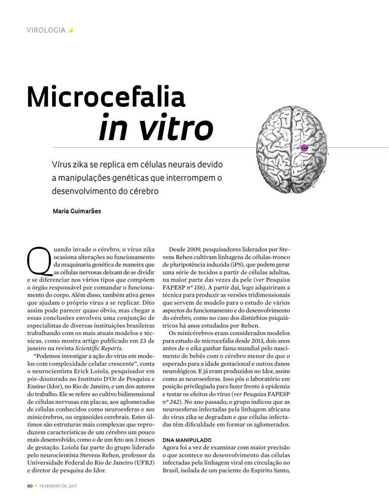virologia y Microcefalia in vitro Vírus zika se replica em células neurais devido a manipulações genéticas que interrompem o desenvolvimento do cérebro Maria Guimarães Q uando invade o cérebro, o vírus zika ocasiona alterações no funcionamento da maquinaria genética de maneira que as células nervosas deixam de se dividir e se diferenciar nos vários tipos que compõem o órgão responsável por comandar o funcionamento do corpo. Além disso, também ativa genes que ajudam o próprio vírus a se replicar. Dito assim pode parecer quase óbvio, mas chegar a essas conclusões envolveu uma conjunção de especialistas de diversas instituições brasileiras trabalhando com os mais atuais modelos e técnicas, como mostra artigo publicado em 23 de janeiro na revista Scientific Reports. “Podemos investigar a ação do vírus em modelos com complexidade celular crescente”, conta o neurocientista Erick Loiola, pesquisador em pós-doutorado no Instituto D’Or de Pesquisa e Ensino (Idor), no Rio de Janeiro, e um dos autores do trabalho. Ele se refere ao cultivo bidimensional de células nervosas em placas, aos aglomerados de células conhecidos como neuroesferas e aos minicérebros, ou organoides cerebrais. Estes últimos são estruturas mais complexas que reproduzem características de um cérebro um pouco mais desenvolvido, como o de um feto aos 3 meses de gestação. Loiola faz parte do grupo liderado pelo neurocientista Stevens Rehen, professor da Universidade Federal do Rio de Janeiro (UFRJ) e diretor de pesquisa do Idor. 50 z fevereiro DE 2017 Desde 2009, pesquisadores liderados por Stevens Rehen cultivam linhagens de células-tronco de pluripotência induzida (iPS), que podem gerar uma série de tecidos a partir de células adultas, na maior parte das vezes da pele (ver Pesquisa FAPESP nº 156). A partir daí, logo adquiriram a técnica para produzir as versões tridimensionais que servem de modelo para o estudo de vários aspectos do funcionamento e do desenvolvimento do cérebro, como no caso dos distúrbios psiquiátricos há anos estudados por Rehen. Os minicérebros eram considerados modelos para estudo de microcefalia desde 2013, dois anos antes de o zika ganhar fama mundial pelo nascimento de bebês com o cérebro menor do que o esperado para a idade gestacional e outros danos neurológicos. E já eram produzidos no Idor, assim como as neuroesferas. Isso pôs o laboratório em posição privilegiada para fazer frente à epidemia e testar os efeitos do vírus (ver Pesquisa FAPESP nº 242). No ano passado, o grupo indicou que as neuroesferas infectadas pela linhagem africana do vírus zika se degradam e que células infectadas têm dificuldade em formar os aglomerados. DNA manipulado Agora foi a vez de examinar com maior precisão o que acontece no desenvolvimento das células infectadas pela linhagem viral em circulação no Brasil, isolada de um paciente do Espírito Santo, foto idor ilustraçãO wikimedia commons e do ponto de vista da sala de comando – os genes. Isso foi possível analisando o RNA e seus produtos – as proteínas – encontrados nas células, como indicação da atividade genética. “Analisamos as neuroesferas logo no início de seu desenvolvimento, antes que as células começassem a morrer”, explica a bióloga Juliana Minardi, que faz estágio de pós-doutorado no Laboratório de Neuroproteômica da Universidade Estadual de Campinas (Unicamp), coordenado pelo biólogo Daniel Martins-de-Souza. Eles já trabalhavam em parceria com o Idor em um projeto sobre esquizofrenia, então foi simples aplicar o mesmo modelo à infecção por zika. A ideia era justamente investigar o que causava a deficiência já observada no desenvolvimento das neuroesferas, quando as células progenitoras se dife- Núcleos das células cerebrais (azul), axônios em formação (verde) e o vírus zika (laranja) destacados em cultura bidimensional renciam em neurônios e células da glia (que formam a estrutura do cérebro). Ao analisar a diferença entre células infectadas e sadias logo nos primeiros dias, eles detectaram alterações na produção de cerca de 500 proteínas – um amplo repertório para causar alterações em uma gama de funções celulares. Depois de identificá-las com base em estudos anteriores, ficou claro que o zika cria um ambiente de instabilidade que turbina a produção de proteínas ligadas ao reparo de DNA. Na prática, porém, essas proteínas acabam inibindo a produção de moléculas associadas à proliferação e à diferenciação das células neurais e replicando o material genético do vírus. O resultado são neuroesferas mais escassas, mirradas e malformadas. “O ambiente promovido pelo vírus nas neuroesferas leva suas células a interromper seu ciclo normal de vida, incluindo a diferenciação em neurônios”, conclui Martins-de-Souza. Para os pesquisadores da Unicamp, esse tipo de olhar detalhado pode ajudar a identificar alvos interessantes de medicamentos que já estão em teste para outras doenças, além de outros ainda não descobertos. Um exemplo de drogas já conhecidas é a cloroquina, usada há décadas contra malária, que em testes com células neurais humanas e neuroesferas de camundongo se mostrou capaz de inibir a proliferação do vírus e a morte de células, de acordo com estudo coordenado pelo virologista Amilcar Tanuri, da UFRJ, em parceria com o grupo de Rehen e publicado em dezembro na revista Viruses (ver Pesquisa FAPESP nº 245). Outra parceria avaliou o antiviral sofosbuvir, normalmente usado contra hepatite C, que revelou efeito protetor em minicérebros em estudo liderado pelo biólogo Thiago Moreno Souza, da Fundação Oswaldo Cruz (Fiocruz) do Rio de Janeiro, publicado em 18 de janeiro na Scientific Reports. Loiola, também coautor desse artigo, considera os resultados altamente promissores, embora nem todos os países tenham aprovado o sofosbuvir para uso em grávidas, cujos fetos são as maiores v