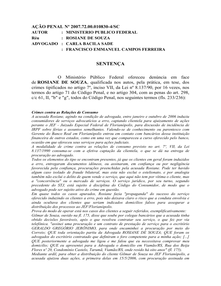 AÇÃO PENAL Nº 2007.72.00.010830-4/SC AUTOR : MINISTERIO PUBLICO FEDERAL Réu : ROSIANE DE SOUZA ADVOGADO : CARLA BACILA SADE : FRANCISCO EMMANUEL CAMPOS FERREIRA SENTENÇA O Ministério Público Federal ofereceu denúncia em face de ROSIANE DE SOUZA, qualificada nos autos, pela prática, em tese, dos crimes tipificados no artigo 7º, inciso VII, da Lei nº 8.137/90, por 16 vezes, nos termos do artigo 71 do Código Penal, e no artigo 304, com as penas do art. 298, c/c 61, II, "b" e "g", todos do Código Penal, nos seguintes termos (fls. 233/236): Crimes contra as Relações de Consumo A acusada Rosiane, agindo na condição de advogada, entre janeiro e outubro de 2006 induziu consumidores de serviços advocatícios a erro, captando clientela para ajuizamento de ações perante o JEF - Juizado Especial Federal de Florianópolis, para discussão de incidência de IRPF sobre férias e assuntos semelhantes. Valendo-se de conhecimento ou parentesco com Gerente do Banco Real em Florianópolis entrou em contato com bancários dessa instituição financeira de outros estados, como em uma vez que compareceu a curso oferecido pelo banco, ocasião em que ofereceu seus serviços para ações judiciais. A modalidade de crime contra as relações de consumo previsto no art. 7º, VII, da Lei 8.137/1990 consuma-se com a efetiva captação da clientela, o que se dá na entrega de procuração ao advogado. Todos os elementos do tipo se encontram presentes, já que os clientes em geral foram induzidos a erro, entregaram documentos idôneos, ou assinaram, em confiança ou por negligência favorecida pela confiança, procurações preenchidas pela acusada Rosiane. Pode ter havido algum caso isolado de fraude bilateral, mas esta não exclui o estelionato, e por analogia também não exclui o delito de quem vende o serviço, que aqui não tem por vítima o cliente, mas a "concorrência" ou o mercado de serviços. O serviço jurídico, por seu turno, segundo precedente do STJ, está sujeito à disciplina do Código do Consumidor, de modo que o advogado pode ser sujeito ativo do crime em questão. Em quase todos os casos apurados, Rosiane fazia "propaganda" do sucesso do serviço oferecido induzindo os clientes a erro, pois não deixava claro o risco que a conduta envolvia e ainda ocultava dos clientes que seriam indicados domicílios falsos para assegurar a distribuição dos processos ao JEF/Florianópolis. Prova do modo de operar está nos casos dos clientes a seguir referidos, exemplificativamente: Gilmar de Souza, ouvido na fl. 175, disse que soube por colegas bancários que a acusada tinha obtido decisões favoráveis, após o que resolveu contratar seu serviço, o que fez por via telefônica. "assinei uma procuração e um contrato de prestação de serviço para o escritório GERALDO GREGÓRIO JERÔNIMO, para onde encaminhei a procuração por meio do Correio; QUE toda orientação partiu da Advogada ROSIANE DE SOUZA; QUE foram os advogados do escritório contratado que definiram o foro competente para a minha ação; [...] QUE posteriormente a advogada me ligou e me falou que eu necessitava comprovar meu domicilio; QUE eu apresentei para a Advogada o domicílio em Viamão/RS, Rua dos Beija Flores nº 20, Condomínio Castelo, Tarumã, Viamão/RS, onde resido há oito anos" (fl. 175). Mediante ardil, para obter a distribuição do cliente Gilmar de Souza no JEF Florianópolis, a acusada ajuizou duas ações, a primeira delas em 15/5/2006, com procuração assinada em 17/5/2006, na qual Gilmar foi qualificado pela acusada como tendo domicílio na Rua Irmãos Vieira, 283, apto. 701, Campinas (doc. fl. 65). Que o endereço falso foi posto pela acusada é provado pelas declarações do cliente e também pela circunstância provada de que esse endereço também foi utilizado para qualificar outro cliente de Rosiane, domiciliado em Porto Alegre, como se vê da procuração assinada em 20 de abril de 2006 por José Antonio Silveira Silva, cujo domicílio real é Porto Alegre, e que em suas declarações disse que "assinei procuração conforme orientado pela minha advogada" (fl. 170). No segundo processo de Gilmar, distribuído em 25/10/2006, Rosiane usou o ardil de qualificar o cliente como tendo domicílio na Rua Desembargador Gil Costa, 310, ap. 404, Bloco B, Residencial Angra dos Reis, Estreito (fl. 9), que vem a ser o endereço de domicílio dela mesma, Rosiane. Em vários outros casos, a acusada valeu-se do ardil de dizer que os clientes, os quais ela sabia que tinham domicílio fora da área de competência do JEF Florianópolis, teriam "endereço comercial" na Av. Álvaro de Carvalho, 307, endereço do Banco Real em Florianópolis, sabendo, por dever de ofício, que devia indicar o endereço verdadeiro de residência do cliente, e não do banco. A prova indica que muitos não sabiam que esse "endereço comercial" era posto na procuração com o fim de fixar a competência da Justiça Federal para a ação. A maioria dos clientes assinou as procurações com esse "endereço comercial" ou com outro endereço falso, em confiança ou sem reparar. Assim, por exemplo, Dagoberto Zunder Nogueira, que aparece como tendo domicílio no mesmo prédio de residência da acusada Rosiane, na Rua Des. Gil Costa, 310, com diferença no nº do apartamento que é o 105, Bloco B, declarou não saber por que a acusada indicou outro endereço, mas que ela "postou uma procuração pronta por e-mail, que o declarante assinou sem a menor desconfiança e encaminhou de volta junto com os documentos do Banco; QUE em seus documentos não havia nenhum que indicasse seu endereço em Florianópolis, nem os fornecidos pelo banco, nem tampouco adulterou nenhum documento para que constasse algum endereço em SC" (fl. 205). Entre os clientes captados por Rosiane nesse modo de operar estão: 1. Gilmar de Souza, por duas vezes, em 17/05/2006 2. e 17/10/2006 (fls. 65 e 9), qualificado com endereço falso por duas vezes, na forma descrita aci
