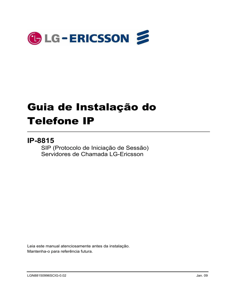 Guia de Instalação do Telefone IP IP-8815 SIP (Protocolo de Iniciação de Sessão) Servidores de Chamada LG-Ericsson Leia este manual atenciosamente antes da instalação. Mantenha-o para referência futura. LGN88150996SCIG-0.02 Jan. 09 IP-8815 Ericsson Guia de Instalação Notificações de Segurança e Regulamentares IP-8815 1. Emissões de radiofrequência Declaração de Conformidade da FCC (Comissão Federal de Comunicação): Este dispositivo obedece às regras da Parte 15. A operação está sujeita às seguintes condições; 1. Este dispositivo não pode causar interferência prejudicial, e 2. Este dispositivo deve aceitar qualquer interferência recebida, incluindo interferências que possam causar operação não desejada. Este Equipamento foi testado e revelou estar em conformidade com os limites para um dispositivo digital de Classe B, de acordo com a Parte 15 das regras da FCC. Esses limites destinam-se a fornecer proteção razoável contra interferência prejudicial em uma instalação residencial. Este equipamento gera, utiliza e pode radiar energia de radiofrequência e, se não for instalado e utilizado de acordo com as instruções, pode causar interferência prejudicial às comunicações de rádio. Contudo, não há garantias de que a interferência não ocorrerá em uma instalação específica. Se este equipamento causar interferência prejudicial à recepção de radio ou televisão, que possa ser determinada desligando e ligando o equipamento, o usuário é encorajado a tentar corrigir a interferência tomando uma das seguintes medidas: • Reorientar ou deslocar a antena receptora. • Aumentar a separação entre o equipamento e o receptor. • Conectar o equipamento em uma tomada em um circuito diferente daquele em que o receptor esteja conectado Se os problemas persistirem, consulte o fornecedor ou um técnico especialista em rádio/TV para obter ajuda. Declaração de Conformidade Canadense: Este aparelho digital de Classe B está de acordo com o ICES-003 canadense. Cet appareil numérique de la classe B est conforme à la norme NMB-003 du Canada. Este Aparelho está de acordo com os Limites da Classe B da Indústria do Canadá. A operação está sujeita às seguintes duas condições; 1. Este dispositivo não deve causar interferência prejudicial, e 2. Este dispositivo deve aceitar qualquer interferência recebida, incluindo interferências que possam causar operação não desejada. Declarações de Conformidade da União Européia: A LG-Ericsson Co. Ltd. declara que o equipamento especificado neste documento, que carrega a marca “CE”, está em conformidade com as Diretrizes de Equipamento de Terminal de Rádio e Telecomunicações da União Européia (R&TTE 1999/5/EC) incluindo, Diretriz de Compatibilidade Eletromagnética (89/336/EEC) e Diretriz de Baixa Voltagem (73/23/EEC) O produto cumpre com os requisitos essenciais dos padrões harmonizados exibidos acima. 2. Instruções de Segurança de Produto Este produto cumpre e está de acordo com os seguintes Padrões Internacionais de Segurança de, conforme aplicável: Segurança de Equipamentos de Tecnologia da Informação, IEC 6095-1, incluindo: Desvios nacionais relevantes conforme listados de acordo com o IEC para Equipamentos Elétricos (IECEE) 3. E-911 e uso do IP-8815 com Sistemas Telefônicos Multilinha Observe que o uso e a operação deste telefone como parte de um sistema telefônico multilinha (MLTS) podem estar sujeitos às leis estaduais e/ou federais E-911 MLTS, que exigem que o MLTS forneça um número de telefone, uma extensão e um local físico no estado aplicável e/ou serviços de emergência local quando um cliente inicia uma chamada de emergência. O MLTS pode não fornecer ao cliente uma informação de número de telefone, extensão ou local físico para serviços de emergência quando o cliente liga para a emergência, e a conformidade com as leis estaduais e/ou federais MLTS é de responsabilidade exclusiva do comprador deste telefone. 4. Privacidade: O IP-8815 executa as tecnologias de segurança e criptografia, contudo, a privacidade das comunicações não pode ser garantida ao utilizar este telefone. Copyright© 2008 LG-Ericsson Co. Ltd. Todos os Direitos Reservados Este material está sujeito aos direitos autorais pela LG-Ericsson Co Ltd. Qualquer reprodução, uso ou divulgação não autorizada deste material, ou de qualquer parte dele, é estritamente proibida é representa uma violação das Leis de Direitos Autorais. A LGEricsson reserva o direito de fazer alterações nas especificações a qualquer momento, sem notificação. As informações fornecidas pela LG Ericsson neste material são consideradas exatas e confiáveis, mas não são garantidas como sendo verdadeiras em todos os casos. A LG-Ericsson é uma marca registrada da LG-Ericsson Co. Ltd. Todas as outras marcas e nomes de produtos são marcas ou marcas registradas de suas respectivas empresas. IP-8815 Ericsson Guia de Instalação Cuidados e Precauções: Antes de conectar ou utilizar seu novo telefone, reserve um momento para considerar a segurança e a confiabilidade. Utilize o bom senso ao alocar, conectar e utilizar seu Telefone IP IP-8815. • Coloque-o em uma superfície plana e seca. Mantenha o telefone longe das extremidades da superfície para evitar a possibilidade de queda. • Coloque os cabos de forma a evitar a possibilidade de danos. Por exemplo, não os coloque embaixo de tapetes ou carpetes, pois o dano pode resultar da passagem das pessoas ou objetos pesados. Além disso, não coloque os cabos entre a mesa e as paredes, onde eles podem ser comprimidos, danificando o isolamento. • Verifique os cabos regularmente e, se notar danos, desconecte seu telefone. Entre em contato com seu representante legal para realizar a substituição. • Se for derramado líquido no telefone, desconecte a unidade da energia e rede. • Não utilize o telefone durante trovoadas. Relâmpagos apresen