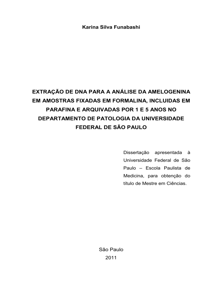 Karina Silva Funabashi EXTRAÇÃO DE DNA PARA A ANÁLISE DA AMELOGENINA EM AMOSTRAS FIXADAS EM FORMALINA, INCLUIDAS EM PARAFINA E ARQUIVADAS POR 1 E 5 ANOS NO DEPARTAMENTO DE PATOLOGIA DA UNIVERSIDADE FEDERAL DE SÃO PAULO Dissertação apresentada à Universidade Federal de São Paulo – Escola Paulista de Medicina, para obtenção do título de Mestre em Ciências. São Paulo 2011 Karina Silva Funabashi EXTRAÇÃO DE DNA PARA A ANÁLISE DA AMELOGENINA EM AMOSTRAS FIXADAS EM FORMALINA, INCLUIDAS EM PARAFINA E ARQUIVADAS POR 1 E 5 ANOS NO DEPARTAMENTO DE PATOLOGIA DA UNIVERSIDADE FEDERAL DE SÃO PAULO Dissertação apresentada à Universidade Federal de São Paulo – Escola Paulista de Medicina, para obtenção do título de Mestre em Ciências. Orientadora: Profa. Dra. Edna Sadayo Miazato Iwamura São Paulo 2011 ii Funabashi, Karina Silva Univ Extração de DNA para a análise da amelogenina em amostras fixadas em formalina, incluídas em parafina e arquivadas por 1 e 5 anos no Departamento de Patologia da Universidade Federal de São Paulo. / Karina Silva Funabashi. – São Paulo, 2011. xviii, 99f. Dissertação (Mestrado) – Universidade Federal de São Paulo. Escola Paulista de Medicina. Programa de Pós-graduação em Patologia. Título em inglês: DNA extraction for amelogenin analysis in formalin fixed, paraffin embedded samples stored for 1 and 5 years from Department of Pathology of Federal University of São Paulo. 1. amelogenina 2. extração de DNA 3. parafina. iii UNIVERSIDADE FEDERAL DE SÃO PAULO ESCOLA PAULISTA DE MEDICINA DEPARTAMENTO DE PATOLOGIA Chefe do Departamento: Profa. Dra. Maria Teresa Seixas Alves Coordenadora do Curso de Pós-graduação: Profa. Dra. Silvia Saiuli Miki Ihara iv Karina Silva Funabashi EXTRAÇÃO DE DNA PARA A ANÁLISE DA AMELOGENINA EM AMOSTRAS FIXADAS EM FORMALINA, INCLUIDAS EM PARAFINA E ARQUIVADAS POR 1 E 5 ANOS NO DEPARTAMENTO DE PATOLOGIA DA UNIVERSIDADE FEDERAL DE SÃO PAULO Presidente da banca: Prof.ª Dr.ª Edna Sadayo Miazato Iwamura BANCA EXAMINADORA Prof. Dr. Gilles Landman Prof.ª Dr.ª Janete Maria Cerutti Prof. Dr. Rogério Nogueira de Oliveira Aprovada em: 23/02/2011. v DEDICATÓRIA Aos meus pais Mitur e Maria Luiza, que sempre iluminaram os meus caminhos com muito amor e amizade, vibrando com minhas vitórias e incentivando nos momentos difíceis. Ao Prof. Dr. Antonio Sesso, Pesquisador Associado do Instituto de Medicina Tropical de São Paulo pela Universidade de São Paulo, pela transmissão de conhecimentos científicos, com grandes e valiosos ensinamentos. A todos os docentes e funcionários que de alguma forma participaram deste trabalho. À Universidade Federal de São Paulo – Escola Paulista de Medicina UNIFESP/EPM. vi AGRADECIMENTO ESPECIAL À Profa. Dra. Edna Sadayo Miazato Iwamura, Professora Adjunta do Departamento de Patologia da UNIFESP-EPM, orientadora deste trabalho, pela oportunidade, confiança a mim depositada e por todos os ensinamentos científicos e intelectuais que colaboraram para minha formação. vii AGRADECIMENTOS À Fundação de Amparo à Pesquisa do Estado de São Paulo (FAPESP) por fornecer os recursos financeiros para o desenvolvimento dessa pesquisa através do processo de número 2008/11233-8. À Coordenação de Aperfeiçoamento de Pessoal de Nível Superior (CAPES) pelo apoio financeiro. viii AGRADECIMENTOS À Universidade Federal de São Paulo – Escola Paulista de Medicina – UNIFESP/EPM, por ter me recebido como aluna do Programa de Pósgraduação em Patologia e possibilitando minha titulação; Aos docentes do Programa de Pós-graduação em Patologia da UNIFESP/EPM, pelos ensinamentos, apoio, críticas e exemplo como docentes e pesquisadores; À Dra. Silvia Saiuli Miki Ihara, coordenadora do programa de Pós-graduação em Patologia da UNIFESP/EPM, pela receptividade e auxílio; À médica patologista do Departamento de Patologia da UNIFESP/EPM, Dra. Iria Visoná, que muito colaborou na realização deste trabalho, principalmente na análise histológica das amostras; Aos residentes do Departamento de Patologia da UNIFESP/EPM, que muito colaboraram na realização deste trabalho, principalmente na coleta e seleção das amostras; Aos funcionários do Departamento de Patologia da UNIFESP/EPM, Daniel Rosa Filho, Vera Cotrim, Angélica Maria da Silva, Arquimedes Leonardi, José Sérgio Alves e Fátima de Seixas, pela simpatia, receptividade e apoio ao meu trabalho; Ao Joaquim Soares de Almeida, biólogo e técnico de laboratório do Departamento de Patologia da UNIFESP/EPM, pela simpatia, disponibilidade e por preparar com habilidade e atenção os cortes dos blocos de parafina para este trabalho; ix Às secretárias do Programa de Pós-graduação em Patologia da UNIFESP/EPM Virgínia Silva e Jeniffer Oliveira, pelo atendimento atencioso quando precisava de auxílio; Aos secretários Norberto Silva Lobo e Denise Pelegrini, pela simpatia e auxílio; Aos colegas do Programa de Pós-graduação em Patologia da UNIFESP/EPM, pela convivência e experiências trocadas para a formação profissional; Ao Marcos Araújo Sobrinho, pelo companheirismo, auxílio e compreensão durante todo este trabalho; Aos amigos que acompanharam todo o projeto: Valéria Fernandes, Orlando Piubelli, Alpio Stanchi, Suellen Albertão e Márcia Nascimento. Obrigada pelo apoio, carinho e suporte. Aos colegas Carla Godoy, Mirella Soler, Marcelo Silva e Denise Barcelos, pela convivência, amizade, formação de espírito crítico e auxílio para o desenvolvimento deste trabalho. Vocês foram de suma importância para o meu crescimento profissional, intelectual e pessoal. x "O mistério gera curiosidade e a curiosidade é a base do desejo humano para compreender. " (Neil Armstrong) xi SUMÁRIO Dedicatória ........................................................................................ vi Agradecimentos ............................................................................... vii Epígrafe ............