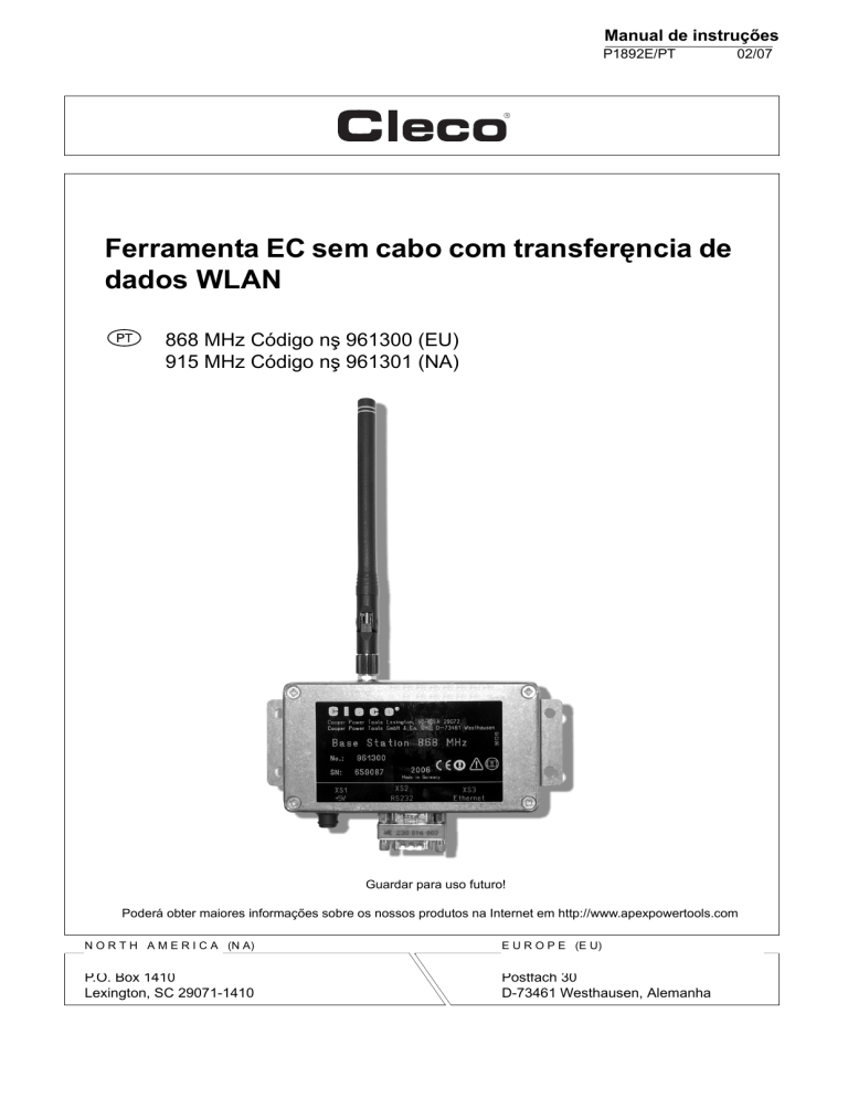Manual de instruçőes P1892E/PT 02/07 Ferramenta EC sem cabo com transferęncia de dados WLAN PT 868 MHz Código nş 961300 (EU) 915 MHz Código nş 961301 (NA) Guardar para uso futuro! Poderá obter maiores informaçőes sobre os nossos produtos na Internet em http://www.apexpowertools.com N O R T H A M E R I C A (N A) E U R O P E (E U) P.O. Box 1410 Lexington, SC 29071-1410 Postfach 30 D-73461 Westhausen, Alemanha Sobre este manual de instruçőes O presente manual de instruçőes descreve a Ferramenta EC sem cabo com transferęncia de dados WLAN 868 MHz e 915 MHz. A Ferramenta EC sem cabo com transferęncia de dados WLAN destina-se ŕ comunicaçăo sem fio das ferramentas sem fio EC com um controle. As ferramentas EC sem fio das séries 17BR…, 17BF…, 47BR… e 47BF… da Apex Tool Group possuem uma interface de rádio que comunica com a Ferramenta EC sem cabo com transferęncia de dados WLAN com um controle. A Ferramenta EC sem cabo com transferęncia de dados WLAN é conectada ao controle com um cabo, estabelecendo a conexăo de rádio com uma ferramenta sem fio. O manual de instruçőes descreve • o hardware e a conexăo • a instalaçăo e a configuraçăo do software • Dados técnicos Convençőes de escrita Para uma melhor visăo geral foram usadas as seguintes convençőes no texto: itálicos As opçőes de menu estăo identificadas em itálicos por ex.: Diagnóstico <…> Os elementos que devem ser selecionados ou desselecionados, tais como, botőes, teclas ou caixas de verificaçăo, estăo colocados entre paręntesis retos por ex.: <F5> Courier Nomes de caminhos e arquivos estăo identificados pelo formato de letra "Courier" por ex.: setup.exe \ Uma barra invertida entre dois nomes significa a seleçăo de uma opçăo do menu por ex.: file \ print (imprimir\arquivo) Declaraçăo de reserva Apex Tool Group se reserva o direito de efetuar alteraçőes, complementaçőes ou melhorias, seja no documento seja no produto, sem aviso prévio. É proibido reproduzir total ou parcialmente este documento, por qualquer meio ou processo, sem consentimento expresso por parte de Apex Tool Group. O documento também năo deve ser convertido para qualquer tipo de linguagem natural ou legível por máquinas ou salvado em suporte de dados, seja eletrônico, mecânico, óptico ou outra forma. 2 P1892E/PT 02/07 92a_ Deckblatt pt.fm, 03.05.2007 Índice 1 Segurança 5 1.1 1.2 1.3 1.4 1.5 Apresentação das Indicações............................................................... Princípios de um trabalho seguro ......................................................... Formação do pessoal ........................................................................... Operação de acordo com as especificações........................................ Normas / padrões ................................................................................. 5 5 5 6 6 2 Conteúdo do fornecimento, transporte e condições ambientais7 2.1 2.2 2.3 Conteúdo do fornecimento ................................................................... 7 Transporte ............................................................................................ 8 Condições ambientais .......................................................................... 8 3 Requisitos de PC 8 4 Descrição do sistema 9 4.1 4.2 Informação geral................................................................................... 9 Visão geral do sistema ....................................................................... 10 5 Hardware de instalação 11 5.1 5.1.1 5.1.2 5.1.3 5.2 Conexão ............................................................................................. Rede local sem switch ........................................................................ Rede local com switch ........................................................................ Rede existente.................................................................................... Cabo de conexão Ethernet ................................................................. 12 13 14 15 16 6 Instalação - Software »Network Enabler Administrator« 17 7 Configuração 17 7.1 Busque as Ferramenta EC sem cabo com transferência de dados WLANs disponíveis na rede................................................ Consulte a Ferramenta EC sem cabo com transferência de dados WLAN.................................................................................. Configuração da Ferramenta EC sem cabo com transferência de dados WLAN para utilização de um endereço IP estático............. Configuração da Ferramenta EC sem cabo com transferência de dados WLAN para utilização de um endereço IP dinâmico........... 7.2 7.3 7.4 P1892E_PT Basis Station 868 915 0207IVZ.fm, 03.05.2007 P1892E/PT 02/07 17 18 19 20 3 4 8 Resolução de problemas 21 9 Dados técnicos 25 9.1 9.1.1 9.1.2 9.2 9.3 9.3.1 9.3.2 9.3.3 Ferramenta EC sem cabo com transferência de dados WLAN.......... Transferência de dados 868 MHz....................................................... Transferência de dados 915 MHz....................................................... Adaptador de rede .............................................................................. Conectores e atribuição de pinos ....................................................... Conector »XS1« para adaptador de rede........................................... Conector »XS1« para RS232, D Sub, 9 pólos pino............................ Conector »XS3« para Ethernet, RJ-45 CN......................................... 25 25 25 26 26 26 26 27 10 Assistência técnica 27 11 Eliminação 27 P1892E/PT 02/07 P1892E_PT Basis Station 868 915 0207IVZ.fm, 03.05.2007 Segurança 1 Segurança 1.1 Apresentaçăo das Indicaçőes 1 CUIDADO! Situaçăo possivelmente prejudicial para a saúde das pessoas ou possíveis danos materiais ou ao meio ambiente. Se este aviso năo for observado, podem ocorrer ferimentos, danos ma