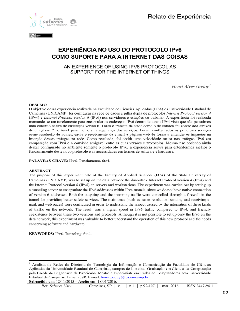 Relato de Experiência EXPERIÊNCIA NO USO DO PROTOCOLO IPv6 COMO SUPORTE PARA A INTERNET DAS COISAS AN EXPERIENCE OF USING IPV6 PROTOCOL AS SUPPORT FOR THE INTERNET OF THINGS Henri Alves Godoy 1 RESUMO O objetivo dessa experiência realizada na Faculdade de Ciências Aplicadas (FCA) da Universidade Estadual de Campinas (UNICAMP) foi configurar na rede de dados a pilha dupla de protocolos Internet Protocol version 4 (IPv4) e Internet Protocol version 6 (IPv6) nos servidores e estações de trabalho. A experiência foi realizada montando-se um tunelamento para encapsular os endereços IPv6 dentro de tuneis IPv4 visto que não possuímos uma conexão nativa de endereços versão 6. Tanto o trânsito de saída como o de entrada foi controlado através de um firewall no túnel para melhorar a segurança dos serviços. Foram configurados os principais serviços como resolução de nomes, envio e recebimento de e-mail e páginas web de forma a entender os impactos na inserção desses tráfegos na rede. Como resultado, foi obtida uma velocidade maior nos tráfegos IPv6 em comparação com IPv4 e o convívio amigável entre as duas versões e protocolos. Mesmo não podendo ainda deixar configurado no ambiente somente o protocolo IPv6, a experiência serviu para entendermos melhor o funcionamento deste novo protocolo e as necessidades em termos de software e hardware. PALAVRAS-CHAVE: IPv6. Tunelamento. 6to4. ABSTRACT The purpose of this experiment held at the Faculty of Applied Sciences (FCA) of the State University of Campinas (UNICAMP) was to set up on the data network the dual-stack Internet Protocol version 4 (IPv4) and the Internet Protocol version 6 (IPv6) on servers and workstations. The experiment was carried out by setting up a tunneling server to encapsulate the IPv6 addresses within IPv4 tunnels, since we do not have native connection of version 6 addresses. Both the outgoing and the incoming traffic were controlled through a firewall in the tunnel for providing better safety services. The main ones (such as name resolution, sending and receiving email, and web pages) were configured in order to understand the impact caused by the integration of these kinds of traffic on the network. The result was a higher speed in IPv6 traffic compared to IPv4, and friendly coexistence between these two versions and protocols. Although it is not possible to set up only the IPv6 on the data network, this experiment was valuable to better understand the operation of this new protocol and the needs concerning software and hardware. KEYWORDS: IPv6. Tunneling. 6to4. 1 Analista de Redes da Diretoria de Tecnologia da Informação e Comunicação da Faculdade de Ciências Aplicadas da Universidade Estadual de Campinas, campus de Limeira. Graduação em Ciência da Computação pela Escola de Engenharia de Piracicaba. Mestre e Especialista em Redes de Computadores pela Universidade Estadual de Campinas. Limeira, SP. E-mail: [email protected] Submetido em: 12/11/2015 – Aceito em: 18/01/2016. Rev. Saberes Univ. Campinas, SP v.1 n.1 p.92-107 mar. 2016 ISSN 2447-9411 92 Relato de Experiência INTRODUÇÃO O esgotamento de endereços de IPv4 é evidente (LACNIC, 2014) e cada vez mais a nova versão do IPv6 tem sido uma das alternativas viáveis para que a Internet continue crescendo, além de ser a única tecnologia possível para construir a Internet da Coisas. Em um futuro próximo, bilhões de dispositivos (coisas ao nosso redor) serão conectados à Internet. A cada dia novos serviços surgem na Internet e com o IPv4 será impossível atribuir endereços IP a todos esses serviços e dispositivos. Para que essa transição aconteça, é necessário uma alteração no tamanho do endereço identificador de rede, o IP. Esse tamanho, que no IPv4 é de 32 bits, passa agora na nova versão para 128 bits além da introdução da notação em hexadecimal com 8 palavras e de 16 bits cada, por exemplo: 2801:8a:c040:fca0:2954:5001:6437:7fc8. A experiência foi motivada primeiramente para adquirir conhecimento sobre o comportamento desse novo protocolo em conjunto com a infraestrutura de rede atual para analisar quais problemas poderíamos encontrar e como nos preparar para a Internet das Coisas. Além disso, seria possível a um docente ou visitante dispor de um endereço IPv6 ativo nas estações de trabalho, caso precisasse acessar alguma pesquisa ou documento fora ou dentro do Brasil que estivesse somente acessível através do protocolo IPv6. Como a Faculdade de Ciências Aplicadas da UNICAMP (FCA) em 2012 participou do WorldLaunch IPv6 (INTERNET SOCIETY, 2012), foi possível colocar o seu site principal acessível em IPv6. Com isso, foram gerados questionamentos como: o que aconteceria se ativássemos outros serviços como e-mail e resolução de nomes? Como ficaria a navegação web utilizando IPv6? Quais os impactos em relação ao desempenho, problemas de configuração nas estações de trabalho e suporte a esse novo protocolo? Para responder a todos esses questionamentos, foram realizadas experiências com o protocolo IPv6 em conjunto com a infraestrutura de rede existente. O objetivo principal foi ativar o protocolo IPv6 em diversos serviços básicos como por exemplo: HyperText Transfer Protocol (HTTP), Domain Name System (DNS), Post Office Protocol (POP), Simple Mail Transport Protocol (SMTP), Internet Message Access Protocol (IMAP). Adicionalmente, havia a intenção de entregar um endereço IPv6 além do endereço IPv4 atual, trabalhando assim em pilha dupla. Por ser considerada uma unidade remota da UNICAMP, situada na cidade de Limeira – São Paulo, todo nosso tráfego de rede depende de uma conexão até o Centro de Computação em Barão Geraldo – Campinas, através de um enlace de dados fornecido pelo Governo Estadual de São Paulo chamado IntraGov (SÃO PAULO, 2014) o qual fornece hoje apenas trânsito IPv4. Precisávamos então encontrar uma solução para escoar todo tráfego IPv6, além de u