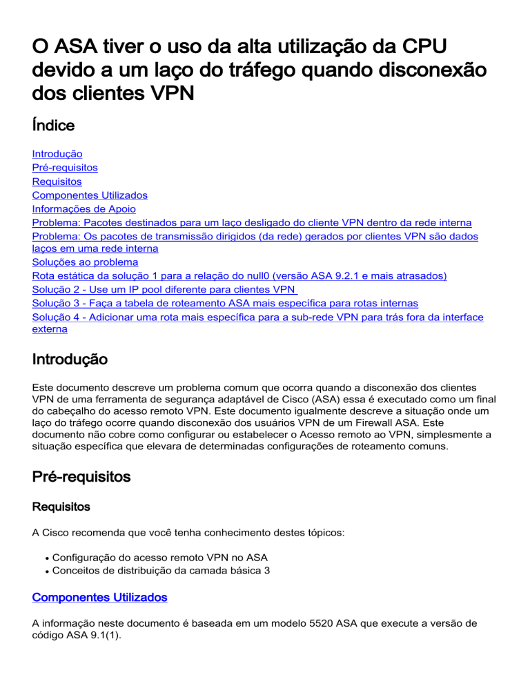 O ASA tiver o uso da alta utilização da CPU devido a um laço do tráfego quando disconexão dos clientes VPN Índice Introdução Pré-requisitos Requisitos Componentes Utilizados Informações de Apoio Problema: Pacotes destinados para um laço desligado do cliente VPN dentro da rede interna Problema: Os pacotes de transmissão dirigidos (da rede) gerados por clientes VPN são dados laços em uma rede interna Soluções ao problema Rota estática da solução 1 para a relação do null0 (versão ASA 9.2.1 e mais atrasados) Solução 2 - Use um IP pool diferente para clientes VPN Solução 3 - Faça a tabela de roteamento ASA mais específica para rotas internas Solução 4 - Adicionar uma rota mais específica para a sub-rede VPN para trás fora da interface externa Introdução Este documento descreve um problema comum que ocorra quando a disconexão dos clientes VPN de uma ferramenta de segurança adaptável de Cisco (ASA) essa é executado como um final do cabeçalho do acesso remoto VPN. Este documento igualmente descreve a situação onde um laço do tráfego ocorre quando disconexão dos usuários VPN de um Firewall ASA. Este documento não cobre como configurar ou estabelecer o Acesso remoto ao VPN, simplesmente a situação específica que elevara de determinadas configurações de roteamento comuns. Pré-requisitos Requisitos A Cisco recomenda que você tenha conhecimento destes tópicos: ● ● Configuração do acesso remoto VPN no ASA Conceitos de distribuição da camada básica 3 Componentes Utilizados A informação neste documento é baseada em um modelo 5520 ASA que execute a versão de código ASA 9.1(1). As informações neste documento foram criadas a partir de dispositivos em um ambiente de laboratório específico. Todos os dispositivos utilizados neste documento foram iniciados com uma configuração (padrão) inicial. Se a sua rede estiver ativa, certifique-se de que entende o impacto potencial de qualquer comando. Produtos Relacionados Este documento pode ser usado com estes versão de hardware e software: ● ● Algum modelo ASA Alguma versão de código ASA Informações de Apoio Quando um usuário conecta ao ASA como um concentrador do acesso remoto VPN, o ASA instala uma rota host-baseada na tabela de roteamento ASA que distribui o tráfego a esse cliente VPN fora da interface externa (para o Internet). Quando as disconexões desse usuário, a rota são removidas da tabela, e os pacotes na rede interna (destinada àquela o usuário desligado VPN) pôde ser dado laços entre o ASA e um dispositivo de roteamento interno. Um outro problema é que os pacotes de transmissão dirigidos (da rede) (gerados pela remoção dos clientes VPN) puderam ser enviados pelo ASA como um frame de unicast para a rede interna. Isto pôde enviá-lo de volta ao ASA, que faz com que o pacote esteja dado laços até que o Time to Live (TTL) expire. Este documento explica estas edições e mostra que técnicas de configuração podem ser usadas a fim impedir o problema. Problema: Pacotes destinados para um laço desligado do cliente VPN dentro da rede interna Quando as disconexões de um usuário do acesso remoto VPN de um Firewall ASA, os pacotes ainda atuais na rede interna (destinada para aqueles usuários desligado) e o endereço do IP atribuído VPN puderam se tornar dados laços dentro da rede interna. Estes loop de pacote puderam fazer com que o USO de CPU no ASA aumente até as paradas de laço ou devido ao valor IP TTL no cabeçalho do pacote IP que decresce a 0, ou o usuário reconecta e o endereço IP de Um ou Mais Servidores Cisco ICM NT é atribuído novamente a um cliente VPN. A fim compreender melhor esta encenação, considere esta topologia: Neste exemplo, o cliente de acesso remoto foi atribuído o endereço IP de Um ou Mais Servidores Cisco ICM NT de 10.255.0.100. O ASA neste exemplo é conectado ao mesmo segmento da rede interna junto com um roteador. O roteador tem duas camadas adicionais 3 segmentos de rede conectados a ela. A interface relevante (roteamento) e as configurações de VPN do ASA e do roteador são mostradas nos exemplos. Os destaques da configuração ASA são mostrados neste exemplo: interface GigabitEthernet0/0 nameif outside security-level 0 ip address 198.51.100.100 255.255.255.0 ! interface GigabitEthernet0/1 nameif inside security-level 100 ip address 10.1.0.1 255.255.255.0 ! same-security-traffic permit intra-interface ! ip local pool VPNpool 10.255.0.1-10.255.0.255 ! route outside 0.0.0.0 0.0.0.0 198.51.100.1 route inside 10.0.0.0 255.0.0.0 10.1.0.2 Os destaques da configuração de roteador são mostrados neste exemplo: interface FastEthernet0 description connected to the inside interface of the ASA G0/1 ip address 10.1.0.2 255.255.255.0 ! interface FastEthernet1 description connected to network segment ip address 10.2.0.1 255.255.255.0 ! interface FastEthernet2 description connected to other network segment ip address 10.3.0.1 255.255.255.0 ! ip route 0.0.0.0 0.0.0.0 10.1.0.1 A tabela de roteamento do roteador conectado ao interior do ASA tem simplesmente uma rota padrão apontada à interface interna ASA de 10.1.0.1. Quando o usuário for conectado através do VPN ao ASA, a tabela de roteamento ASA mostra como segue: ASA# show route Codes: C - connected, S - static, I - IGRP, R - RIP, M - mobile, B - BGP D - EIGRP, EX - EIGRP external, O - OSPF, IA - OSPF inter area N1 - OSPF NSSA external type 1, N2 - OSPF NSSA external type 2 E1 - OSPF external type 1, E2 - OSPF external type 2, E - EGP i - IS-IS, L1 - IS-IS level-1, L2 - IS-IS level-2, ia - IS-IS inter area * - candidate default, U - per-user static route, o - ODR P - periodic downloaded static route Gateway of last resort is 198.51.100.1 to network 0.0.0.0 S 10.255.0.100 255.255.255.255 [1/0] via 198.51.100.1, outside S 10.0.0.0 255.0.0.0 [1/0] via 10.1.0.2, inside C 198.51.100.0 255.255.255.0 is directly connected, outside C 10.1.0.0 255.255.255.0 is directly connected, inside 