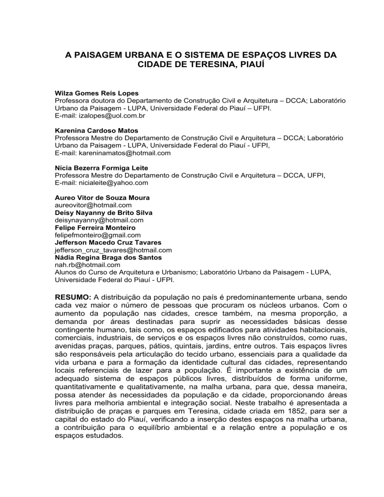 A PAISAGEM URBANA E O SISTEMA DE ESPAÇOS LIVRES DA CIDADE DE TERESINA, PIAUÍ Wilza Gomes Reis Lopes Professora doutora do Departamento de Construção Civil e Arquitetura – DCCA; Laboratório Urbano da Paisagem - LUPA, Universidade Federal do Piauí – UFPI. E-mail: [email protected] Karenina Cardoso Matos Professora Mestre do Departamento de Construção Civil e Arquitetura – DCCA; Laboratório Urbano da Paisagem - LUPA, Universidade Federal do Piauí - UFPI, E-mail: [email protected] Nícia Bezerra Formiga Leite Professora Mestre do Departamento de Construção Civil e Arquitetura – DCCA, UFPI, E-mail: [email protected] Aureo Vitor de Souza Moura [email protected] Deisy Nayanny de Brito Silva [email protected] Felipe Ferreira Monteiro [email protected] Jefferson Macedo Cruz Tavares [email protected] Nádia Regina Braga dos Santos [email protected] Alunos do Curso de Arquitetura e Urbanismo; Laboratório Urbano da Paisagem - LUPA, Universidade Federal do Piauí - UFPI. RESUMO: A distribuição da população no país é predominantemente urbana, sendo cada vez maior o número de pessoas que procuram os núcleos urbanos. Com o aumento da população nas cidades, cresce também, na mesma proporção, a demanda por áreas destinadas para suprir as necessidades básicas desse contingente humano, tais como, os espaços edificados para atividades habitacionais, comerciais, industriais, de serviços e os espaços livres não construídos, como ruas, avenidas praças, parques, pátios, quintais, jardins, entre outros. Tais espaços livres são responsáveis pela articulação do tecido urbano, essenciais para a qualidade da vida urbana e para a formação da identidade cultural das cidades, representando locais referenciais de lazer para a população. É importante a existência de um adequado sistema de espaços públicos livres, distribuídos de forma uniforme, quantitativamente e qualitativamente, na malha urbana, para que, dessa maneira, possa atender às necessidades da população e da cidade, proporcionando áreas livres para melhoria ambiental e integração social. Neste trabalho é apresentada a distribuição de praças e parques em Teresina, cidade criada em 1852, para ser a capital do estado do Piauí, verificando a inserção destes espaços na malha urbana, a contribuição para o equilíbrio ambiental e a relação entre a população e os espaços estudados. Palavras Chave: Cidades, paisagem urbana, espaços livres, praças, parques, qualidade ambiental. URBAN LANDSCAPE AND SYSTEM OF OPEN SPACES OF TERESINA CITY, PIAUÍ ABSTRACT: The population distribution in Brazil is predominantly urban, with an increasing number of people seeking for urban centers. With the increasing population in cities also grows, in the same proportion, the demand for areas designed to meet the basic needs of human assets, such as spaces for housing, commercial and industrial activities, services and open spaces, areas don’t constructed, such as streets, avenues, squares, parks, backyards, gardens and others. Such open spaces are responsible for the articulation of the urban fabric and are essential to the quality of urban life and the formation of cultural identity of cities and representing locations of reference for recreation of population. It is important the existence of an adequate system of open public spaces, distributed uniformly, quantitatively and qualitatively, in the urban area, so that this way they can meet the needs of the population and the city, providing open areas for environmental improvement and social integration. This paper presents the distribution of squares and parks in Teresina, a city created in 1852 to be the capital of the state of Piauí, checking the insertion of spaces in the urban fabric and contribution to the environmental balance and the relationship between people and spaces studied. Keywords: Cities, urban landscape, open spaces, parks, squares, environmental quality. 1. INTRODUÇÃO O intenso processo de urbanização, ocorrido a partir da década de 1970 nas cidades brasileiras, aliado à carência de políticas eficazes de ordenação do espaço urbano, se relacionam a diversos problemas oriundos do crescimento não planejado. A busca pela compreensão da diversidade dos aspectos destes espaços tornou-se uma preocupação para o planejamento e gestão urbana (CAPORUSSO; MATIAS, 2008). Quanto maior a densidade de determinado local, maior é a demanda por áreas livres e pelos benefícios provenientes destes espaços. Embora, muitas vezes, ocorra justamente o contrário, e sejam privilegiadas as áreas menos densas e de maior poder aquisitivo, quando do planejamento dos espaços livres nas cidades (OLIVEIRA; MASCARO, 2007) Com relação às cidades tanto de pequeno porte, quanto as megalópoles Neste sentido, Queiroga e Benfattii (2007, p. 81) afirmam que o “[...] reconhecimento 1 sistêmico do conjunto de espaços livres de cada uma delas constitui entre si, importante fator para a análise diagnóstico, proposição e gestão dos espaços livres, notadamente para os espaços públicos”. Neste contexto os sistemas de espaços livres públicos vem sendo cada vez mais discutidos. Para Costa, et al. (2009), podem até modificar a cidade, pois sejam eles públicos ou privados, permeáveis ou impermeáveis, tem como finalidade a sustentabilidade biofísica e social dos movimentos e as paradas de coisas e pessoas. Os públicos em especial são lugares onde todos podem passar, permanecer, andar e contemplar e estão ligados ao bem-estar individual e coletivo. O sistema de espaços livres pode ser abordado sobre o aspecto da distribuição de áreas para o desenvolvimento de atividades humanas voltadas ao lazer, recreação e práticas esportivas, privilegiando o caráter sócio-cultural destes locais. Ou ainda, numa visão ecossistêmica, em que a principal função dos espaços livres seria a integração de ecossistemas, garantindo a manutenção, r