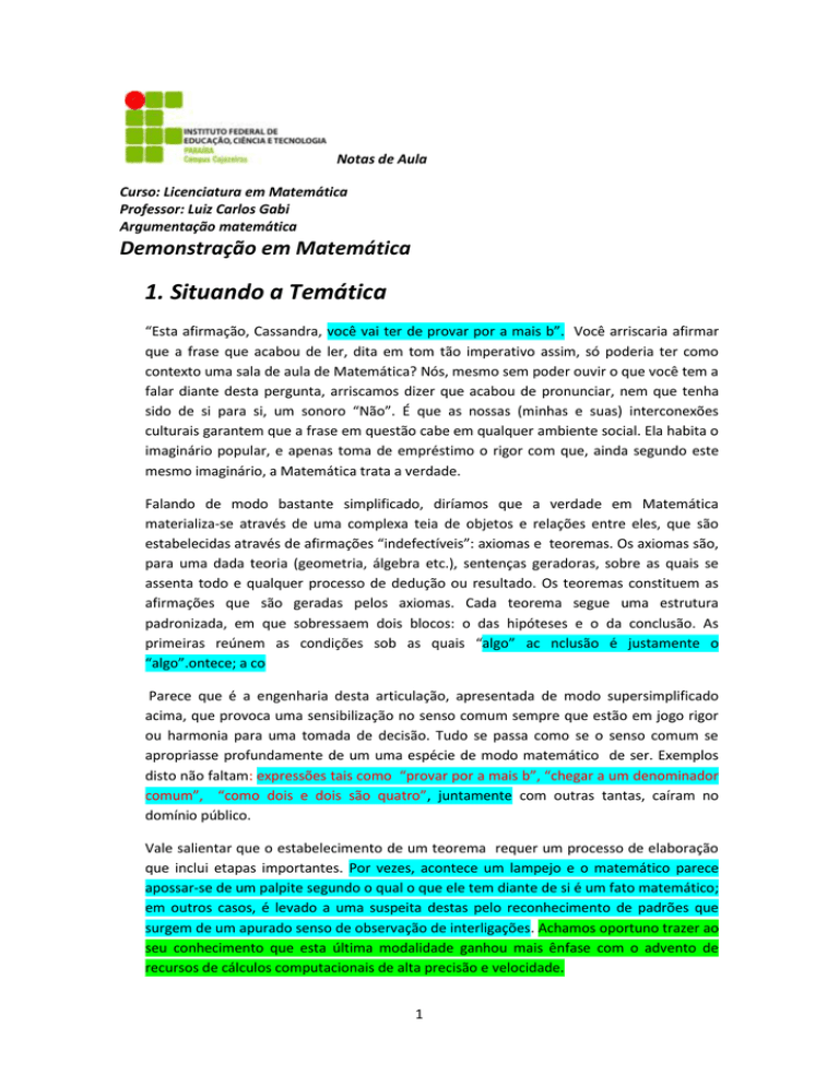 Notas de Aula Curso: Licenciatura em Matemática Professor: Luiz Carlos Gabi Argumentação matemática Demonstração em Matemática 1. Situando a Temática “Esta afirmação, Cassandra, você vai ter de provar por a mais b”. Você arriscaria afirmar que a frase que acabou de ler, dita em tom tão imperativo assim, só poderia ter como contexto uma sala de aula de Matemática? Nós, mesmo sem poder ouvir o que você tem a falar diante desta pergunta, arriscamos dizer que acabou de pronunciar, nem que tenha sido de si para si, um sonoro “Não”. É que as nossas (minhas e suas) interconexões culturais garantem que a frase em questão cabe em qualquer ambiente social. Ela habita o imaginário popular, e apenas toma de empréstimo o rigor com que, ainda segundo este mesmo imaginário, a Matemática trata a verdade. Falando de modo bastante simplificado, diríamos que a verdade em Matemática materializa-se através de uma complexa teia de objetos e relações entre eles, que são estabelecidas através de afirmações “indefectíveis”: axiomas e teoremas. Os axiomas são, para uma dada teoria (geometria, álgebra etc.), sentenças geradoras, sobre as quais se assenta todo e qualquer processo de dedução ou resultado. Os teoremas constituem as afirmações que são geradas pelos axiomas. Cada teorema segue uma estrutura padronizada, em que sobressaem dois blocos: o das hipóteses e o da conclusão. As primeiras reúnem as condições sob as quais “algo” ac nclusão é justamente o “algo”.ontece; a co Parece que é a engenharia desta articulação, apresentada de modo supersimplificado acima, que provoca uma sensibilização no senso comum sempre que estão em jogo rigor ou harmonia para uma tomada de decisão. Tudo se passa como se o senso comum se apropriasse profundamente de um uma espécie de modo matemático de ser. Exemplos disto não faltam: expressões tais como “provar por a mais b”, “chegar a um denominador comum”, “como dois e dois são quatro”, juntamente com outras tantas, caíram no domínio público. Vale salientar que o estabelecimento de um teorema requer um processo de elaboração que inclui etapas importantes. Por vezes, acontece um lampejo e o matemático parece apossar-se de um palpite segundo o qual o que ele tem diante de si é um fato matemático; em outros casos, é levado a uma suspeita destas pelo reconhecimento de padrões que surgem de um apurado senso de observação de interligações. Achamos oportuno trazer ao seu conhecimento que esta última modalidade ganhou mais ênfase com o advento de recursos de cálculos computacionais de alta precisão e velocidade. 1 Enquanto um lampejo e uma suspeita, da maneira como foram descritos acima, não são provados ou refutados estes assumem a condição de uma conjectura. Aquilo que serve para refutar uma conjectura é denominado contra-exemplo, isto é, um exemplo que contradiz a conjectura. 2. Problematizando a Temática A história da Matemática registra o aparecimento de conjecturas que se tornaram mundialmente famosas, quer pela temática envolvida ou pela simplicidade dos seus enunciados. Entre estas, destaca-se a conjectura que por mais de 350 anos ficou conhecida como “O Último Teorema de Fermat”, hoje reverenciada como Teorema de Fermat-Wiles, em homenagem ao matemático britânico Andrew Wiles, que, em 1995, apresentou uma prova deste teorema. Segundo a literatura sobre o tema, por volta do ano 1637, o matemático francês Pierre de Fermat afirmou ter elaborado uma prova cabal e simples (mas que não cabia naquele espaço onde escreveu tal declaração) para o seguinte: “Se 2 > n é um inteiro, então não existem inteiros, não simultaneamente nulos, x , y , e z , que satisfaçam à relação xn + yn = zn. A situação descrita acima deve servir de inspiração para a postura que devemos adotar diante de uma frase declarativa em Matemática. No caso em questão, foram necessários apenas seis passos para Euler derrubar a declaração de Fermat. Portanto, muita prudência e procura por argumentos bem fundados são procedimentos recomendáveis para o trabalho de elaboração de discursos em Matemática. 3. Conhecendo a Temática Para falar sobre demonstração no contexto em questão convém uma palavrinha acerca de um tipo de raciocínio que é vital para a construção de significados em Matemática: o raciocínio dedutivo. Grosso modo, dizemos que o raciocínio dedutivo se caracteriza por possibilitar que se obtenham informações acerca de eventos (situações) específicos a partir de eventos (situações) gerais. Essa versão traz desconforto aos lógicos, pois há raciocínios 2 dedutivos válidos que partem do particular para o geral: “Água potável é insípida. Portanto, existe algo insípido”. De um modo menos informal do que isto, diríamos que o raciocínio dedutivo é empregado na construção de um argumento em que a conclusão é implicação direta de premissas conhecidas. Ou seja, se as premissas são verdadeiras então a conclusão é verdadeira. Este é o tipo de raciocínio que dá sustentação final a boa parte do trabalho desenvolvido por matemáticos. Estes, para se convencerem e se fazerem convencidos por seus pares, recorrem a vários procedimentos: fazem simulações com casos particulares, fazem tentativas para ver até que ponto são confiáveis as conexões entre suas hipóteses e suas conclusões, isto é, até que ponto aquelas podem conduzir a erros; além disso, matemáticos, como já foi dito anteriormente, recorrem inevitavelmente à intuição. Mas, a sua convicção acerca do que se lhe é apresentado como fato matemático só se realiza se o tal fato passa nos testes dos princípios do raciocínio lógico. Isto se dá através de um procedimento a que os matemáticos denominam prova ou demonstração. Quem de vocês já não viu uma prova matemática? Mais do que isto, muitos já realizaram demonstrações. Vamos dedicar um ol