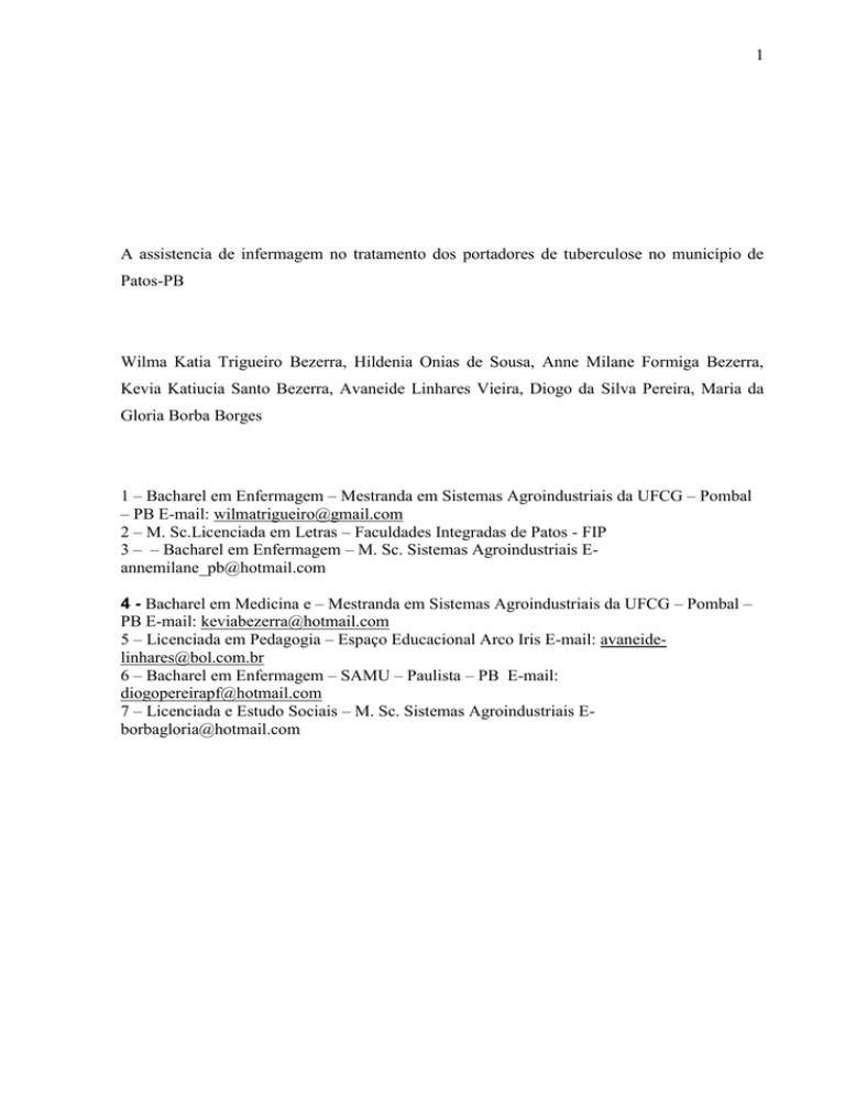 1 A assistencia de infermagem no tratamento dos portadores de tuberculose no município de Patos-PB Wilma Katia Trigueiro Bezerra, Hildenia Onias de Sousa, Anne Milane Formiga Bezerra, Kevia Katiucia Santo Bezerra, Avaneide Linhares Vieira, Diogo da Silva Pereira, Maria da Gloria Borba Borges 1 – Bacharel em Enfermagem – Mestranda em Sistemas Agroindustriais da UFCG – Pombal – PB E-mail: [email protected] 2 – M. Sc.Licenciada em Letras – Faculdades Integradas de Patos - FIP 3 – – Bacharel em Enfermagem – M. Sc. Sistemas Agroindustriais [email protected] 4 - Bacharel em Medicina e – Mestranda em Sistemas Agroindustriais da UFCG – Pombal – PB E-mail: [email protected] 5 – Licenciada em Pedagogia – Espaço Educacional Arco Iris E-mail: [email protected] 6 – Bacharel em Enfermagem – SAMU – Paulista – PB E-mail: [email protected] 7 – Licenciada e Estudo Sociais – M. Sc. Sistemas Agroindustriais [email protected] 2 JOÃO PESSOA-PB 2013 WILMA KÁTIA TRIGUEIRO BEZERRA ATUAÇÃO DO ENFERMEIRO NO TRATAMENTO DOS PORTADORES DE TUBERCULOSE NO MUNICÍPIO DE PATOS-PB Trabalho de conclusão do Curso de Especialização apresentado às Faculdades Integradas de Patos – FIP, como requisito para obtenção do título de Especialista em Saúde da Família. ORIENTADOR(A): Ms. HILDÊNIA ONIAS DE SOUSA 3 JOÃO PESSOA-PB 2013 RESUMO Tuberculose é uma doença infecto-contagiosa, na qual sua prevalência está associada ao desemprego, baixo grau de escolaridade, alimentação deficiente e insuficiente, habitação insolubre e a outros fatores associados à pobreza. Entretanto no Brasil apesar dos esforços do Ministério da saúde para o controle, persiste como grave problema de saúde pública. O presente estudo consiste numa pesquisa exploratória de natureza descritiva e abordagem quantiqualitativa que teve como objetivo investigar a adesão ao tratamento dos portadores de tuberculose através da ação do profissional de enfermagem no município de Patos-PB. A amostra foi realizada com catorze enfermeiros atuantes na USF, no período de agosto e setembro de dois mil e treze. Os dados foram coletados através de um questionário contendo quinze questões objetivas e subjetivas, com vista a alcançar o objetivo proposto para o estudo. A analise foi realizada através de tabelas e gráficos. Traçado o perfil da amostra entrevistada de acordo com: o gênero, faixa etária, nível de formação profissional e tempo de atuação na USF, no entanto ficou evidenciado que a maioria dos enfermeiros atuantes estão na faixa etária de 21 a 30 anos com (86%), do sexo feminino (79%), nível de formação em especialização com (57%) e tempo de atuação na USF (79%) entre 1 e 5. Os resultados revelaram que os enfermeiros possuem uma atuação presente na adesão ao tratamento através de ações de educação em saúde e investigação dos efeitos colaterais com os usuários assistidos. A referida pesquisa tem singular importância, pois a mesma poderá subsidiar pesquisadores interessados pelo tema e assim ampliar o nível de conhecimento sobre a adesão ao tratamento dos portadores de tuberculose. Palavras-chaves: Tuberculose. Adesão. Ações. Enfermagem. 4 ABSTRACT Tuberculosis is a infectum-contagious illness, in which its prevalence is associated with the unemployment, low degree of education, deficient and insufficient feeding, terrible habitation and to other factors associates to poverty. However in Brazil despite the efforts of the Health department for the control, it persists as serious problem of health publishes. The present study it consists of a exploratory research of descriptive nature wiyh quantiqualitative and qualitative boarding that had as objective to investigate the adhesion to the treatment of the tuberculosis carriers through the action of the nursing professional in Patos city - PB. The sample was carried through with fourteen operating nurses in the Unit of Family's Health, the period of August to September of 2013. The data had been collected through a questionnaire contend fifteen objective and subjective questions, with sight to reach the objective considered for the study. It analyzes it was carried through graphical tables and traced the profile of the interviewed sample in accordance with: the sort, the age, level of professional formation and time of performance in the UFHs, however were evidenced that the majority of the operating nurses with 21 to the 30 (86%), of the feminine sex (79%), level of formation in specialization (57%) and time of performance in the UFHs (79%) between 1 to 5. The results had disclosed that the nurses possess a present performance in the adhesion to the treatment through action of education in health and inquiry of the collateral effect with the attended users. The related research has singular importance, therefore the same one will be able to subsidize researchers interested for the subject and thus to extend the knowledge level on the adhesion to the treatment of the tuberculosis carriers. Keywords: Tuberculosis. Adhesion. Action. Nursing. 5 LISTA DE TABELAS Tabela 1 - Caracterização da amostra por gênero e faixa etária 23 Tabela 2 - Caracterização da amostra por nível de formação e tempo de atuação no 24 Tabela 3 - Distribuição dos casos confirmados de tuberculose na área de atuação a formação pela qual acompanha o tratamento 29 Tabela,4 - Distribuição das informações e orientações priorizadas durante o atendimento aos portadores de tuberculose 33 6 LISTA DE ILUSTRAÇÕES Gráfico 1 - Distribuição da realização de atividade de prevenção de tuberculose com os usuários 25 Gráfico 2 - Distribuição dos usuários com suspeita de tuberculose que procuram o serviço para confirmar o diagnóstico 26 Gráfico 3 - Distribuição da marcação de consultas de retorno com os usuários suspeitos ou portadores de tuberculose 27 Gráfico - 4 Distribuição da realização da busca ativa na á