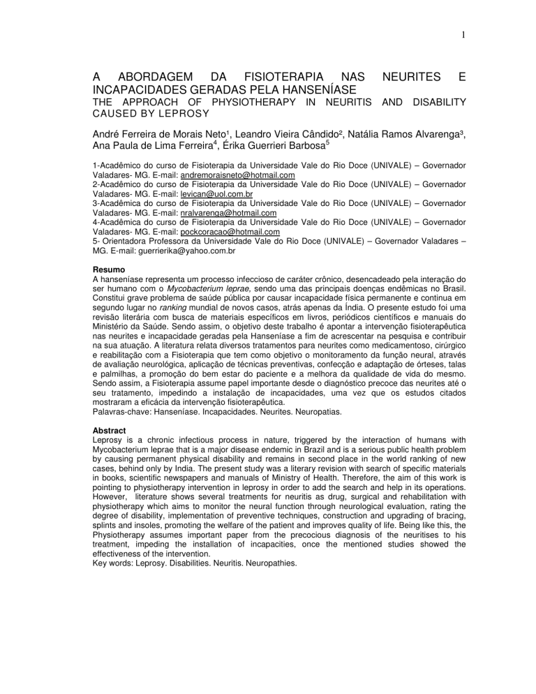 1 A ABORDAGEM DA FISIOTERAPIA NAS INCAPACIDADES GERADAS PELA HANSENÍASE THE APPROACH OF PHYSIOTHERAPY CAUSED BY LEPROSY IN NEURITIS NEURITES AND E DISABILITY André Ferreira de Morais Neto¹, Leandro Vieira Cândido², Natália Ramos Alvarenga³, Ana Paula de Lima Ferreira4, Érika Guerrieri Barbosa5 1-Acadêmico do curso de Fisioterapia da Universidade Valadares- MG. E-mail: [email protected] 2-Acadêmico do curso de Fisioterapia da Universidade Valadares- MG. E-mail: [email protected] 3-Acadêmica do curso de Fisioterapia da Universidade Valadares- MG. E-mail: [email protected] 4-Acadêmica do curso de Fisioterapia da Universidade Valadares- MG. E-mail: [email protected] 5- Orientadora Professora da Universidade Vale do Rio MG. E-mail: [email protected] Vale do Rio Doce (UNIVALE) – Governador Vale do Rio Doce (UNIVALE) – Governador Vale do Rio Doce (UNIVALE) – Governador Vale do Rio Doce (UNIVALE) – Governador Doce (UNIVALE) – Governador Valadares – Resumo A hanseníase representa um processo infeccioso de caráter crônico, desencadeado pela interação do ser humano com o Mycobacterium leprae, sendo uma das principais doenças endêmicas no Brasil. Constitui grave problema de saúde pública por causar incapacidade física permanente e continua em segundo lugar no ranking mundial de novos casos, atrás apenas da Índia. O presente estudo foi uma revisão literária com busca de materiais específicos em livros, periódicos científicos e manuais do Ministério da Saúde. Sendo assim, o objetivo deste trabalho é apontar a intervenção fisioterapêutica nas neurites e incapacidade geradas pela Hanseníase a fim de acrescentar na pesquisa e contribuir na sua atuação. A literatura relata diversos tratamentos para neurites como medicamentoso, cirúrgico e reabilitação com a Fisioterapia que tem como objetivo o monitoramento da função neural, através de avaliação neurológica, aplicação de técnicas preventivas, confecção e adaptação de órteses, talas e palmilhas, a promoção do bem estar do paciente e a melhora da qualidade de vida do mesmo. Sendo assim, a Fisioterapia assume papel importante desde o diagnóstico precoce das neurites até o seu tratamento, impedindo a instalação de incapacidades, uma vez que os estudos citados mostraram a eficácia da intervenção fisioterapêutica. Palavras-chave: Hanseníase. Incapacidades. Neurites. Neuropatias. Abstract Leprosy is a chronic infectious process in nature, triggered by the interaction of humans with Mycobacterium leprae that is a major disease endemic in Brazil and is a serious public health problem by causing permanent physical disability and remains in second place in the world ranking of new cases, behind only by India. The present study was a literary revision with search of specific materials in books, scientific newspapers and manuals of Ministry of Health. Therefore, the aim of this work is pointing to physiotherapy intervention in leprosy in order to add the search and help in its operations. However, literature shows several treatments for neuritis as drug, surgical and rehabilitation with physiotherapy which aims to monitor the neural function through neurological evaluation, rating the degree of disability, implementation of preventive techniques, construction and upgrading of bracing, splints and insoles, promoting the welfare of the patient and improves quality of life. Being like this, the Physiotherapy assumes important paper from the precocious diagnosis of the neuritises to his treatment, impeding the installation of incapacities, once the mentioned studies showed the effectiveness of the intervention. Key words: Leprosy. Disabilities. Neuritis. Neuropathies. 2 dos casos no continente americano e continua 1. Introdução em segundo lugar no ranking mundial de novos Hanseníase é doença endêmica no casos, atrás apenas da Índia (MACHADO, 2008). Brasil e constitui grave problema de saúde A hanseníase representa um processo pública por causar incapacidade física infeccioso de caráter crônico, desencadeado permanente e apresentar altos níveis endêmicos pela com distribuição variada nas diferentes regiões, Mycobacterium leprae o qual possui afinidade fatores que geram dificuldades para o seu por células do tecido cutâneo e de nervos controle periféricos, tendo como principal alvo as células epidemiológico (MINISTÉRIO DA SAÚDE, 2005). interação do ser humano com o de Schwann. Apesar de ter elevada infectividade, Atualmente, casos mas baixa patogenicidade e elevado potencial de concentram-se em países localizados na faixa deformidades durante a sua história natural e intertropical: Índia; Brasil; Myamar; Madagascar; inegáveis avanços das ações de controle, ainda Nepal; e Moçambique. Alguns trabalhos de hoje persiste como um importante problema a geografia médica da hanseníase discutem o ser papel da história da ocupação dos territórios demandando estratégias e metas mais realistas como fundamento da manutenção de focos da para o seu controle (CAMPOS et al, 2005; doença. Por outro lado, geralmente, é aceita a RIBEIRO et al 2007 e MARQUES, MOREIRA e associação ALMEIDA, 2003). da 80% dos hanseníase novos com condições desfavoráveis de vida, considerando-se fatores enfrentado no Brasil e no mundo A transmissão do bacilo ocorre através econômicos, higiênico-sanitários e biológicos do (MAGALHAES e ROJAS, 2007). portadora do bacilo de Hansen não tratado, o No Brasil, observou-se na década de contato direto com a pessoa doente, qual o elimina para o meio disseminando a 1980 um aumento crescente no total de casos infecção. notificados do poliquimioterapia, o paciente deixa de ser fonte coeficiente de detecção foi de 1,4 casos de eliminação dos bacilos, pois a utilização das novos/10.000 habitantes no período de 1982 a primeiras doses do medicamento bloqueia os 1987. Nos anos seguintes, o coeficiente de bacilos, não permitindo a infecç
