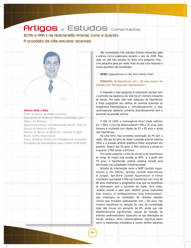Artigos Estudos e Comentados IECAS e ARA II na Hipertensão Arterial. Como e Quando. A propósito de três estudos recentes. São comentados três estudos clínicos relevantes para a prática clínica publicados durante o ano de 2008. Para cada um dos três estudos foi feita uma pergunta. Mas... uma pergunta gera por vezes mais do que uma resposta e novas questões são levantadas. HYVET (Hypertension in the Very Elderly Trial)1 PERGUNTA: Os hipertensos com ≥ 80 anos devem ser tratados com fármacos anti-hipertensores ? A resposta a esta pergunta é importante porque com o aumento da esperança de vida há um número crescente de idosos. Por outro lado este subgrupo de hipertensos é mais susceptível aos efeitos de eventos adversos da terapêutica farmacológica e, simultâneamente, o risco cardiovascular absoluto aumenta dramáticamente com o aumento da pressão arterial. Alberto Melo e Silva Chefe de Serviço de Medicina Interna. Especialista em Medicina Interna e Cardiologia, pela Ordem dos Médicos. Especialista Europeu em Hipertensão Arterial. Chefe de Serviço de Medicina Interna. Director do Serviço de Medicina I, Hospital de Egas Moniz, Centro Hospitalar de Lisboa Ocidental (CHLO). Vice-Presidente da Sociedade Portuguesa de Aterosclerose para o triénio 2006-2009. O QUE SE SABE: o Framingham Heart Study estimou em > 90% o risco de desenvolverem HTA a 20 anos, para homens e mulheres com idades de 55 a 65 anos e ainda não hipertensos. Há uma forte mas complexa associação da PA com a idade. Até aos 50 anos de idade a pressão arterial sistólica (PAS) e a pressão arterial diastólica (PAD) aumentam em paralelo. Depois dos 50 anos, a PAS continua a elevar-se enquanto a PAD tende a diminuir. Por outras palavras, o risco de virmos a ser hipertensos ao longo da nossa vida excede os 90%, e, a partir dos 70 anos, a hipertensão arterial sistólica isolada será dominante nas sociedades industrializadas! Estudos de intervenção como o SHEP (Systolic Systolic Hyper Hypertension in the Elderly), Syst-Eur (Systolic Hypertension in Europe), Syst-China (Systolic Hypertension in China) mostraram que baixar a PAS nos hipertensos com mais de 60 anos melhorava o prognóstico mas que os benefícios se atenuavam com o aumento da idade. Uma meta-análise levada a cabo pelo INDANA group (Individual Data Analysis of Antihypertensive Drug Interventions)2, que investigou os resultados de diversos estudos clínicos que incluiram participantes com ≥ 80 anos, não mostrou benefícios na redução do risco da mortalidade total (até houve um aumento de 6% ainda que não estatísticamente significativo), apesar da redução de eventos cardiovasculares. Especulou-se que alterações da função cardíaca, renal, barorreceptores, cognitiva assim como a hipotensão ortostática e outros efeitos adversos 84 Revista Factores de Risco, Nº13 ABR-JUN 2009 Pág. 84-88 principal (AVC fatal ou não-fatal) foi reduzido em 30% no grupo sob terapêutica activa, embora este resultado não tenha atingido significância estatística. Por outras palavras, são prevenidos onze AVC (95% CI 0-21) por 1000 doentes tratados durante dois anos ou um AVC é prevenido por 94 doentes tratados durante um ano. O NNT (nº necessário tratar) de 40 para prevenir uma morte em dois anos é mais expressivo. frequentes nos idosos pela polimedicação que aumenta os riscos de interacções medicamentosas, iriam neutralizar os potenciais efeitos benéficos decorrentes da terapêutica anti-hipertensiva. RESPOSTA: HYVET (Hypertension in the Very Elderly Trial): - estudo multicêntrico, aleatorizado, duplamento cego. - 3845 hipertensos com ≥80 anos com PAS mantida ≥160 mm Hg. - aleatorização para dois grupos de tratamento: 1) placebo (n=1912); 2) tratamento activo (n=1933) com o diurético (D) de libertação prolongada indapamida (1.5 mg). O inibidor da enzima de conversão (IECA) perindopril (2 ou 4 mg), podia ser associado para atingir uma PA alvo de 150/80 mm Hg. - objectivo primário: AVC fatal ou não-fatal. - no início do estudo, os grupo placebo e terapêutica activa estavam bem emparelhados, com uma média de idades de 83.6 anos e uma pressão arterial média, na posição sentado, de 173.0/90.8 mm Hg. Só 11.8% tinham história de doença cardiovascular. - aos dois anos a diferença da PA na posição sentado nos grupos terapêutica activa vs placebo foi de 15.0/6.1 mm Hg, para a pressão arterial sistólica e diastólica respectivamente. - o valor alvo da PA foi atingido em 19.9% do grupo placebo e em 48.0% do grupo sob terapêutica activa, uma diferença estatísticamente significativa. - apesar de um bom controlo da PA, não parece ter ocorrido o chamado efeito da curva-J, o que confere tranquilidade aquando da necessidade de terapêutica anti-hipertensora agressiva numa população de hipertensos idosos como a da população em estudo. - os resultados mostraram que o grupo sob tratamento activo comparado com o grupo placebo tiveram uma redução do risco relativo de mortalidade total em 21% (p=0,02), de 64% (p<0,001) para a insuficiência cardíaca e de 30% para o AVC. - registaram-se menos eventos adversos no grupo sob tratamento activo comparado com o grupo placebo (358 versus 448, respectivamente), atestando uma boa tolerabilidade dos fármacos estudados. - a diminuição nas taxas de mortalidade total e insuficiência cardíaca fatal ou não-fatal, foram registadas em média após 1.8 anos de seguimento. - numa análise de intenção-de-tratar, o objectivo Os resultados do HYVET atestam que a terapêutica anti-hipertensiva com o D de libertação prolongada indapamida, associada ou não ao IECA perindopril, reduz significativamente o AVC fatal, a mortalidade total e a insuficiência cardíaca em pessoas ≥80 anos, ainda que o objectivo principal, AVC fatal e não fatal, não tenha atingido significância estatística. Figura 1 Na análise de intenção de tratar, o tratamento activo associou-se a uma redução